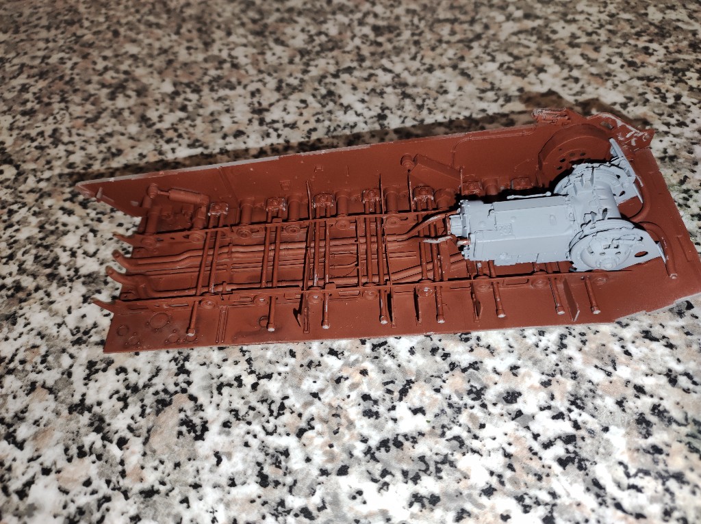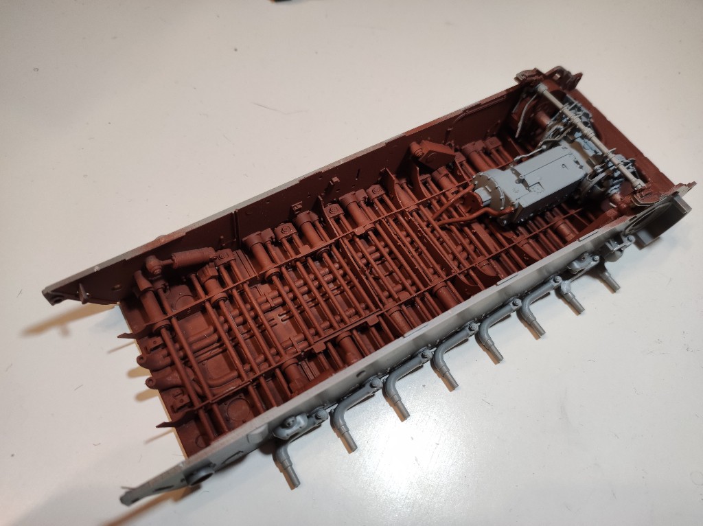 Inzwischen ist ein Teil des Innenlebens lackiert. Dank der neuen 3rd Generation Farben von AK kann man kleine Sachen mit dem selben Farbbild wie aus der Pistole sprühen bzw malen. Heute sollten dann erstmal das Getriebe befestigen und die Achsen vom Panzer angebracht werden