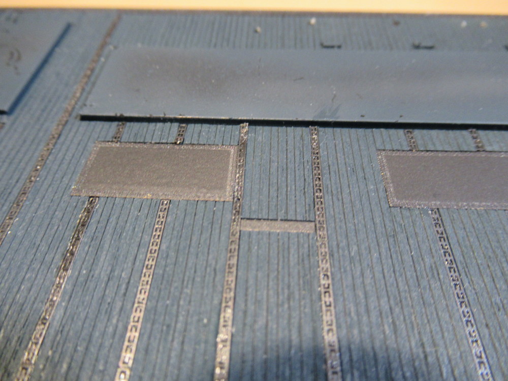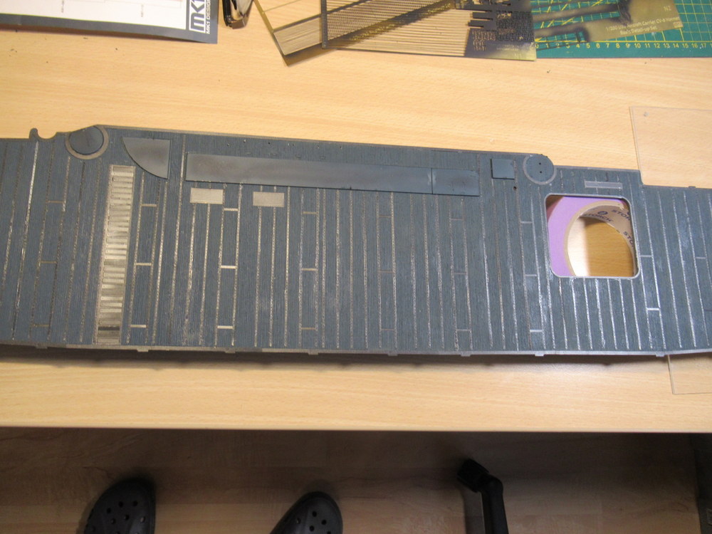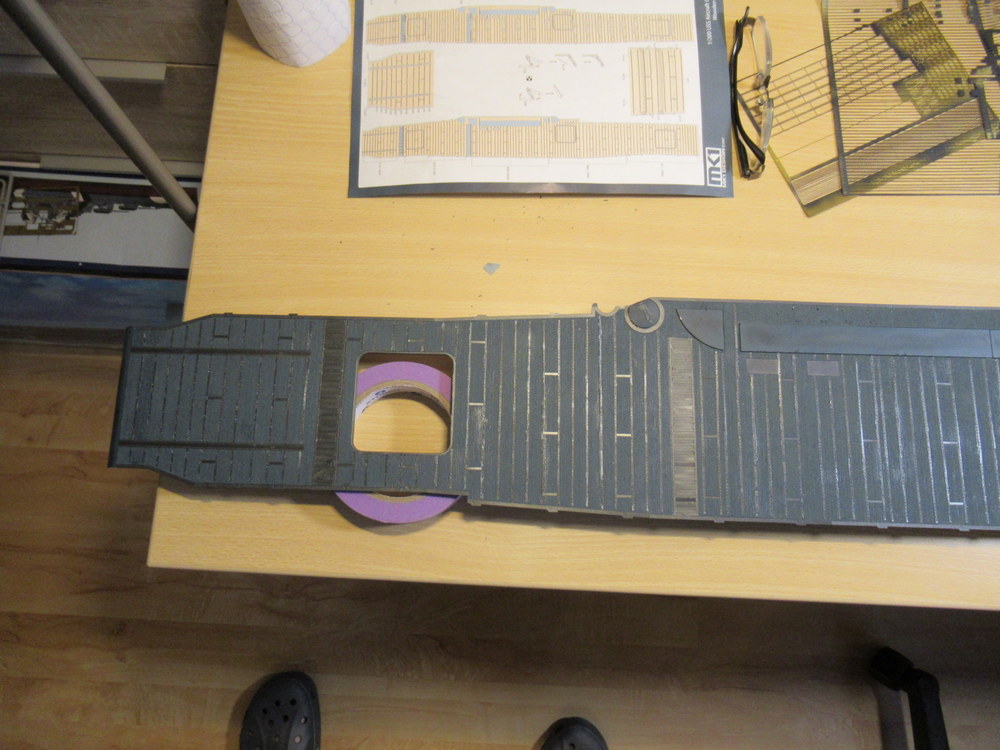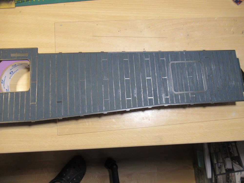Auf die Oberseite musste das selbstklebende Holzdeck aufgebracht werden . Das war nicht sehr einfach , da der Bausatz ja schon älter ist . Das Zubehör somit auch und so ein Holzdeck ist da wohl nicht so Glücklich wenn es ewig in der Verpackung liegt .