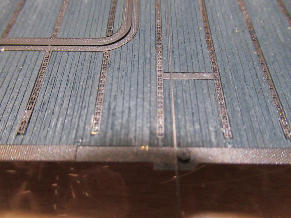 Hierfür müssen dann Streifen aus dem Holzdeck wieder entfernt werden um die Stahlschienen einzukleben .