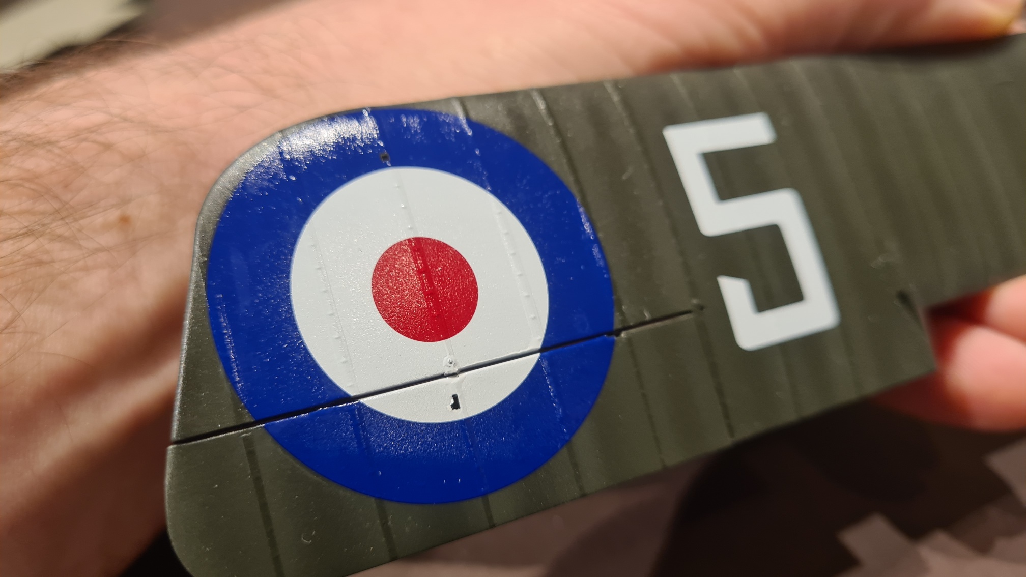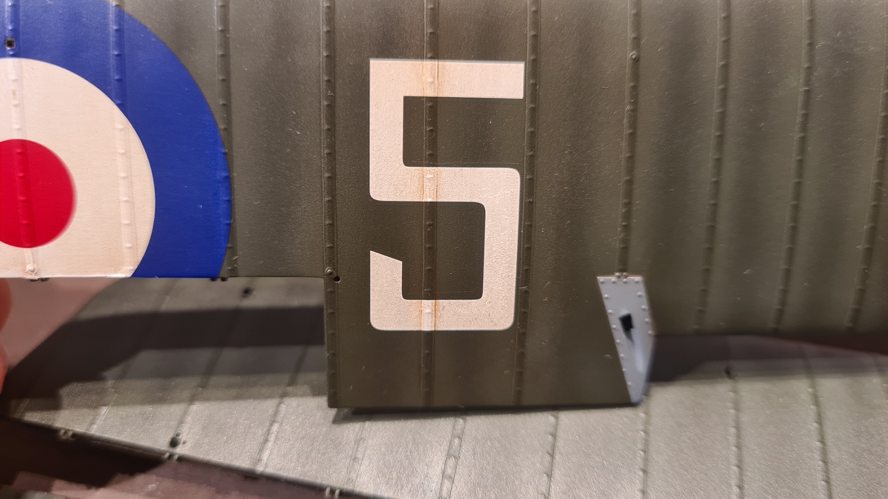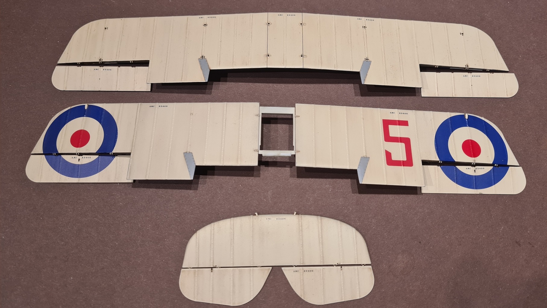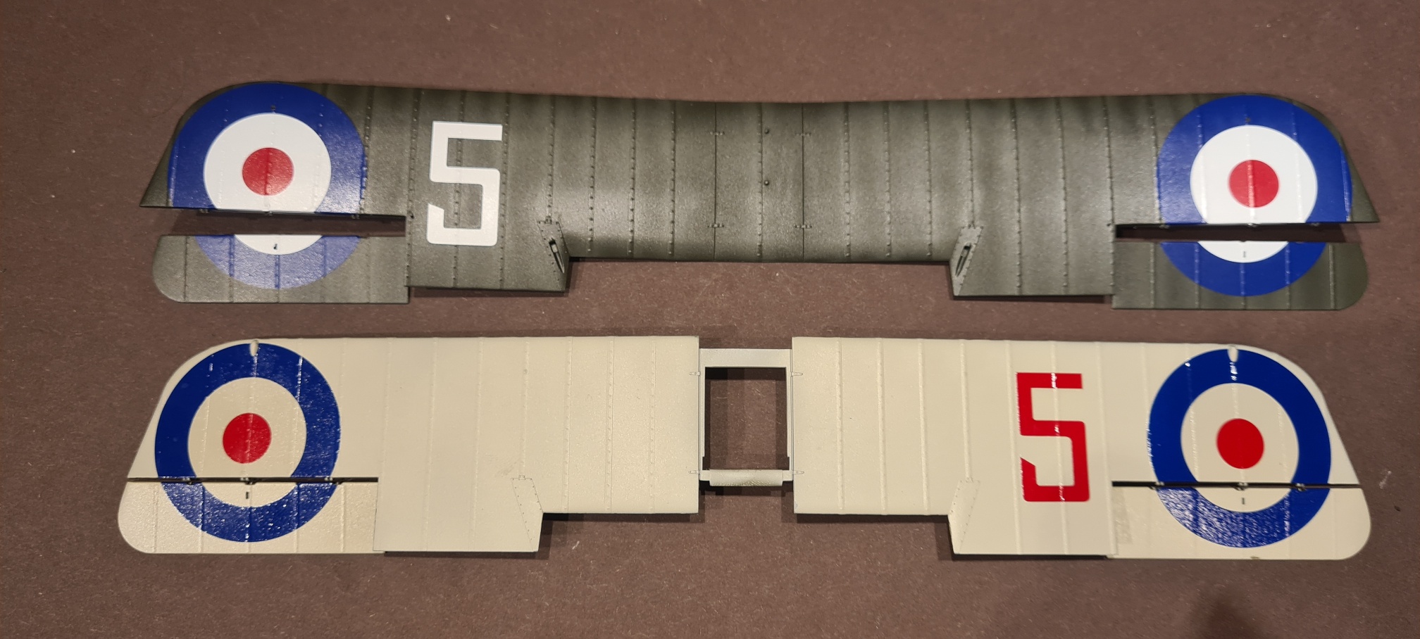 Aber dann kam die Unterseite des unteren Flügels und da hat komischerweise das Decal auf dem Querruder ein Löchlein überdeckt. Naja, linkes Querruder lag dem Bausatz doppelt dabei, rechtes Querruder ebenfalls. Hab auch immer aufgepasst, die Querruder der oberen und unteren Tragfläche nicht zu vertauschen. Jetzt kommt das ABER: bei der unteren Tragfläche habe ich linkes und rechtes Querruder vertauscht. Sprich, die Teile wurden auch falsch lackiert.