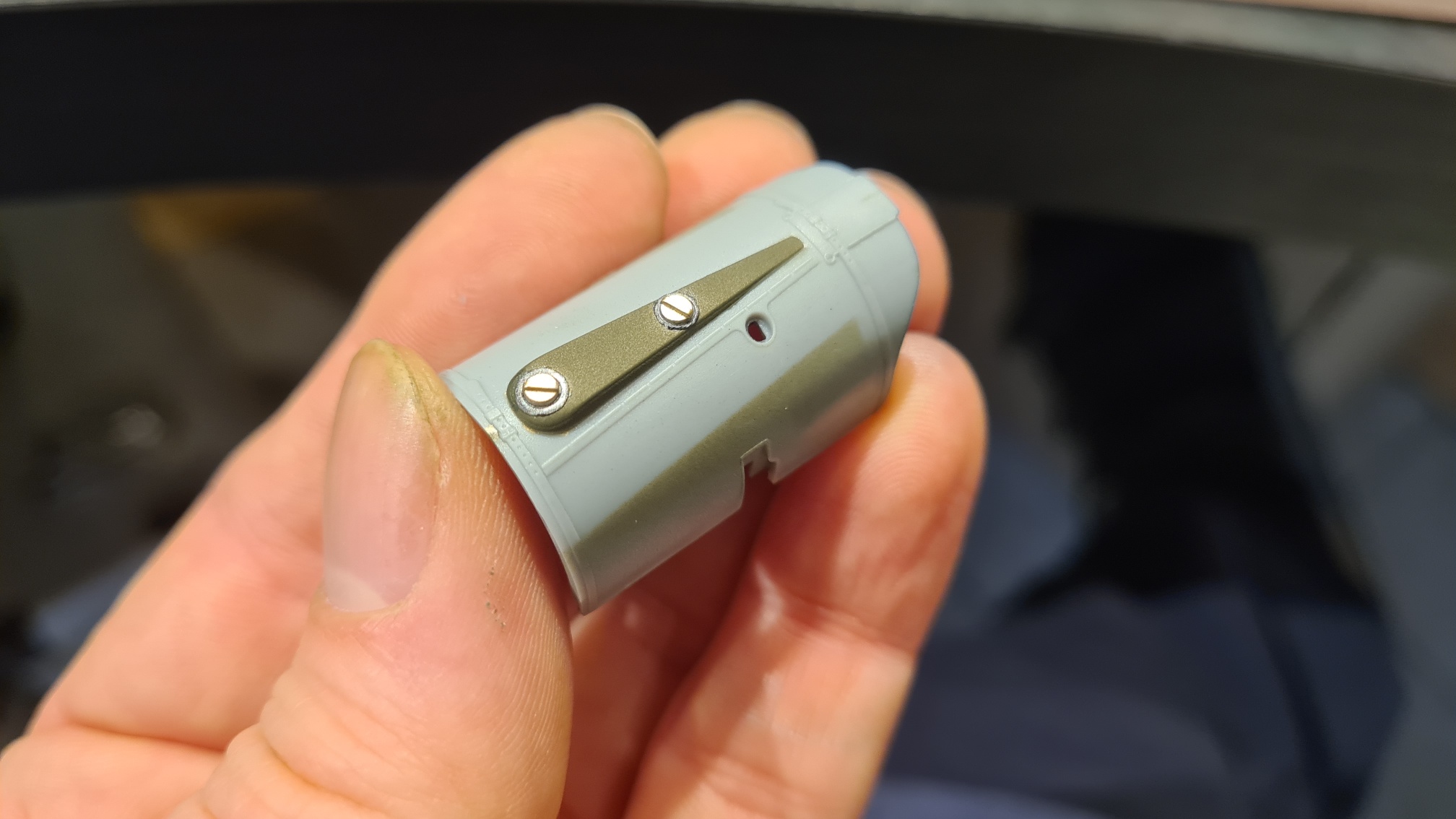 Danach mit der Zielfarbe Tamiya XF-62, etwas aufgehellt durch Hell Grau XF-16, dünn übersprüht, damit das Metallene leicht durchscheint. Den Unterschied kann man auf den Fotos leider nicht kaum erkennen.