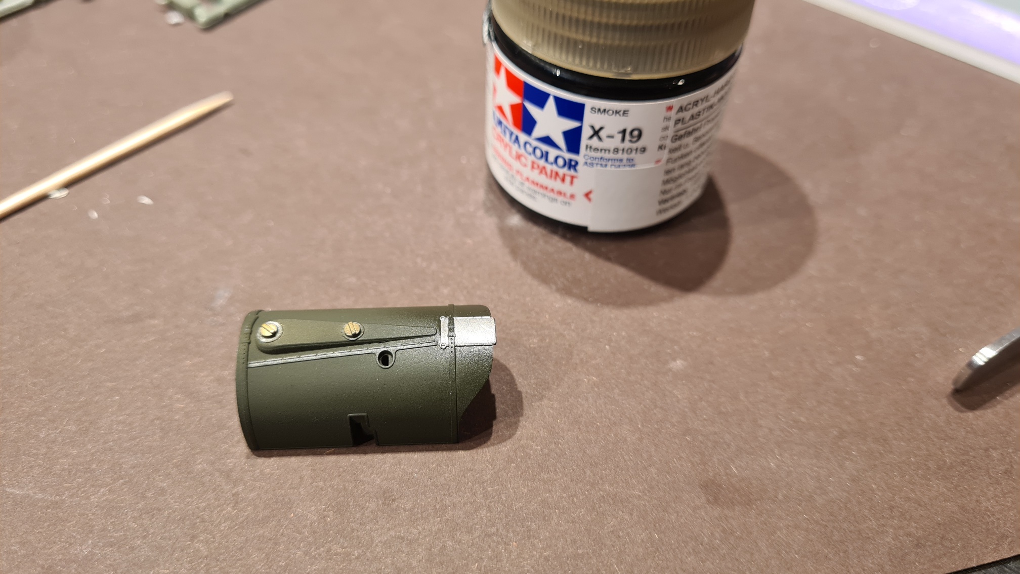 Wenn das Teil gut durchgetrocknet ist, wird das eintönige Grün mit Ölfarben etwas aufgebrochen. Auch sollen leichte Treibstoffreste und Ölreste an den Tankdeckeln erscheinen. Auch hierfür brauchte ich die Klarlackschicht auf dem kompletten Bauteil. Aber das dauert noch.