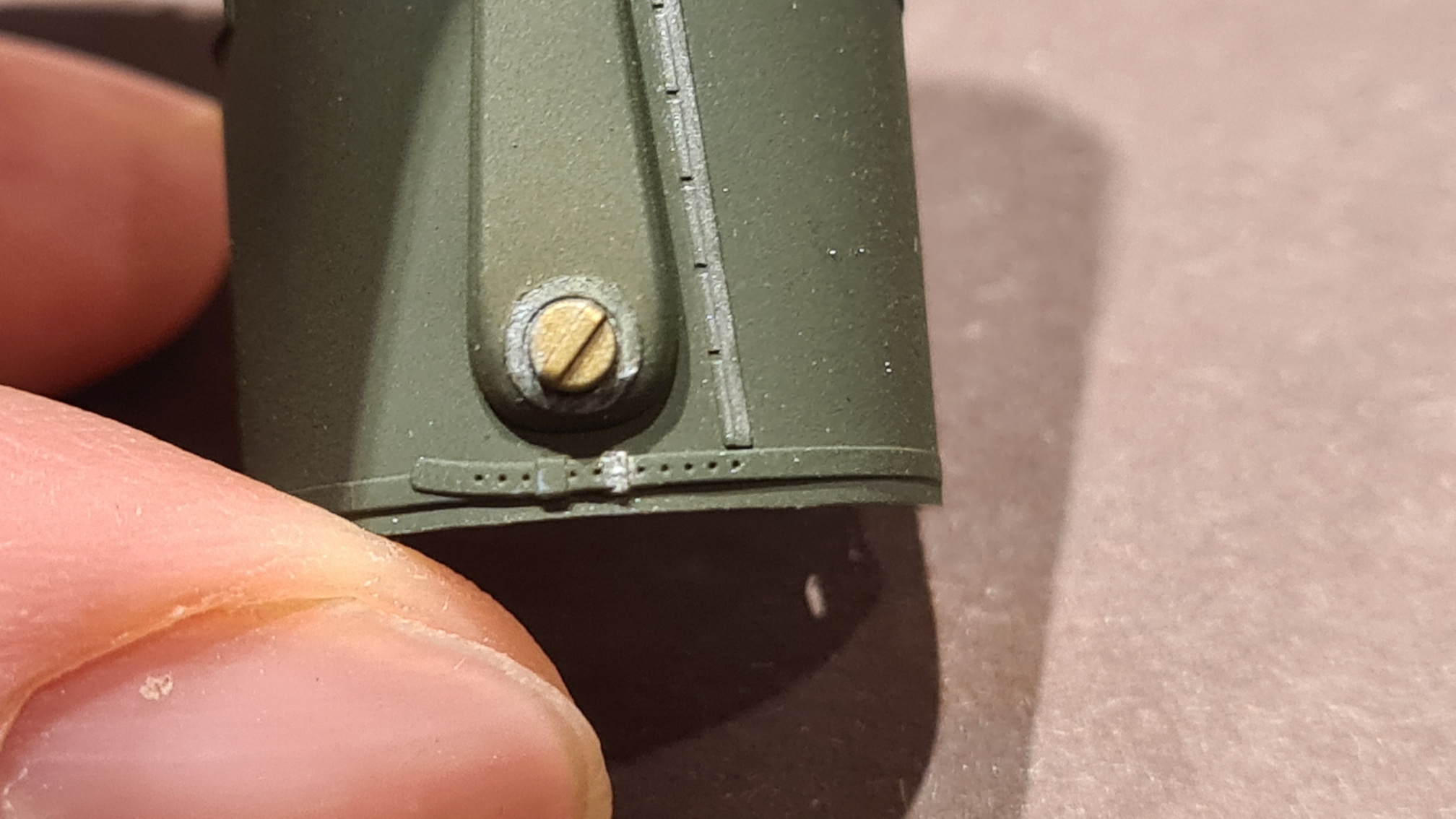 Da die Klappe etwas zu sehr gestrahlt hat, hab ich den Effekt mit Tamiya smoke etwas abgedämpft. Das Scharnier quer über die ganze Breite wurde trockengebürstet. Das macht keinen wesentlichen Unterschied, ob da nun schwarz oder oliv-grün drunter ist.