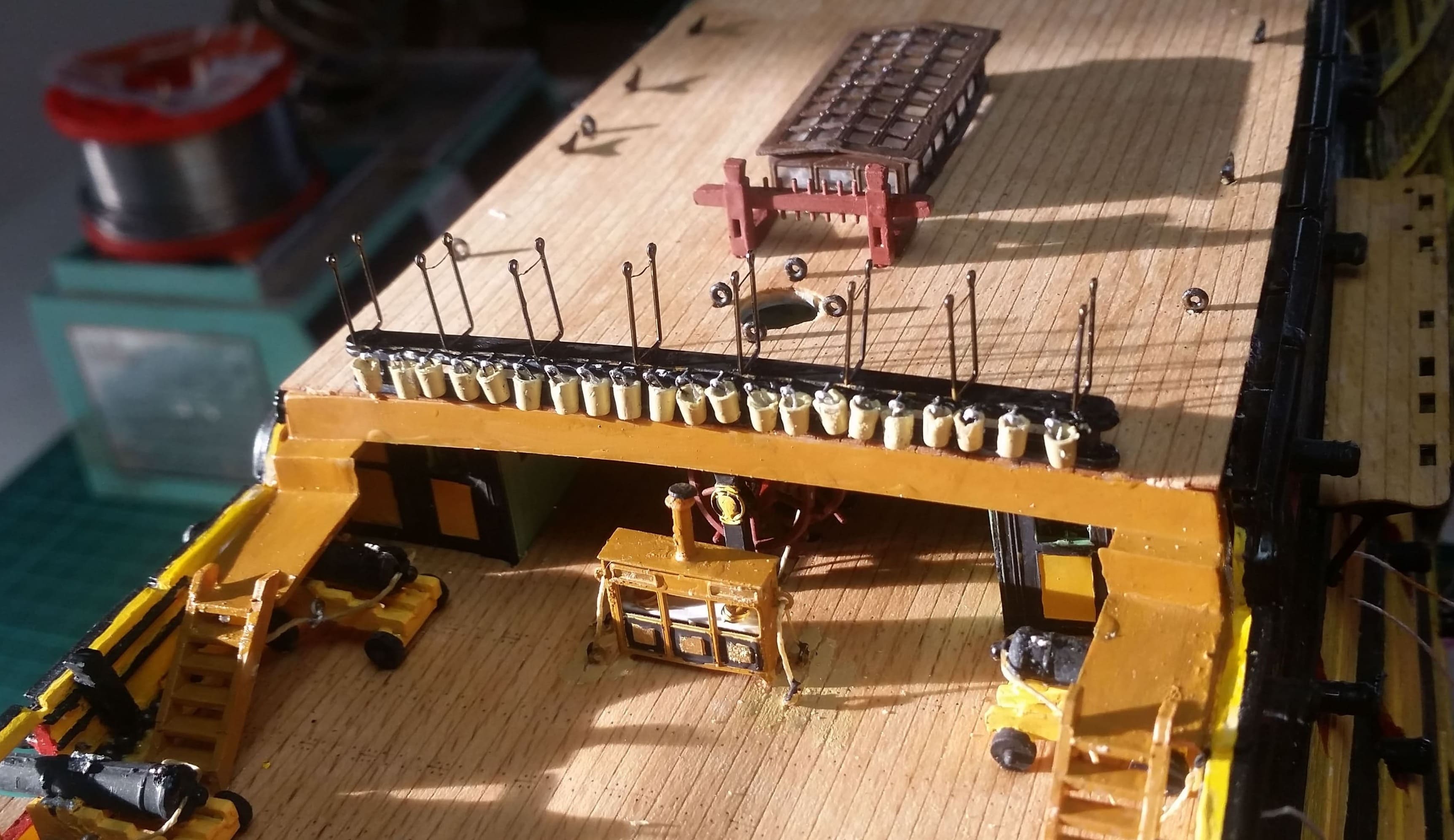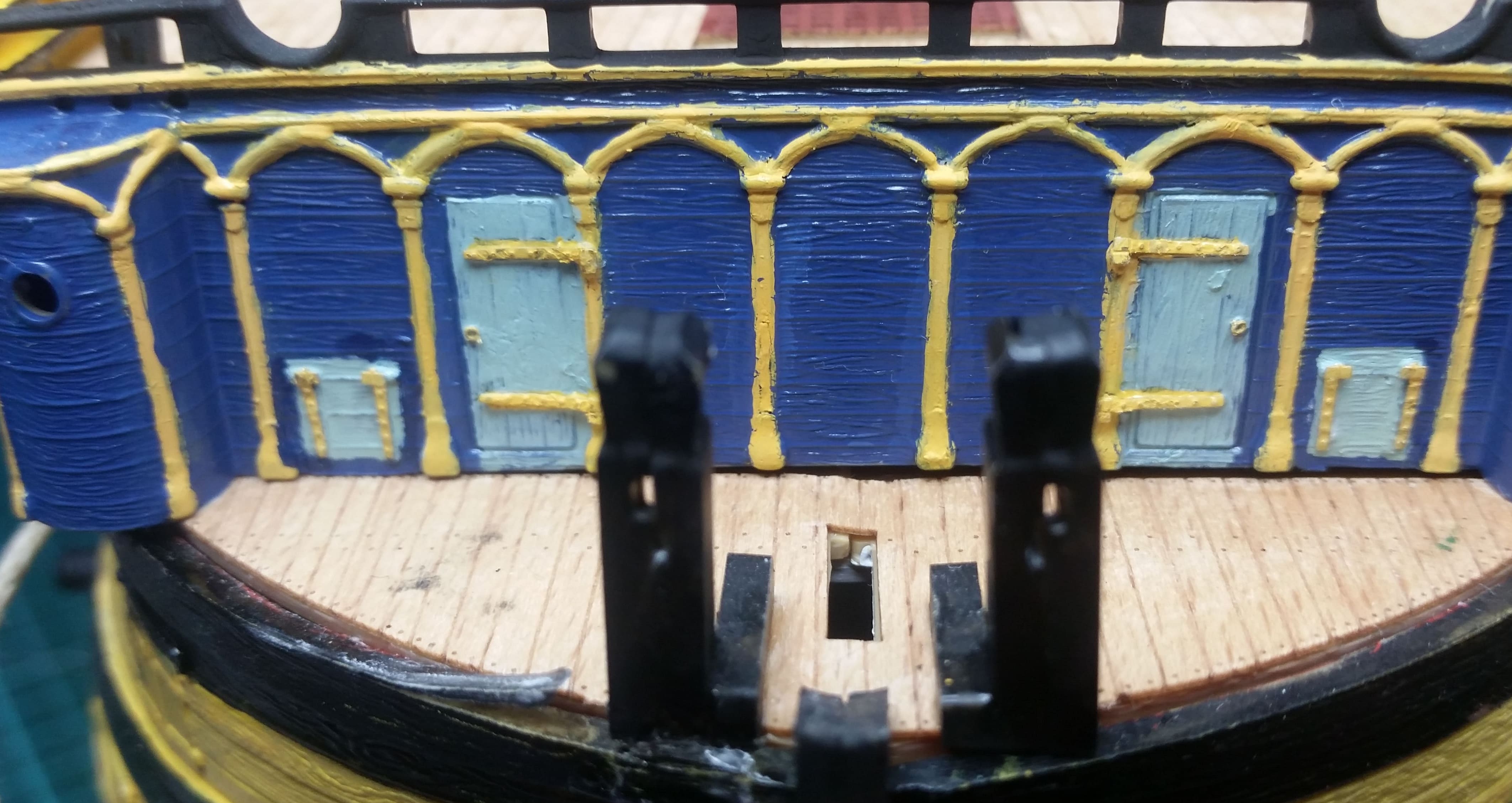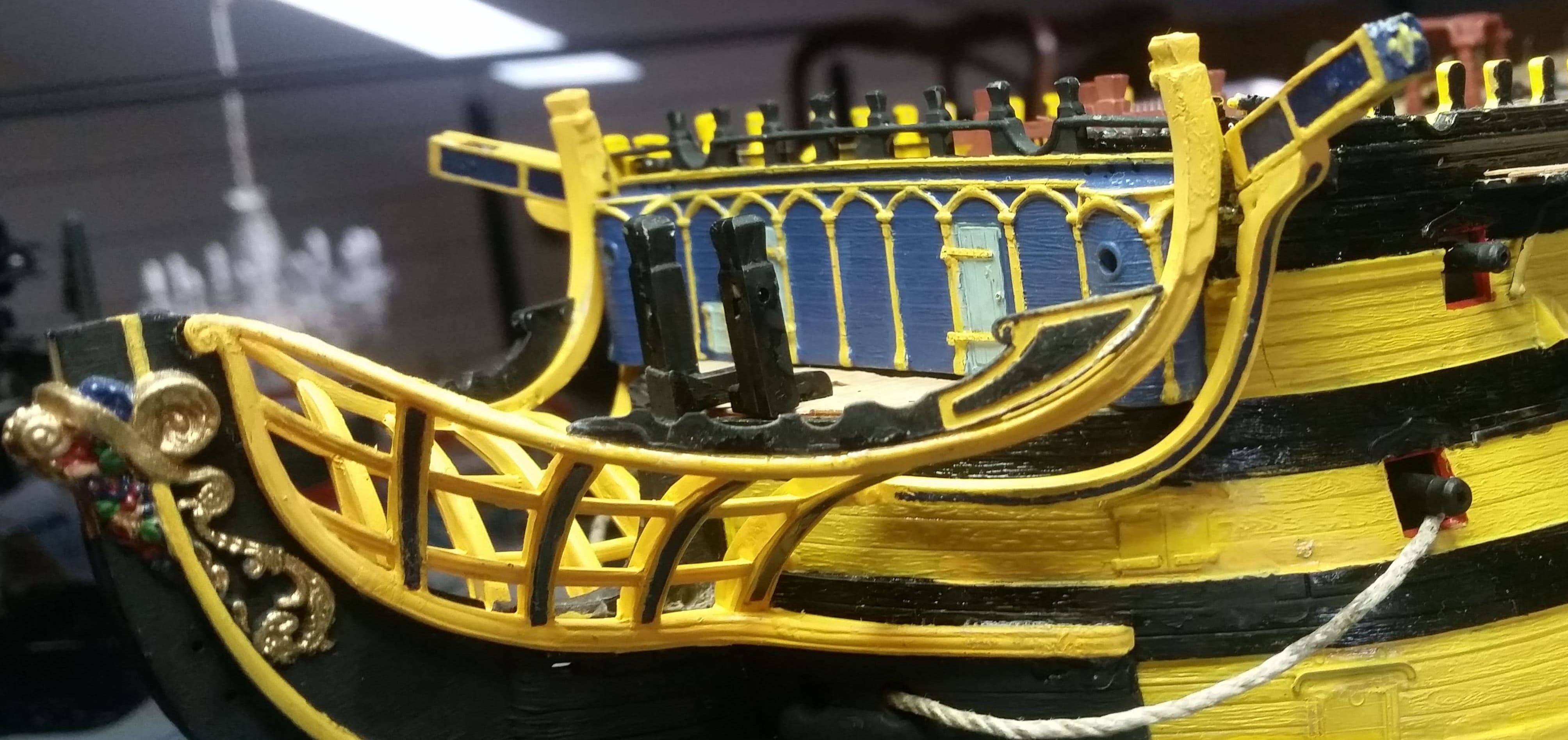 Poop-Deck ist fertig. Finknetzhalter (Ätzteile) ist angebracht. Die Eimer hängen.
