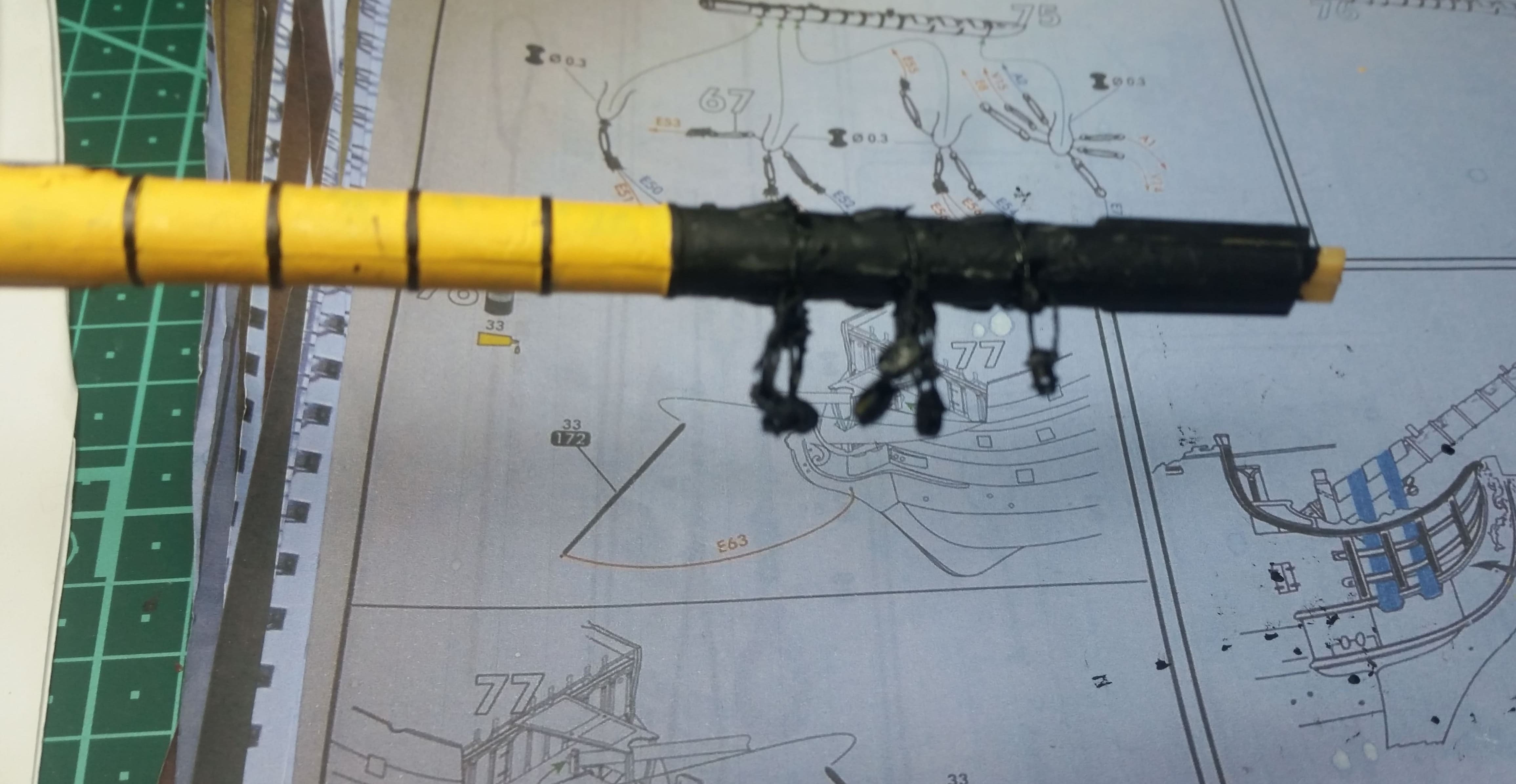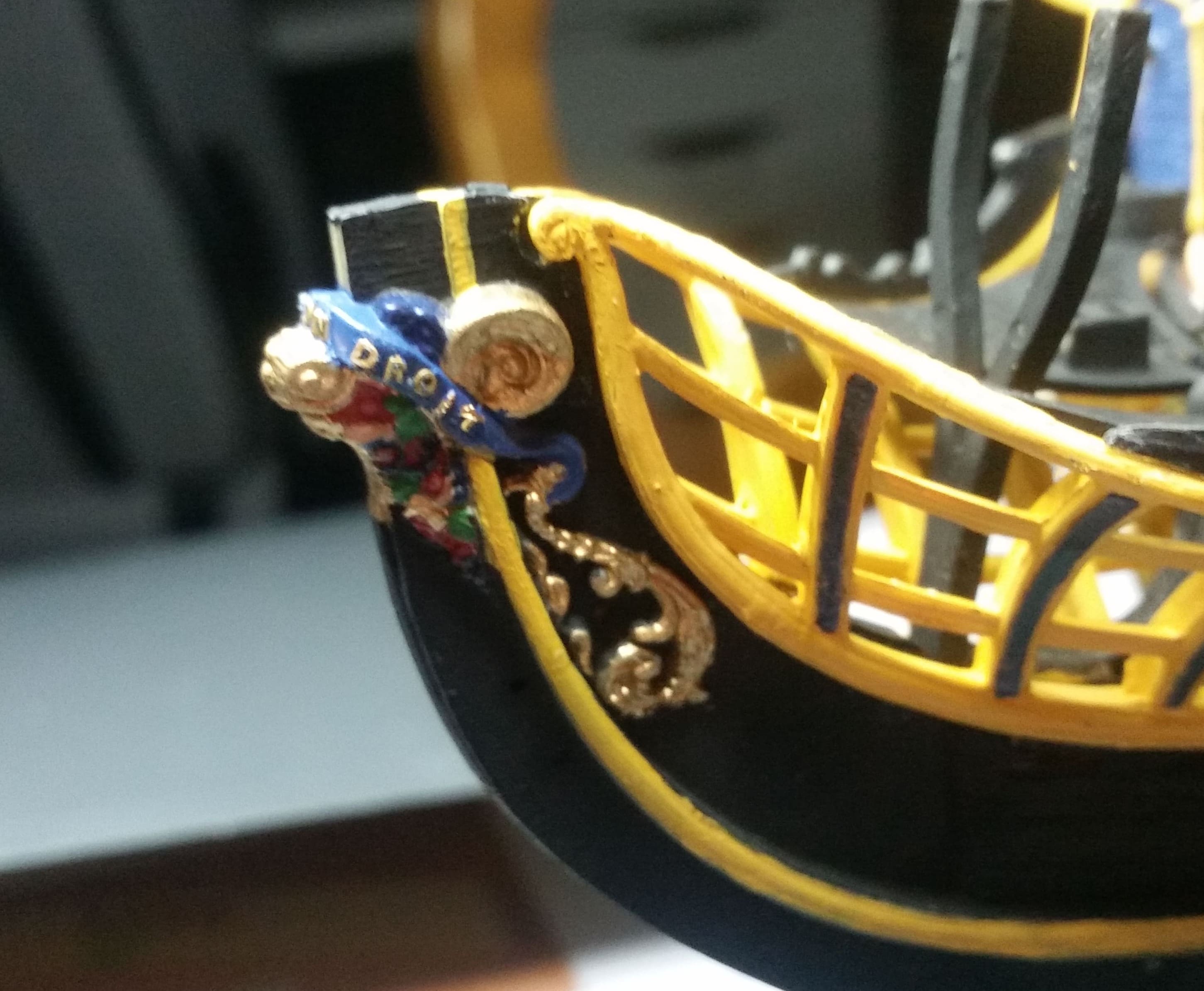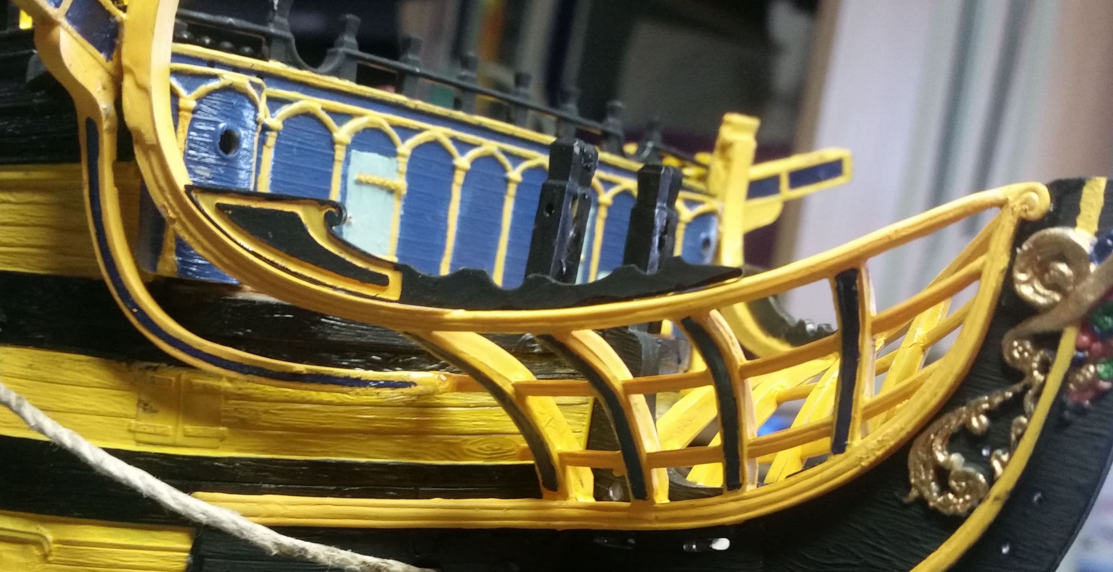 Die Bugreling ist bemalt und angebracht. Ebenso die Kranbalken. Zum Glück passt alles tadellos und es erklärt sich fast von selbst, wie alles angebracht wird. Die Anleitungen bieten da keine Lösungen an und sind allesamt ungenau.