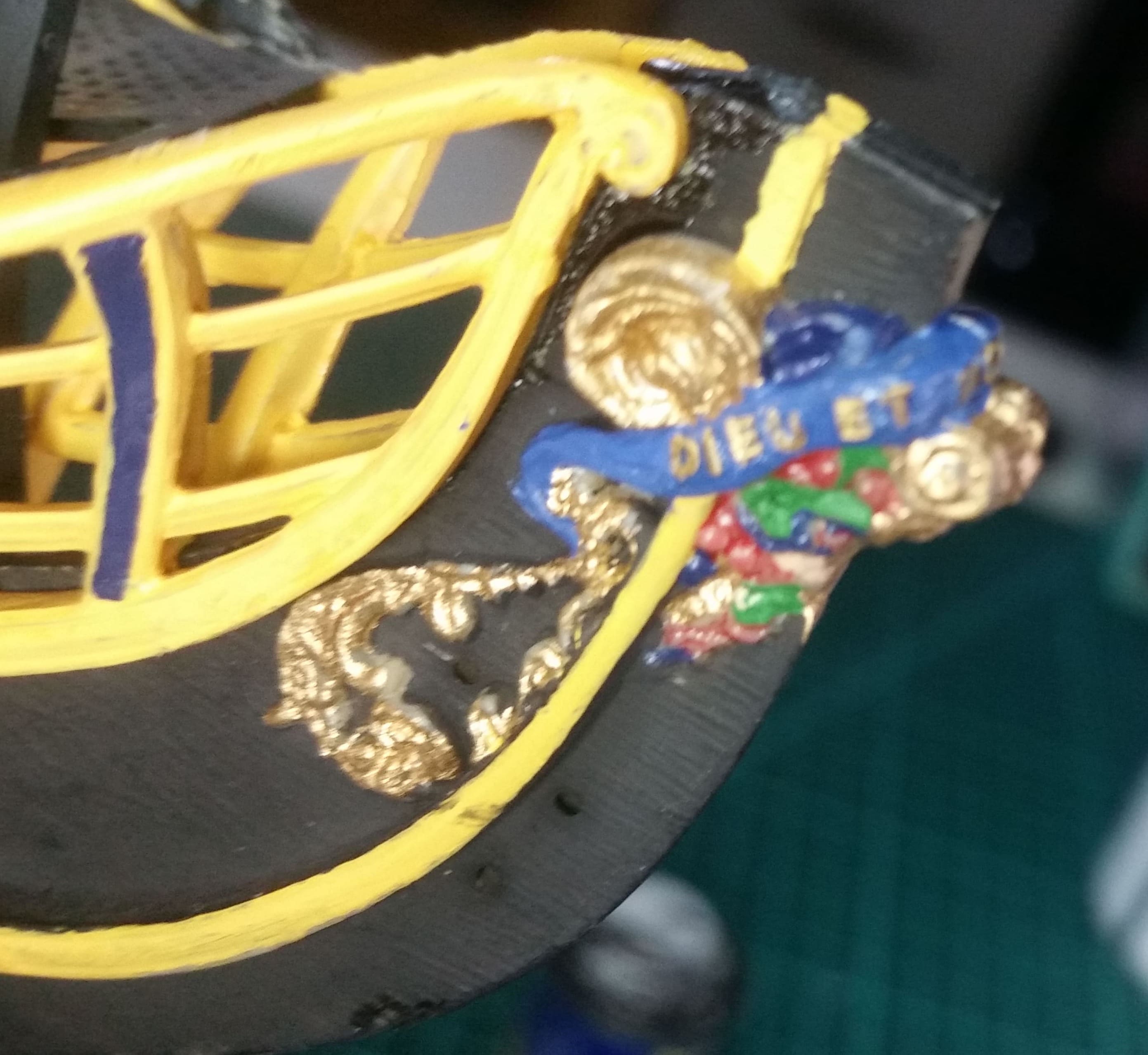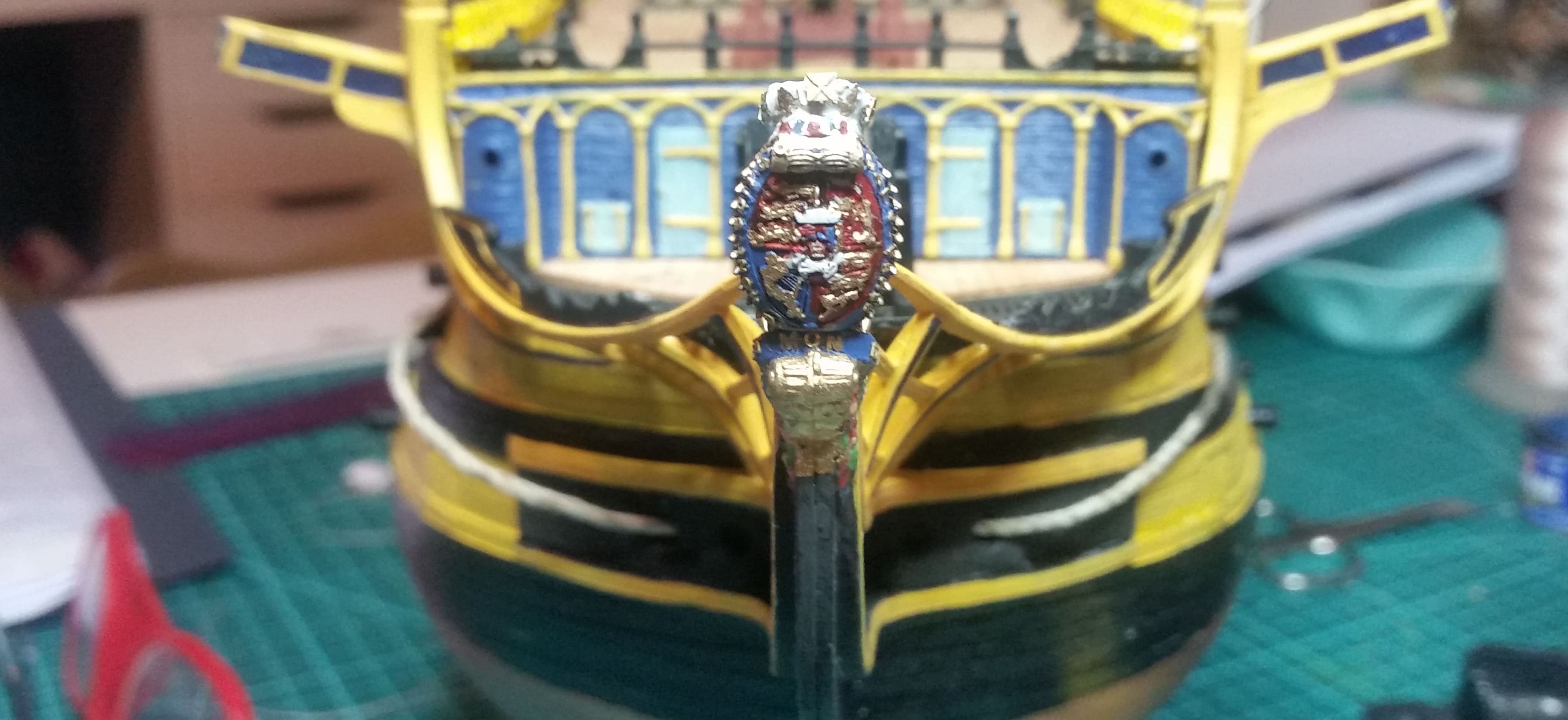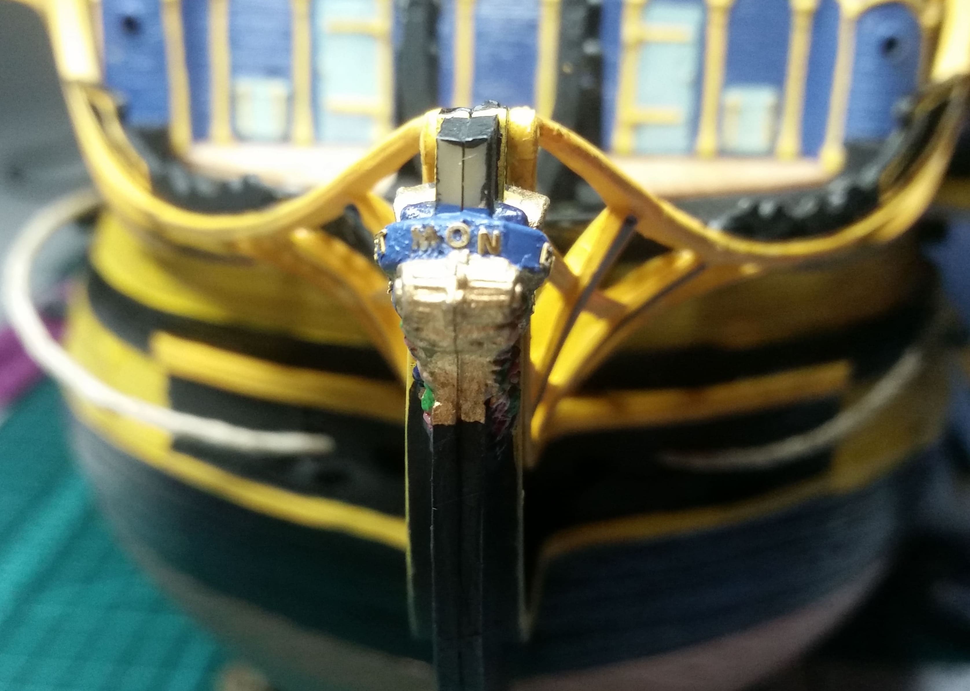 Die Bugreling ist bemalt und angebracht. Ebenso die Kranbalken. Zum Glück passt alles tadellos und es erklärt sich fast von selbst, wie alles angebracht wird. Die Anleitungen bieten da keine Lösungen an und sind allesamt ungenau.