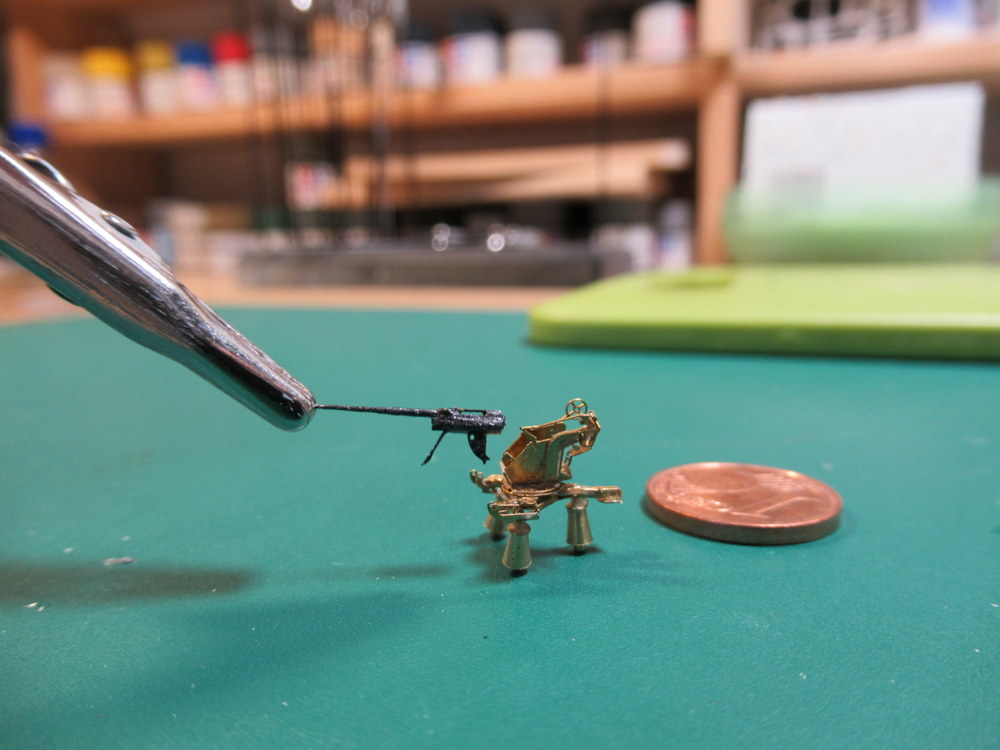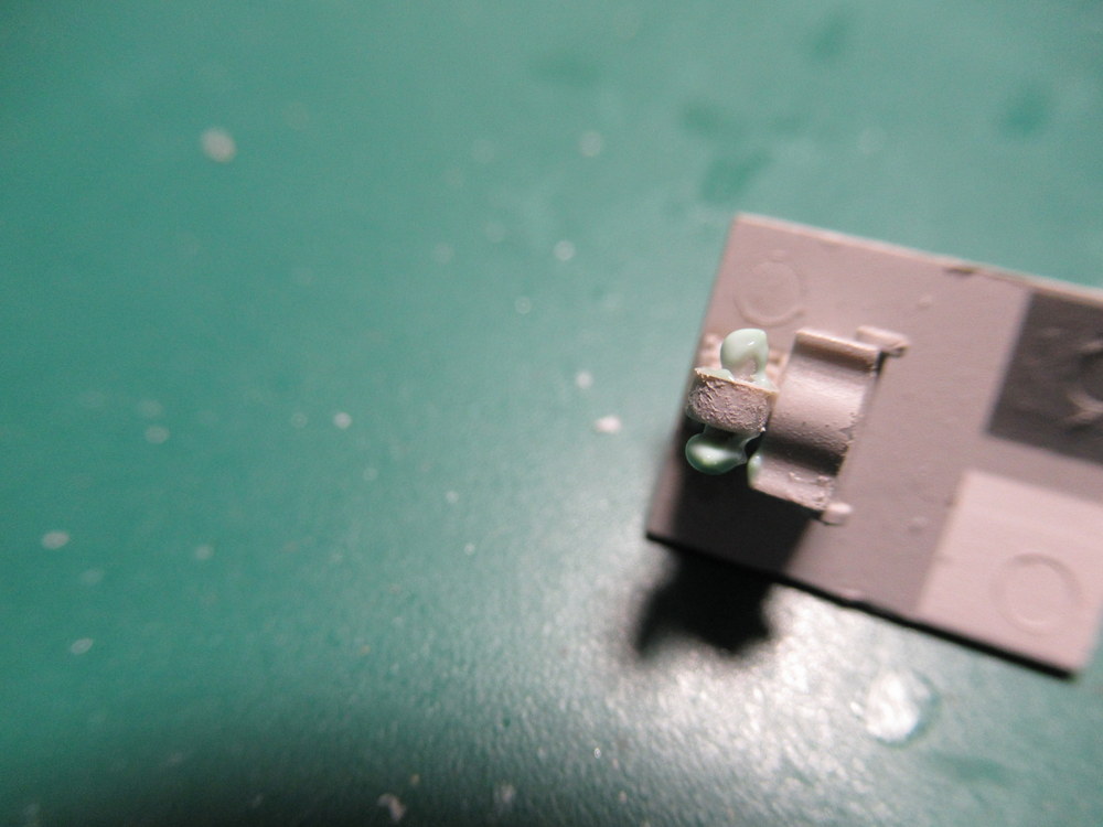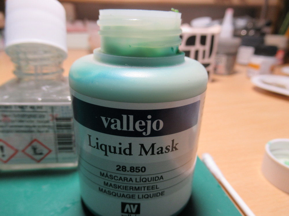 Da die Geschützrohre nur über einen kleinen Stift an der Seite gehalten werden , und das Rohr durch sein Gewicht ziemlich Wackelig sitzt habe ich dann an die Halterung erst mal ein Tropfen Liquid Mask gegeben . Dadurch sitzen die Rohre stramer in der Halterung , sind aber immer noch beweglich , da das Mask nicht hart aushärtet , sondern eher eine Konsistenz wie Kaugummi behält . .
