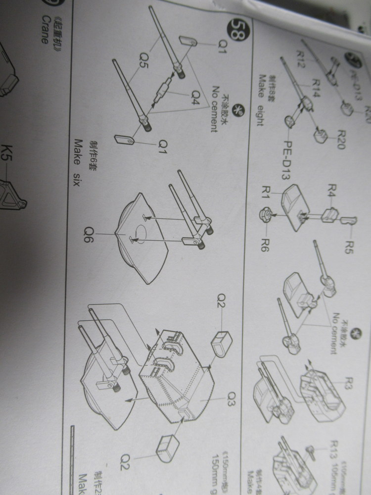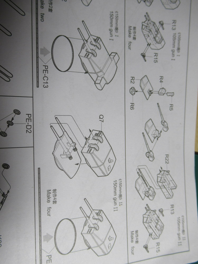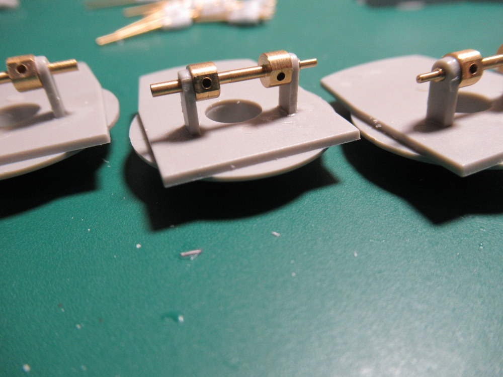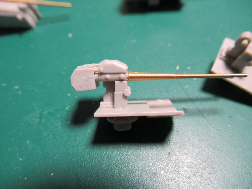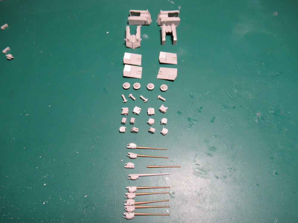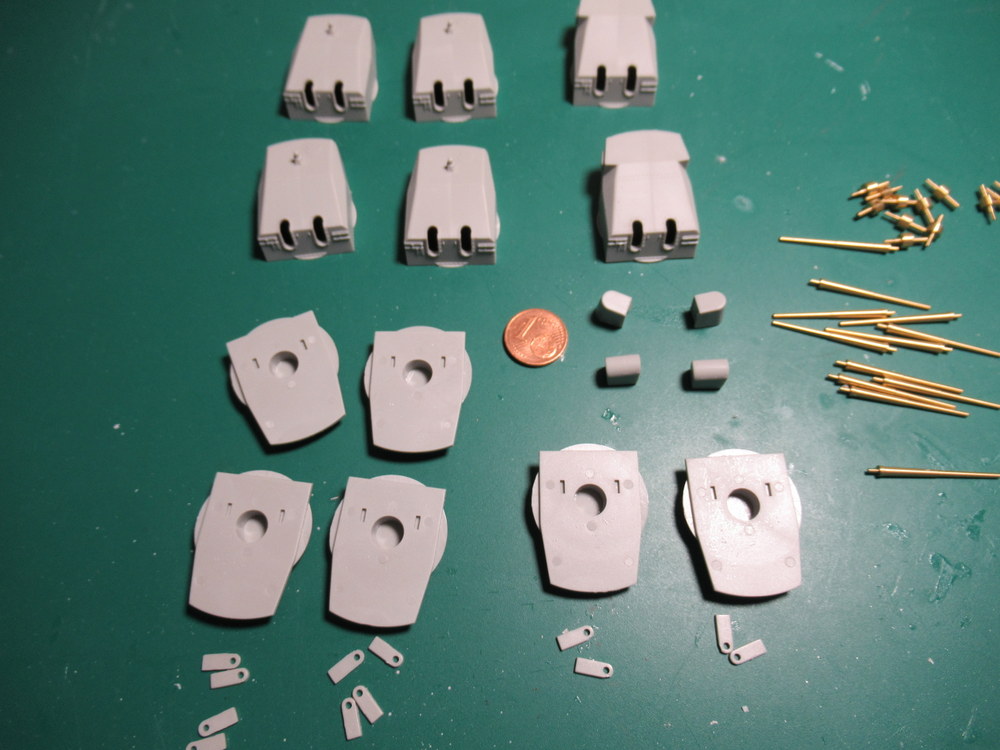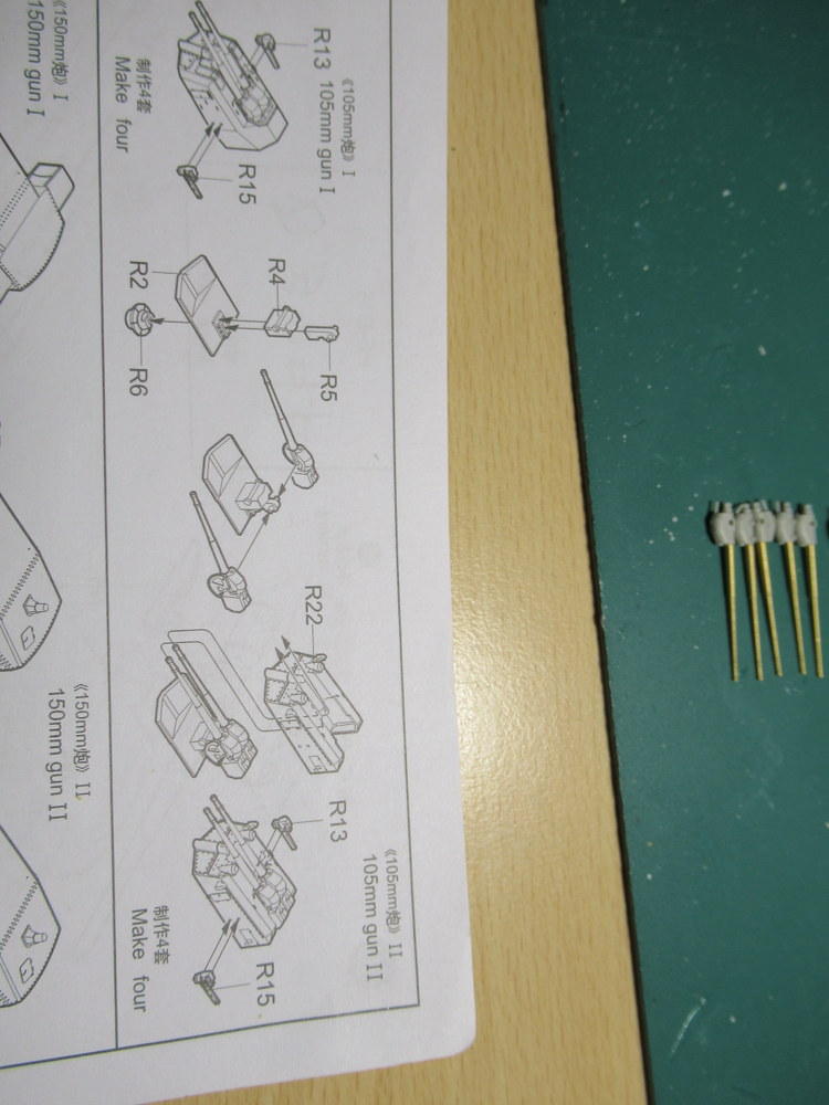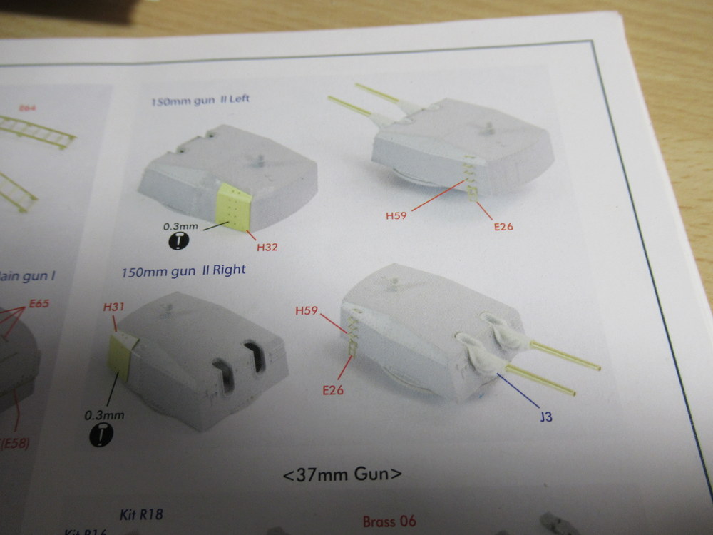 Im nächsten Teil geht es dann um die 150 mm Kannonen. Hiervon werden insgesamt 6 benötigt . Diese bestehen in der Hauptsache aus Plastik, werden aber durch Ätzteile und die Messingrohre wiederum aufgewertet.