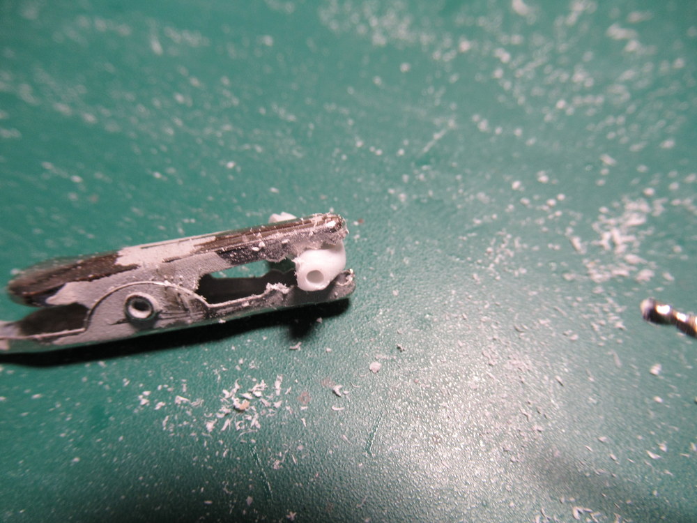 Tja fangen wir mal wieder bei den Rohrhosen an... diese sind zwar diesmal schon ''gelocht'' aber die Geschützrohre passen man gerade bis zur hälfte rein . Da die Hosen bis fast ganz drauf müssen blieb nur wieder das Erweitern der Löcher . Aufgrund der Größe der Rohre , war da nix mit Bohren . Also hab ich in meinen Proxxon den Fräseaufsatz eingespannt und die Hosen soweit aufgefrässt bis die Rohre ganz hinein passen. Irgend wann um 01Uhr war das dann fertig . .