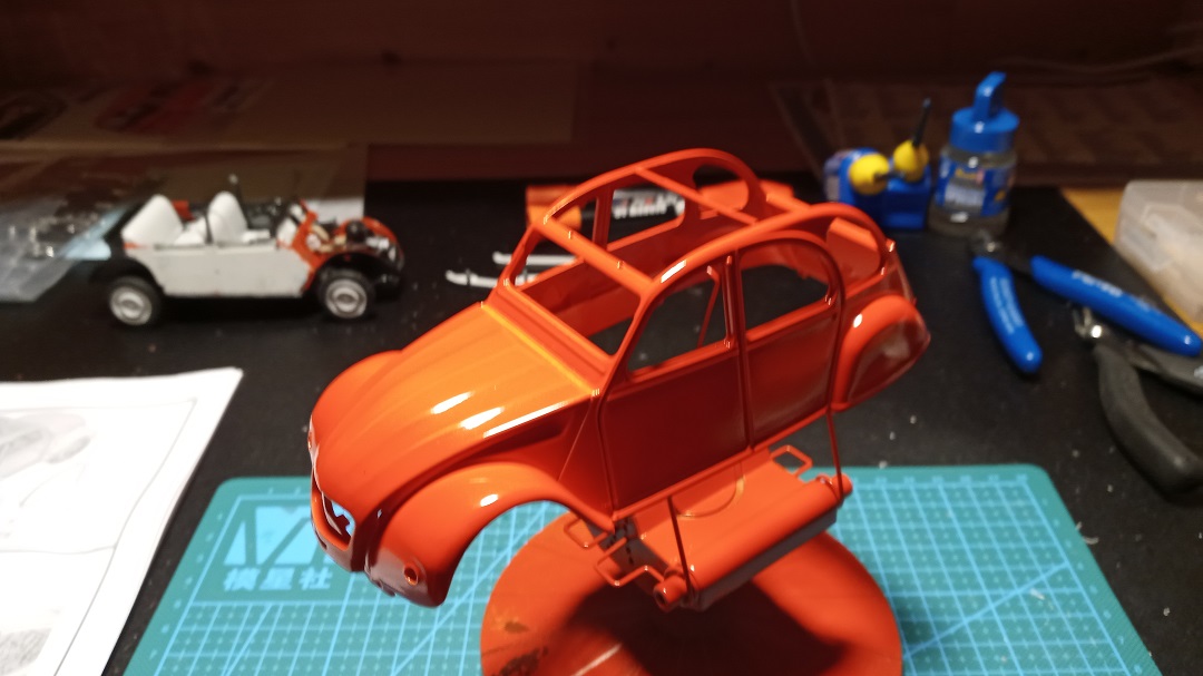 Die Karosserie der Ente hat nunmehr, nach einem Zwischenschliff (1000er), eine zweite und dann, ohne Zwischenschliff eine dritte Schicht bekommen - alles mit der Spraydose (Revell 34131). Ich glaube, ich hätte besser das "Italian red" genommen, kommt wohl dem Vorbild (Citroen riorot) deutlich näher. Ich muss aber gestehen, dass ich "rotgrün-blind" bin und daher ähnliche Farbtöne nur sehr schlecht unterscheiden kann.