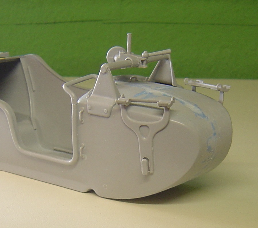 Die Scheiben vorne und hinten wurden großzügig eingeklebt, die habe ich mit der Tamiya-Säge heraus operiert. Vorne ging zu retten, hinten wird zum Teilespender.