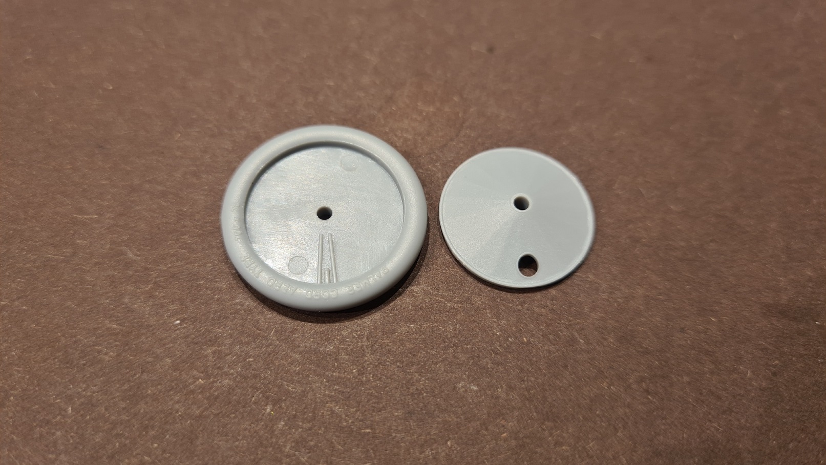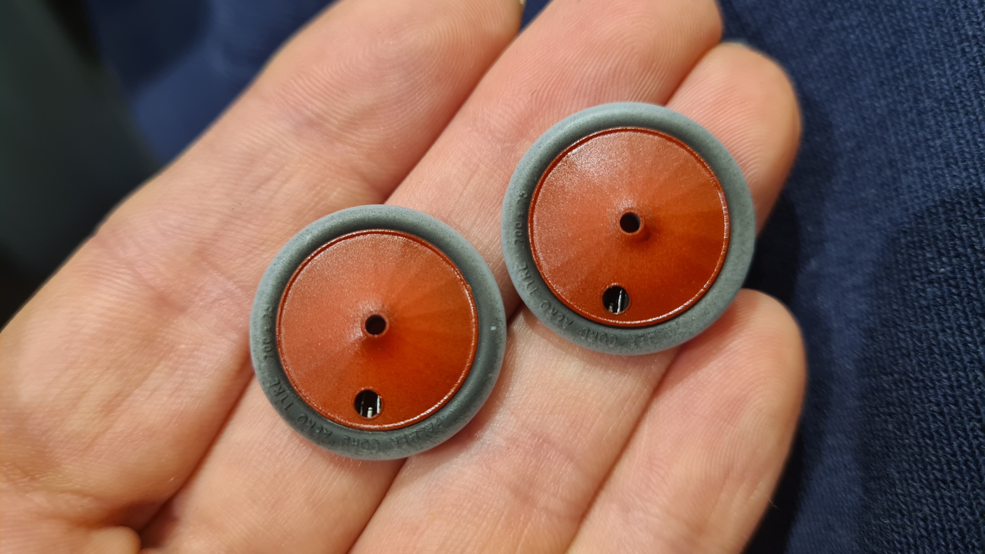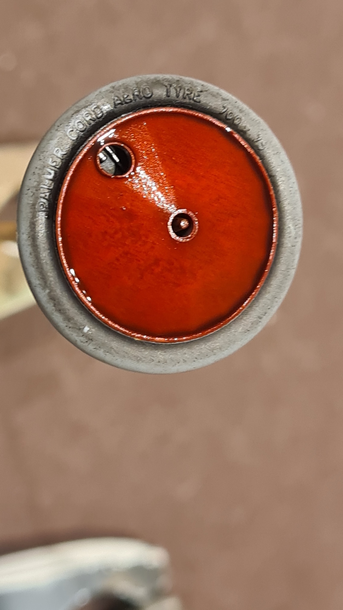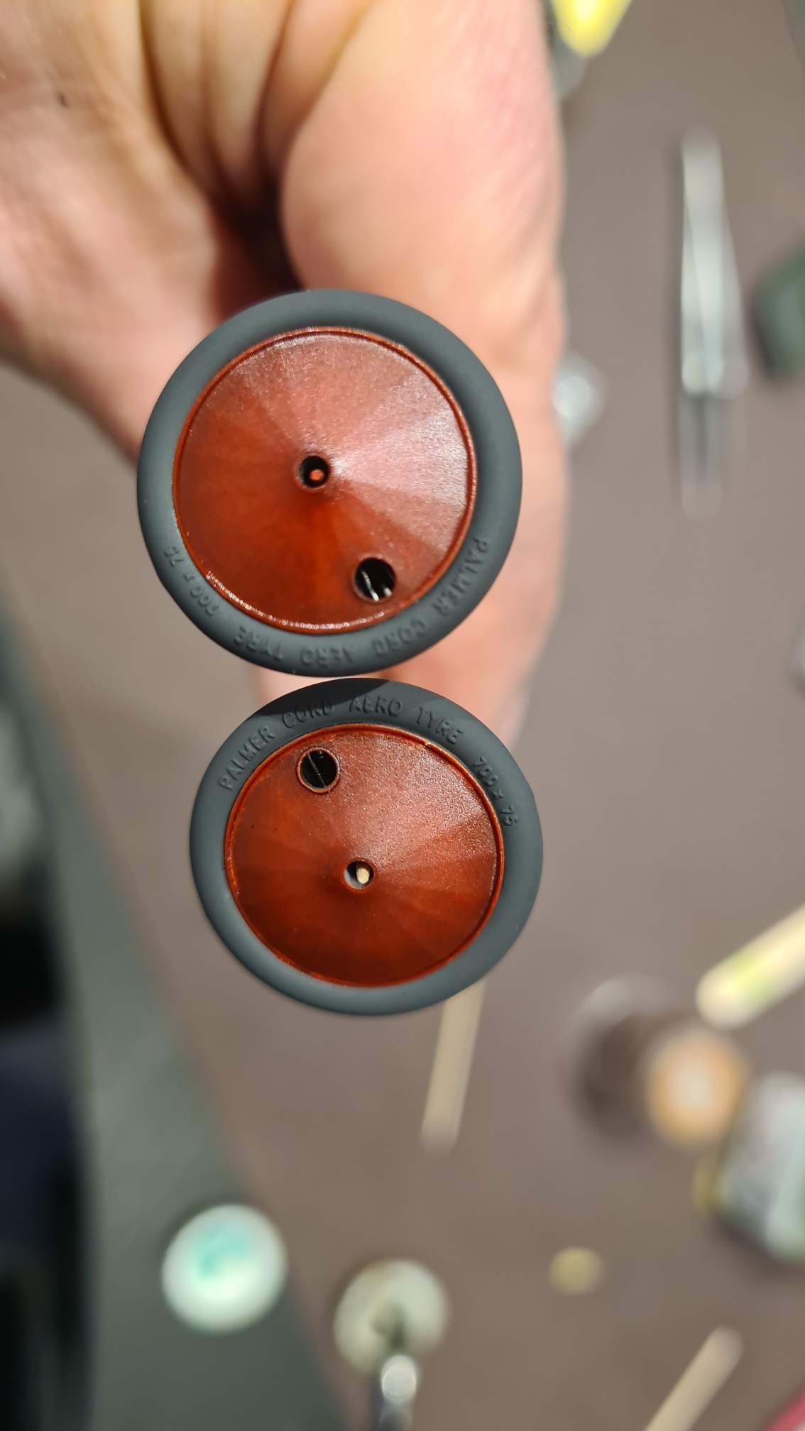 Hier also die Rohteile. Es handelt sich eigentlich um Speichenräder, die verkleidet sind. Durch ein kleines Loch haben wir den Zugang zum Ventil und können etwas von den Speichen sehen. So der Plan.