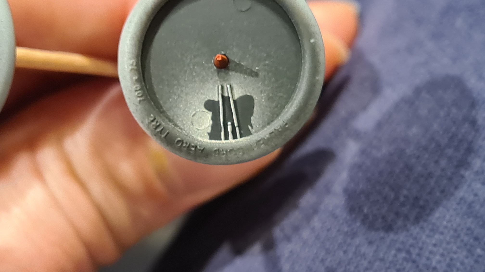Jetzt kommt der Teil mit der Fingerfarbe. Die Schriftzüge auf den Reifen sind erhaben. Aber für meine Drybrush-Fähigkeiten sind sie einfach zu klein. Ich habe darum kleine Mengen Farbe (Tamiya XF-19) auf meinem kleinen Finger geschmiert.