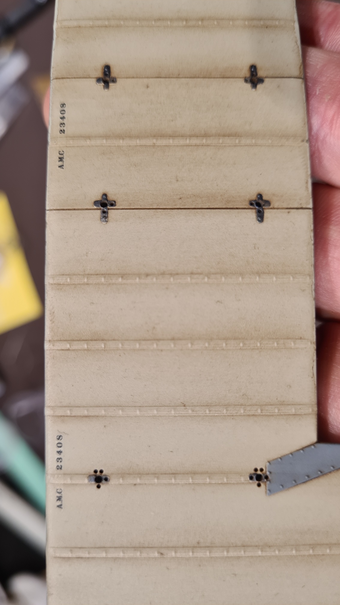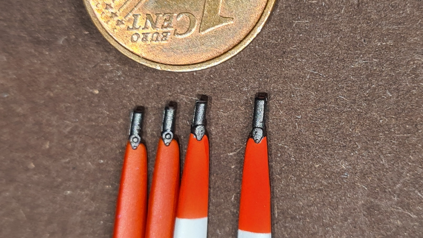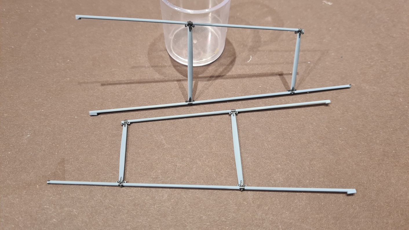 Ein ganzer Haufen Stützen zwischen den Tragflächen wurden angefertigt. Die Meisten sind schlicht grau. Aber ein paar bedürfen mehr Aufmerksamkeit. Die äußeren Stützen (und auch die Farbe der Räder) geben darüber Aufschluß, in welcher Einheit die jeweilige DH.2 geflogen ist.