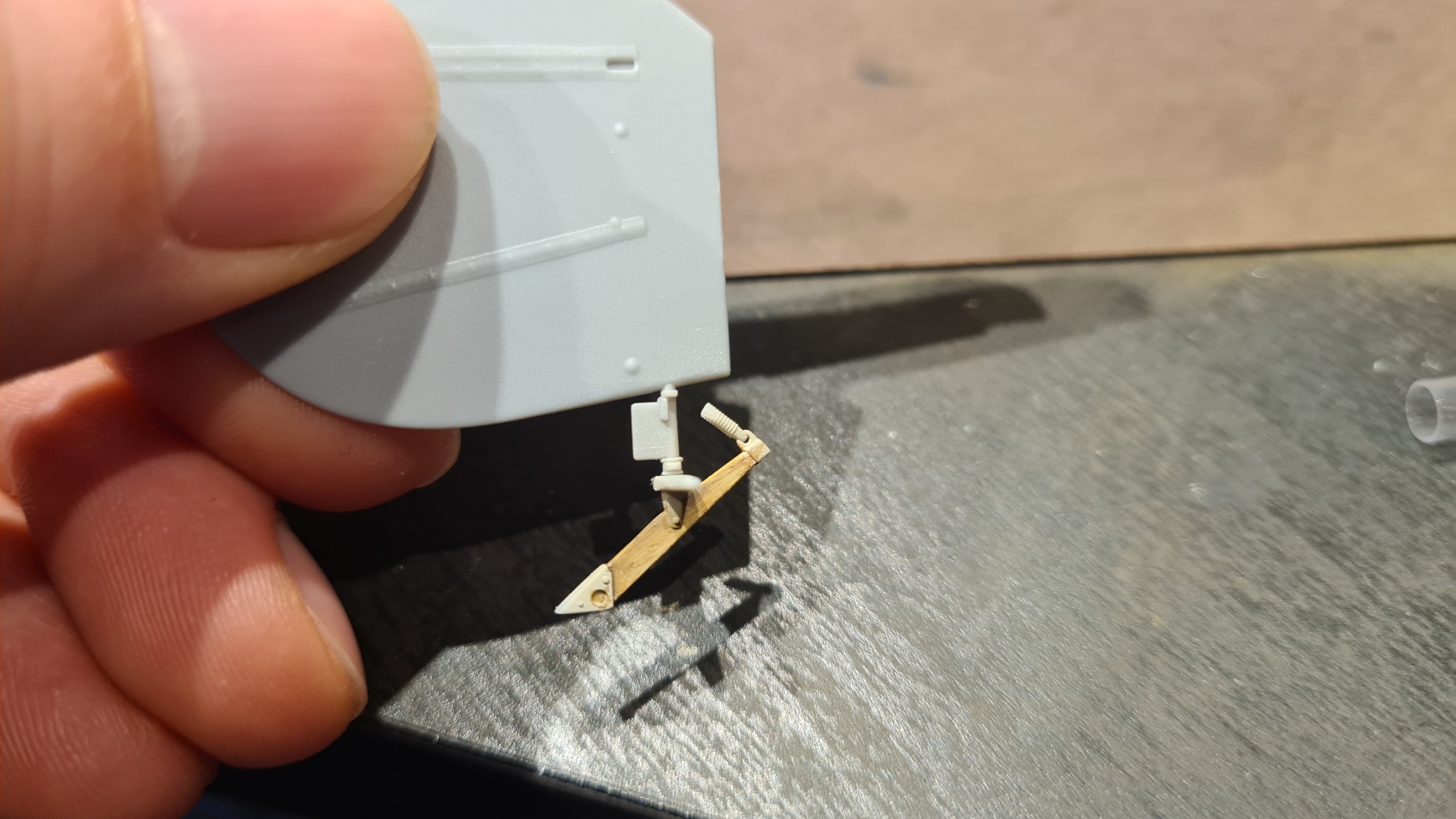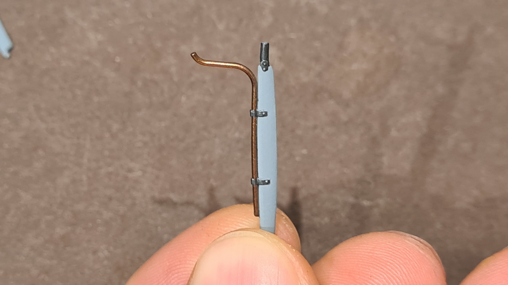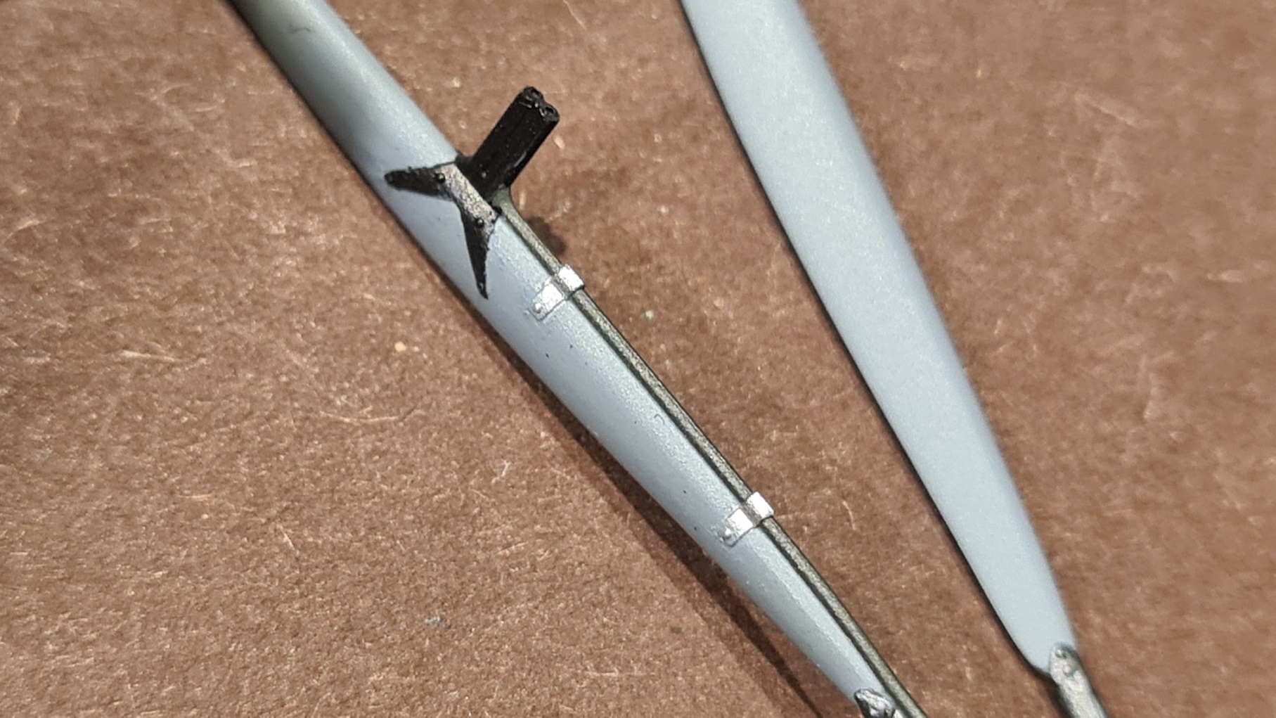 Folgende Stütze enthält das Pitot-Rohr. Samt Anschlußleitung. Ist ein Spritzling, also sorgfältig abkleben. Die kleinen Spitzen waren mir im Bausatz etwas zu dick (kein Foto), die wurden abgetrennt. Ganz zum Schluss werde ich hier noch kleine Drähtchen einkleben. Löcher wurden vorgebohrt.