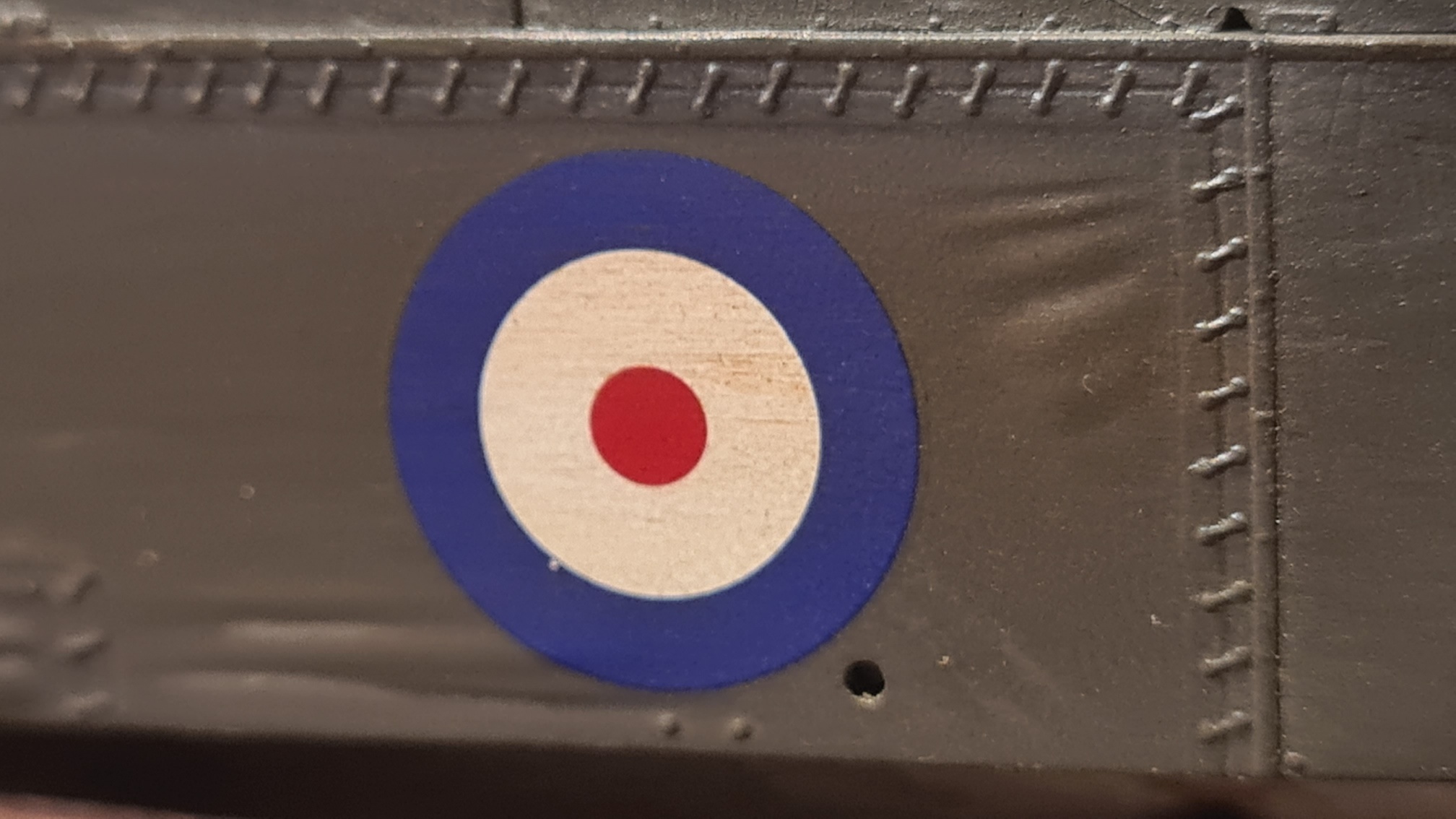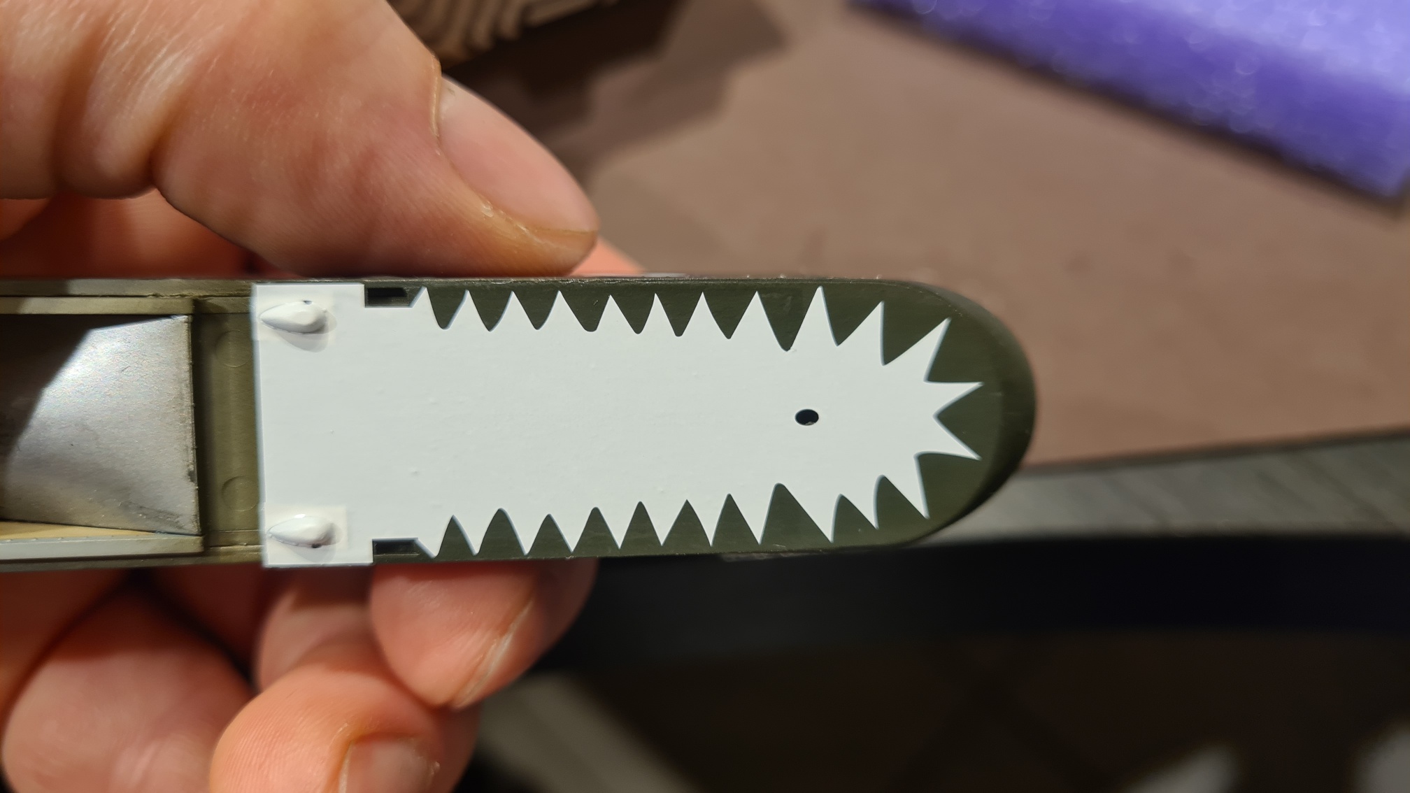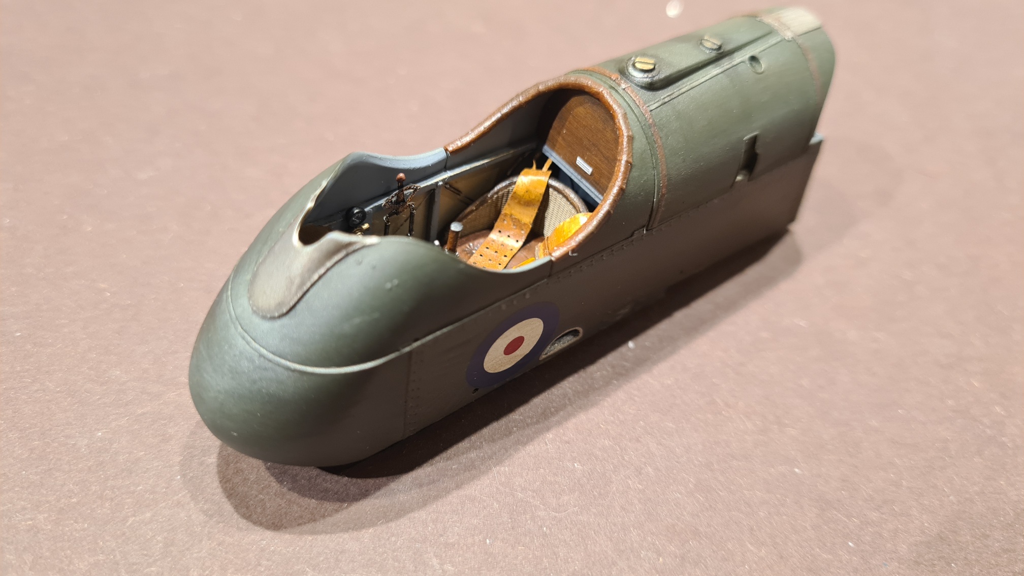 Die Unterseite der Gondel wurde ziemlich aufwändig gespachtelt und verschliffen. Dann kam ein weißes Sägezahn Decal drauf. Danach wurde noch ein Teil angeklebt (das ist die Verkleidung für den Kompass) und die Unterseite wurde mit Ölfarbe verdreckt.