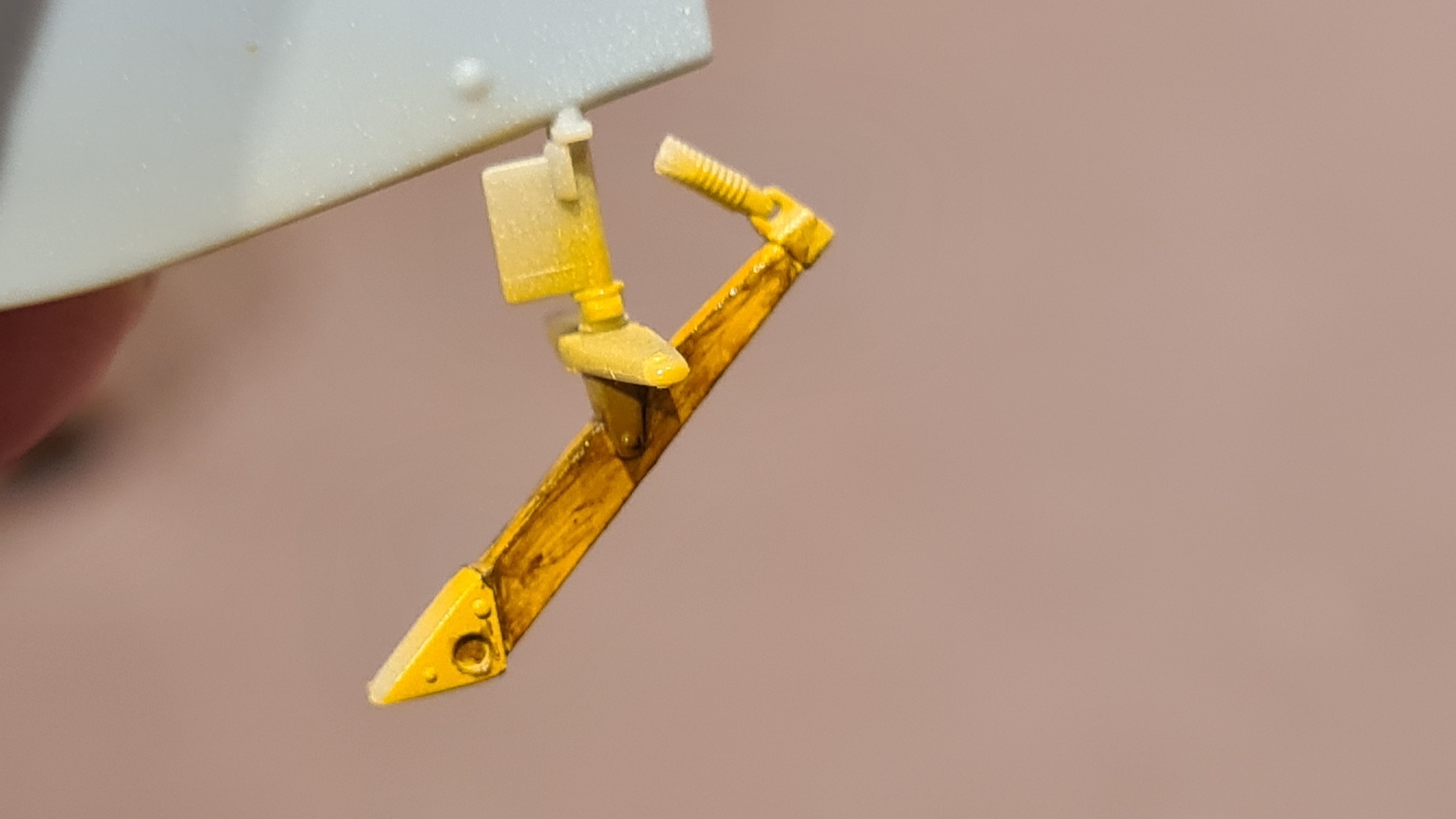 Folgende Stütze enthählt noch die Benzinleitung zum Falltank auf der oberen Tragfläche. Material ist unbekannt, aber Messing sieht hübsch aus. Auch dies war wieder nur ein Spritzling. Aber das Rohr ist so hervorragend gegossen, top!