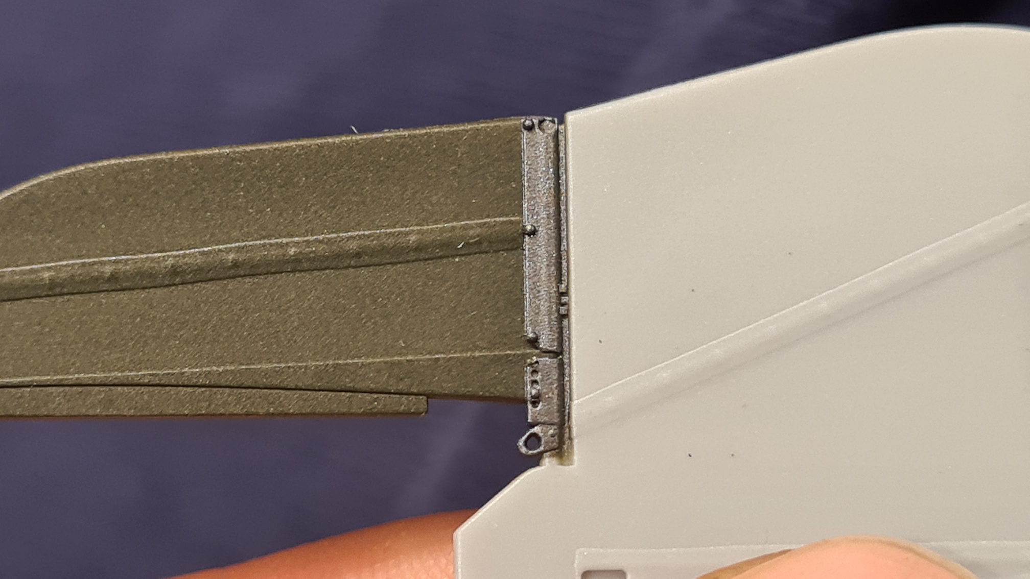 Die Flügel habe ich mir auch noch einmal vorgenommen. Die haben auch noch einmal ein Ölwash bekommen (Gemisch aus Braun und Schwarz). Sieht man in der Realität stärker als auf den Fotos. Darüberhinaus wurden auch hier Metallteile mit der Mischung aus Schwarz/Gunmetal angemalt.
