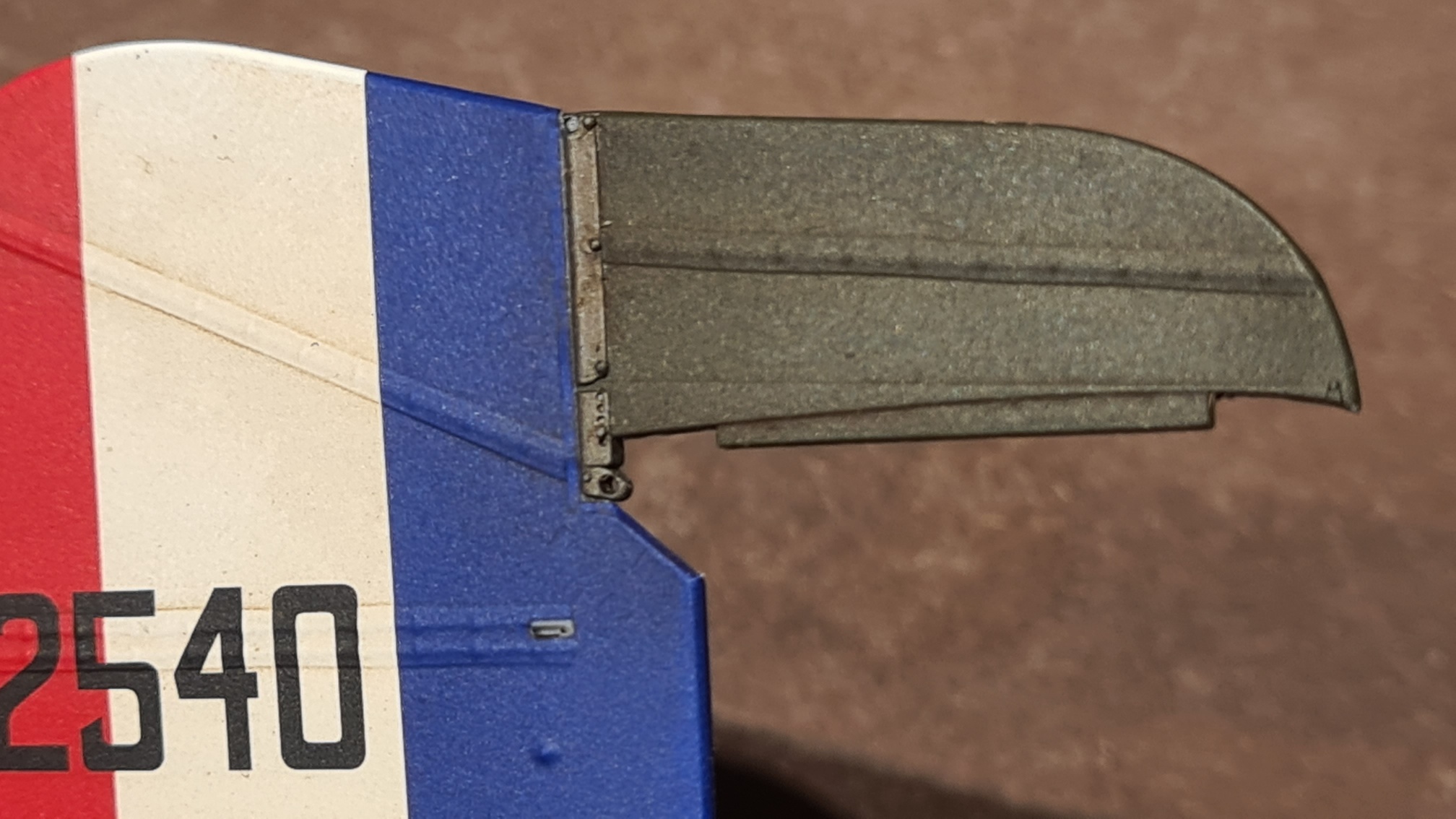 Der steife Teil des Seitenruders bekam die Gleiche Behandlung wie die Oberseite der Tragflächen. Das Scharnier wieder Gunmetal/Schwarz. Konnte man recht gut abkleben.