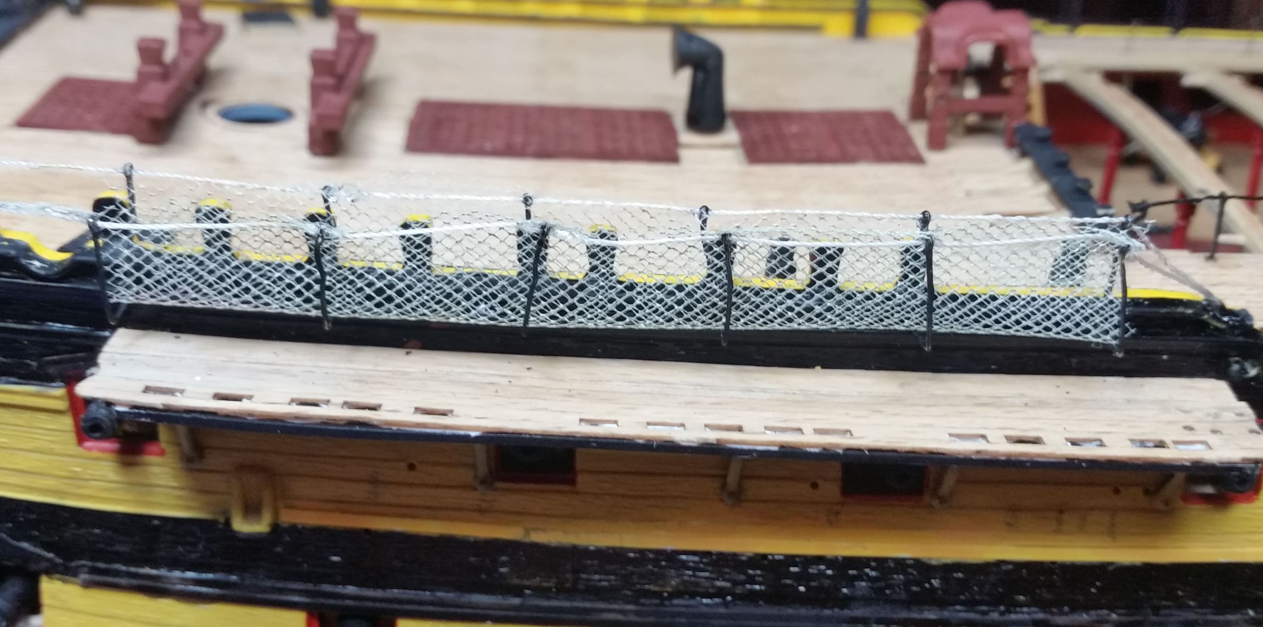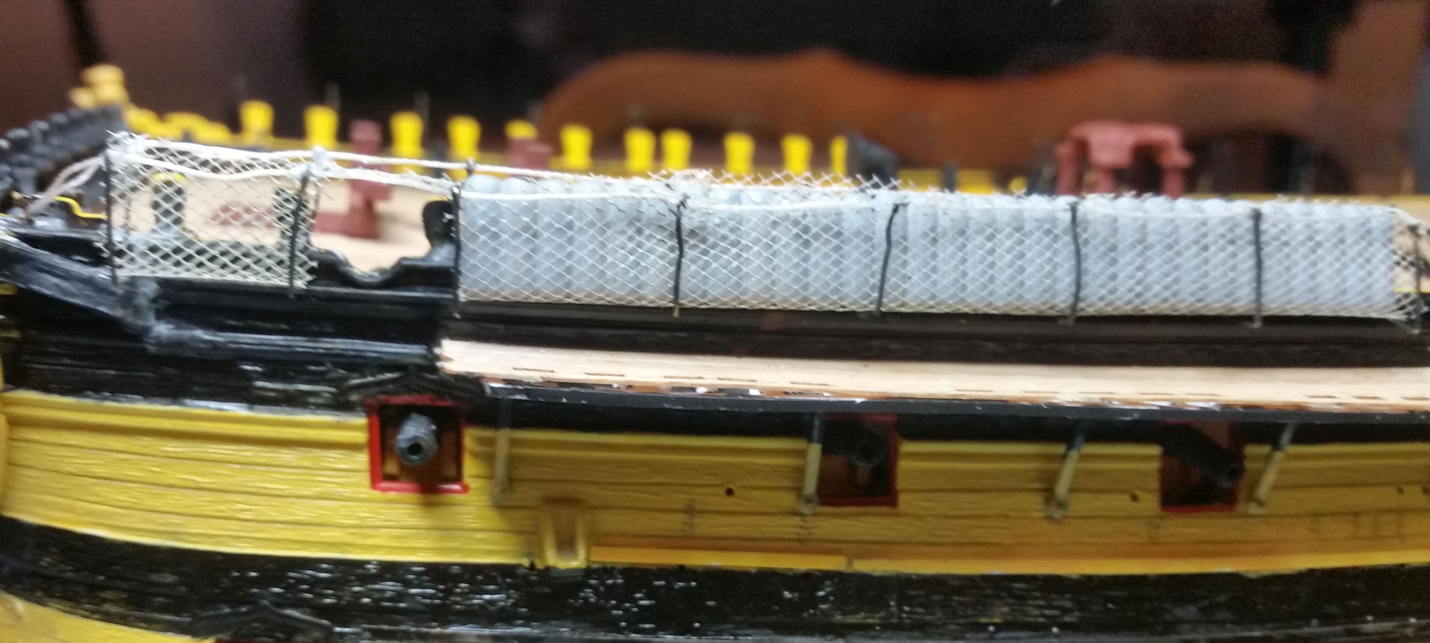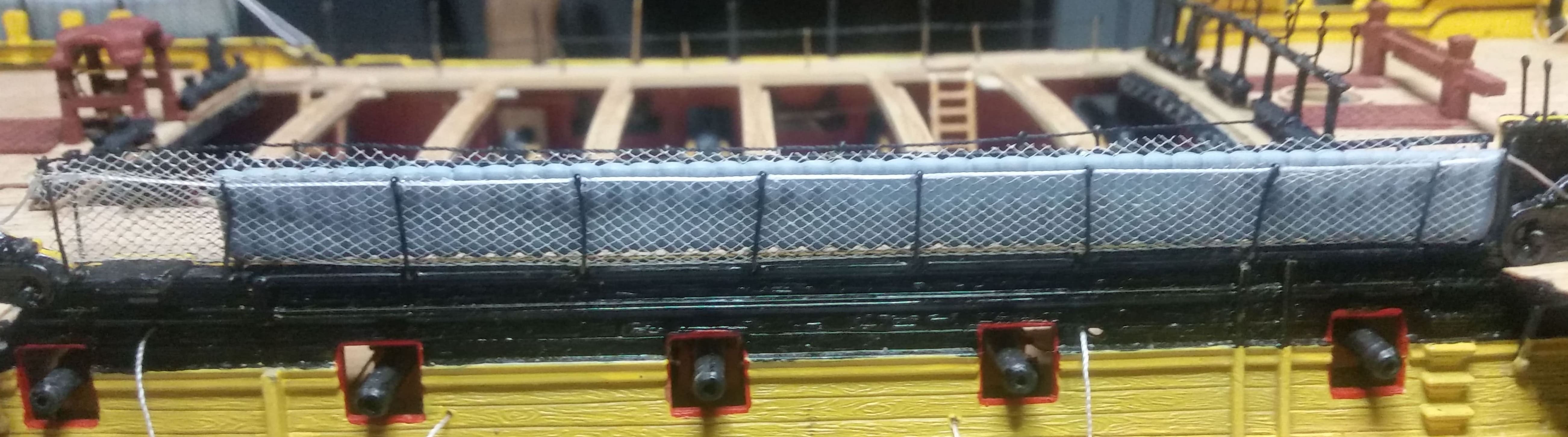 Auf der Steuerbordseite werde ich dann ein großes und ein kleines Netz getrennt legen. Dann die Hängematten bemalen und reinlegen.