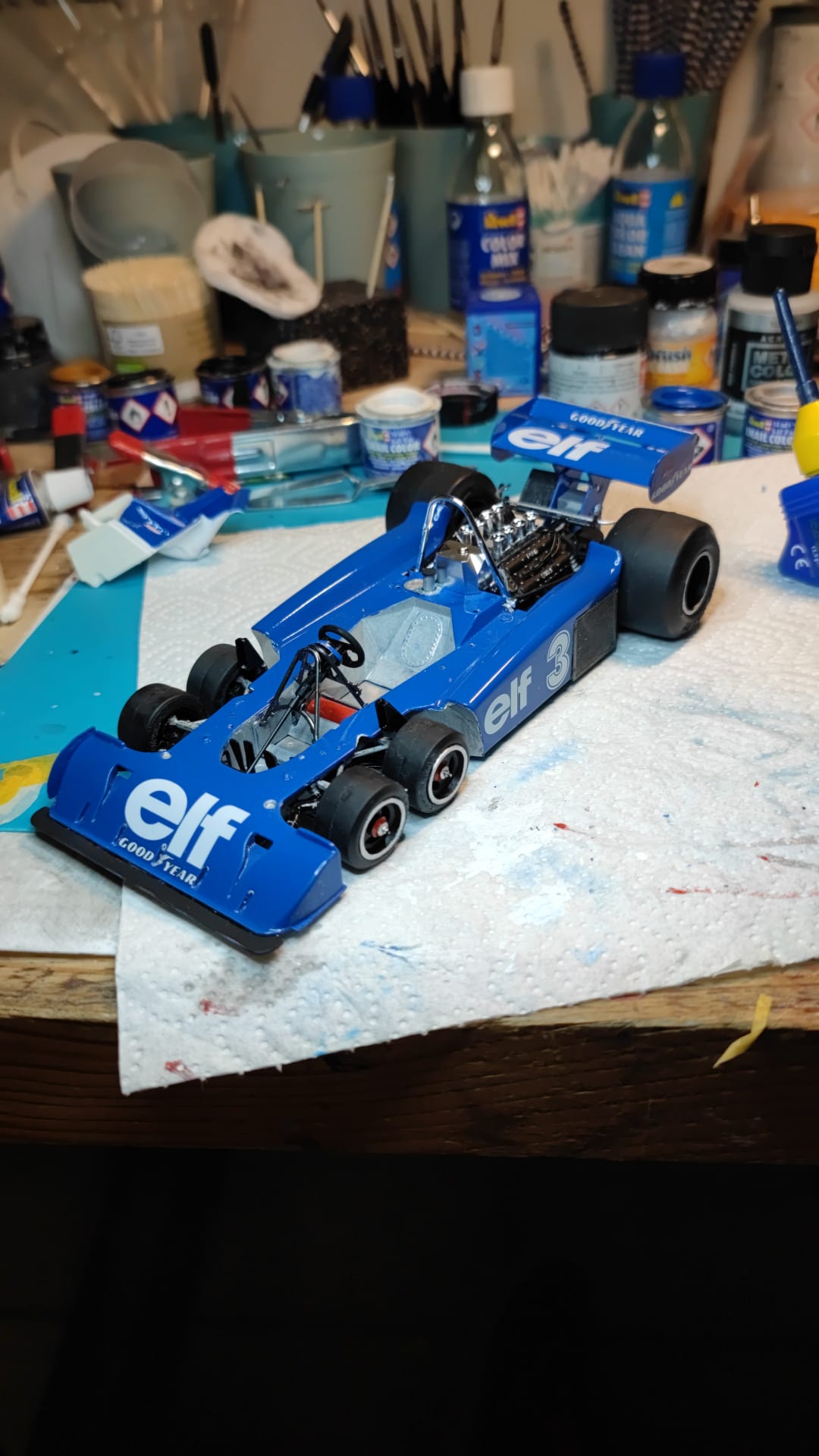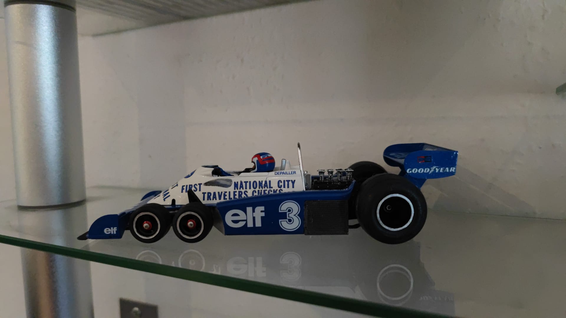 In Regal teilen sich noch CD's den Platz mit den Modellen. Mit jedem neuen fertigen Modell müssen dann die CD's weichen.... Bis jetzt sind es fünf, die Ente, die Cobra, Corvette, Ford GT und jetzt der Tyrell. 7 weitere können da rein... 😜😜😜