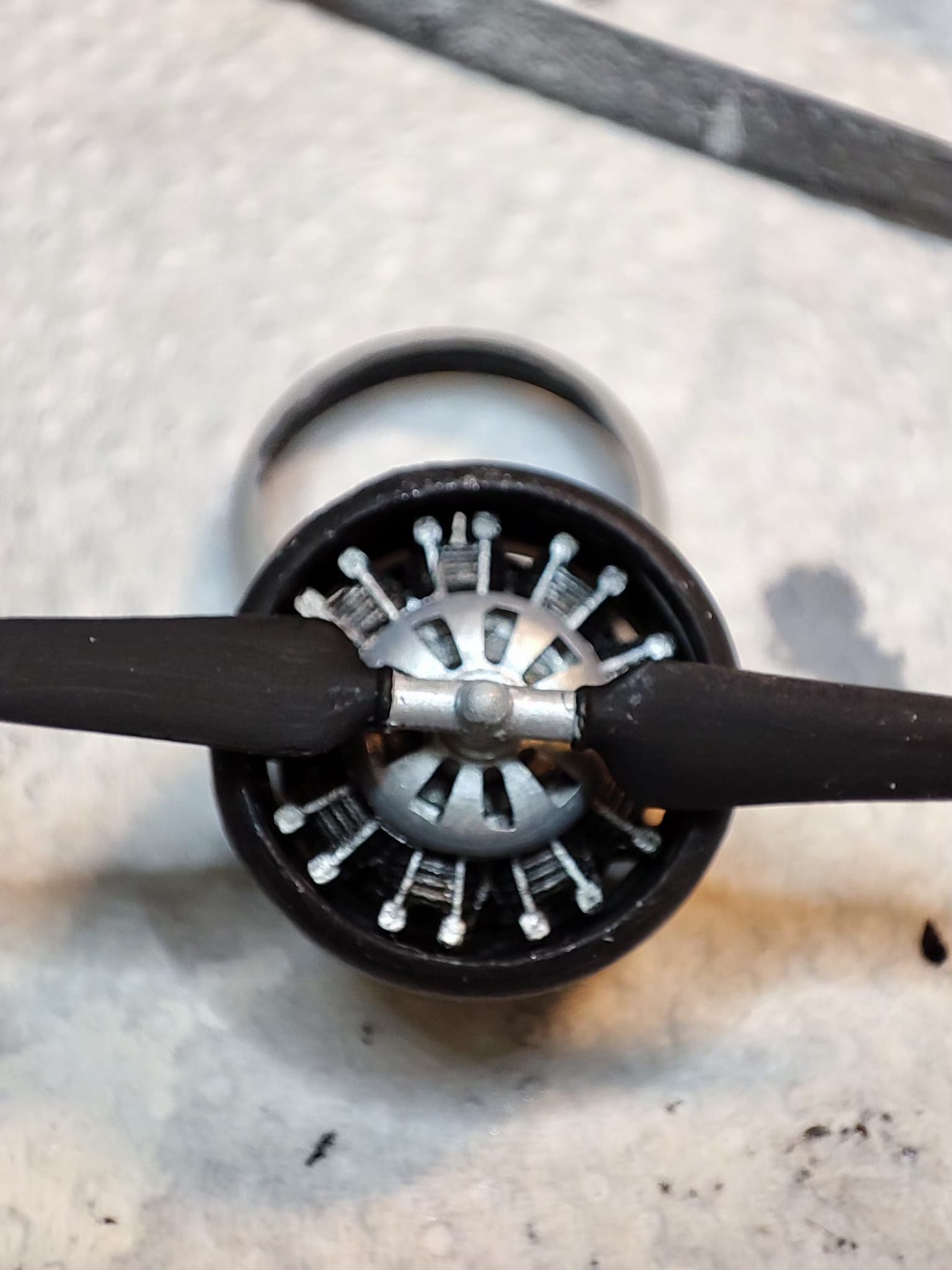 Der erste Motor für die Ju-52 ist fertig. Ich hoffe, man kann erkennen, dass die Kühlrippen und Ventile in unterschiedlichen Farben bemalt worden sind.