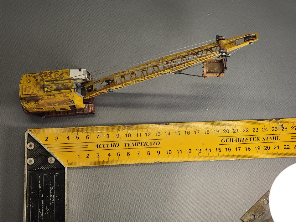 Ein Arbeitsponton mit Schürfbagger im Maßstab 1: 87. 1:87 ist ja eigentlich ein Maßstab aus dem Bereich der Modellbahn. Bei meinen Recherchen zu einem Ersatzteilträger für den Hafenschlepper fand ich auf einem Flohmarkt diese etwas ungewöhnliche Modell.