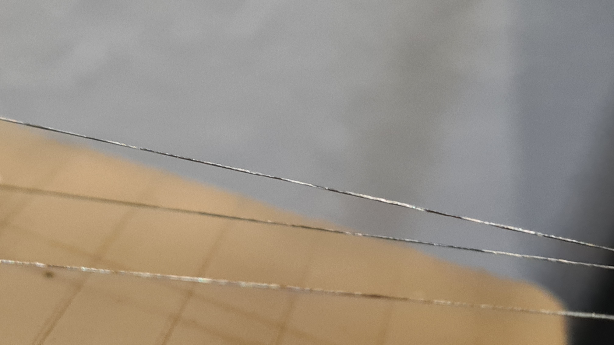 Bislang hatte ich mit der EZ-Line von Infini gearbeitet. Damit läßt sich nun wirklich vergleichsweise bequem verspannen, weil der Faden super dehnbar ist. Ebenso wie die Fäden von Uschi. Aber den Komfort erkauft man sich leider mit einem etwas unschönen Erscheinungsbild. Schaut mal auf dieses Foto: Nach der metallischen Bemalung gibt es meist in regelmäßigen Abständen dunkle Stellen. Das liegt wohl daran, dass der Querschnitt der Fäden nicht rund ist, sondern eher flach. Verdreht sich der Faden (was kaum zu verhindern ist), dann kommt es zu diesen ungünstigen Lichterscheinungen, weil die metallische Farbe eben reflektiert.