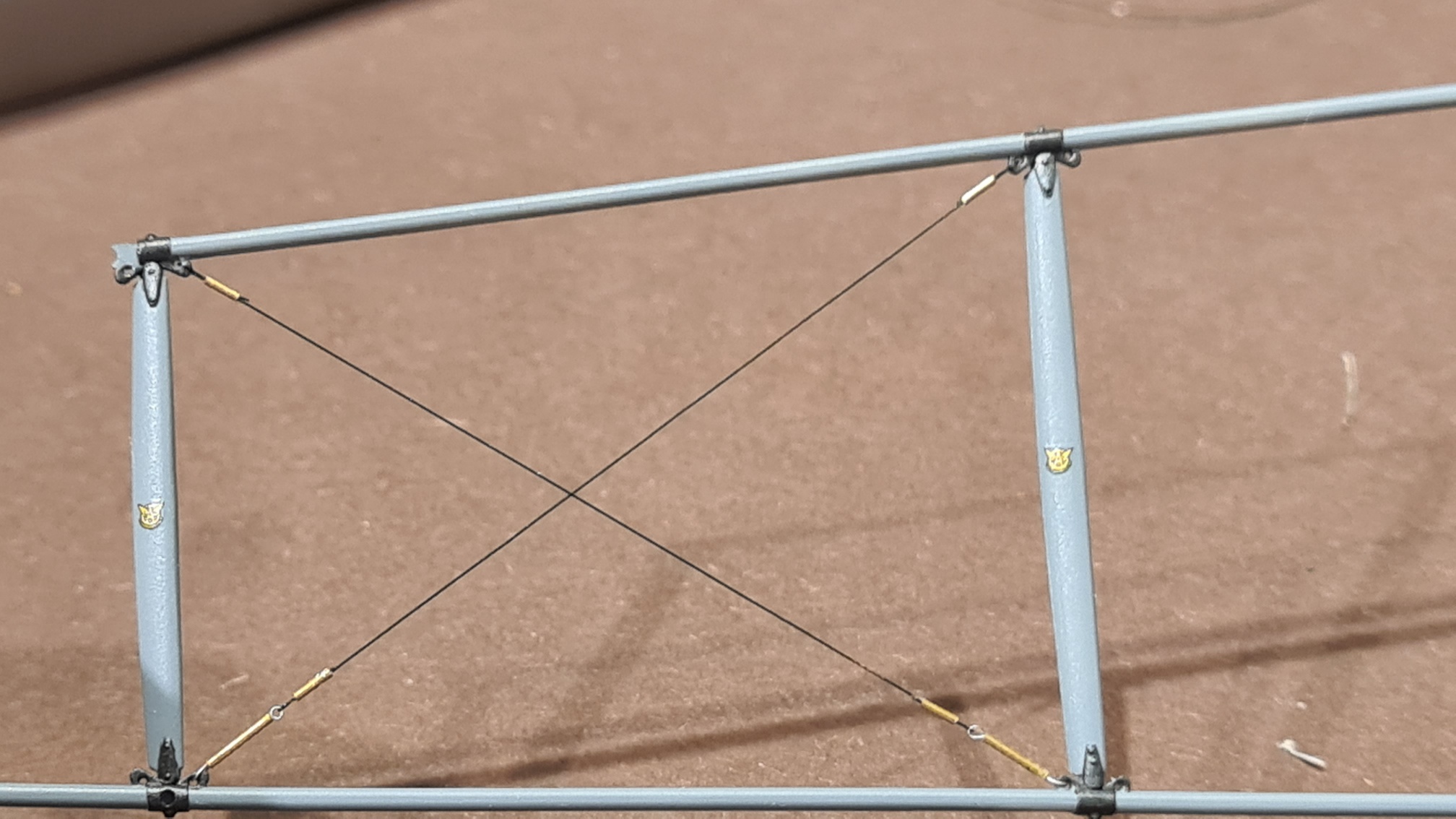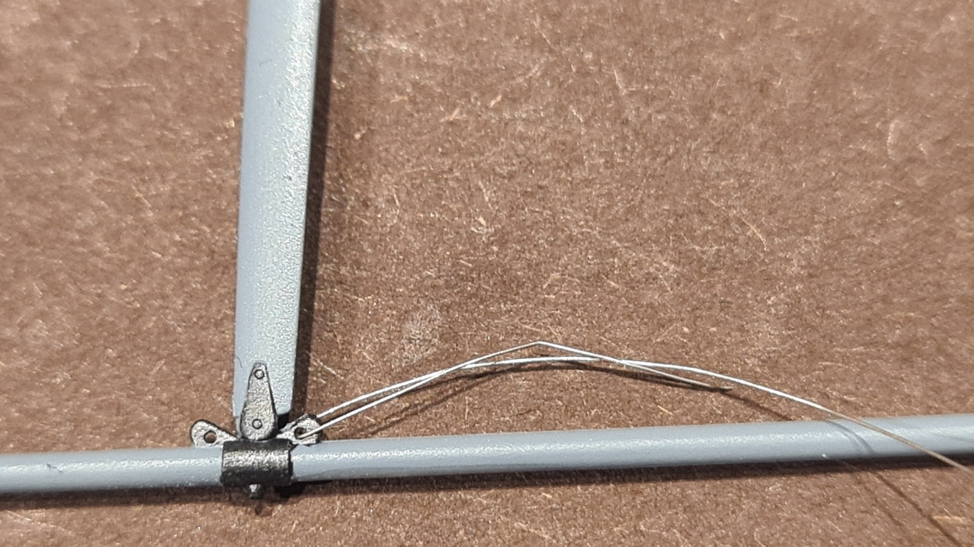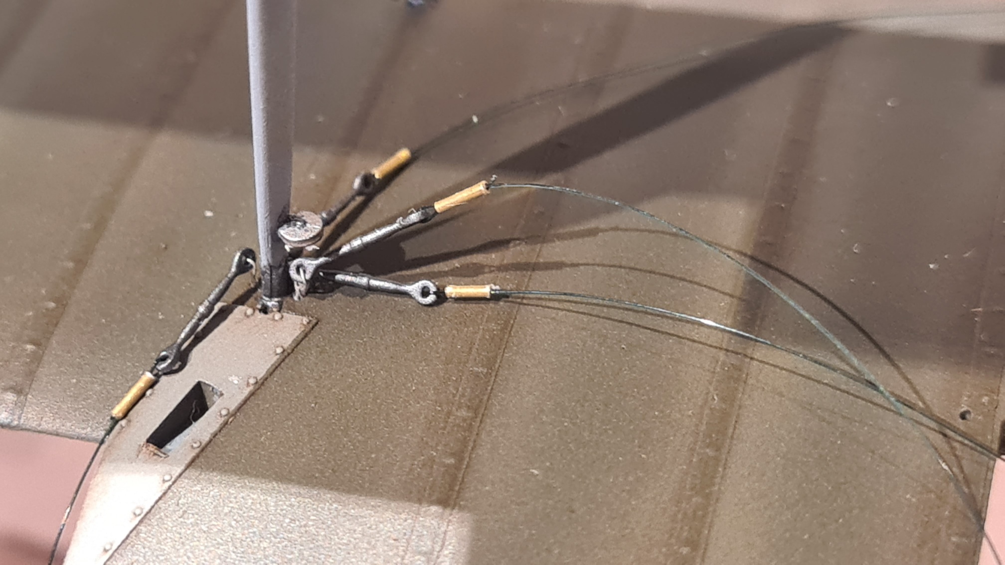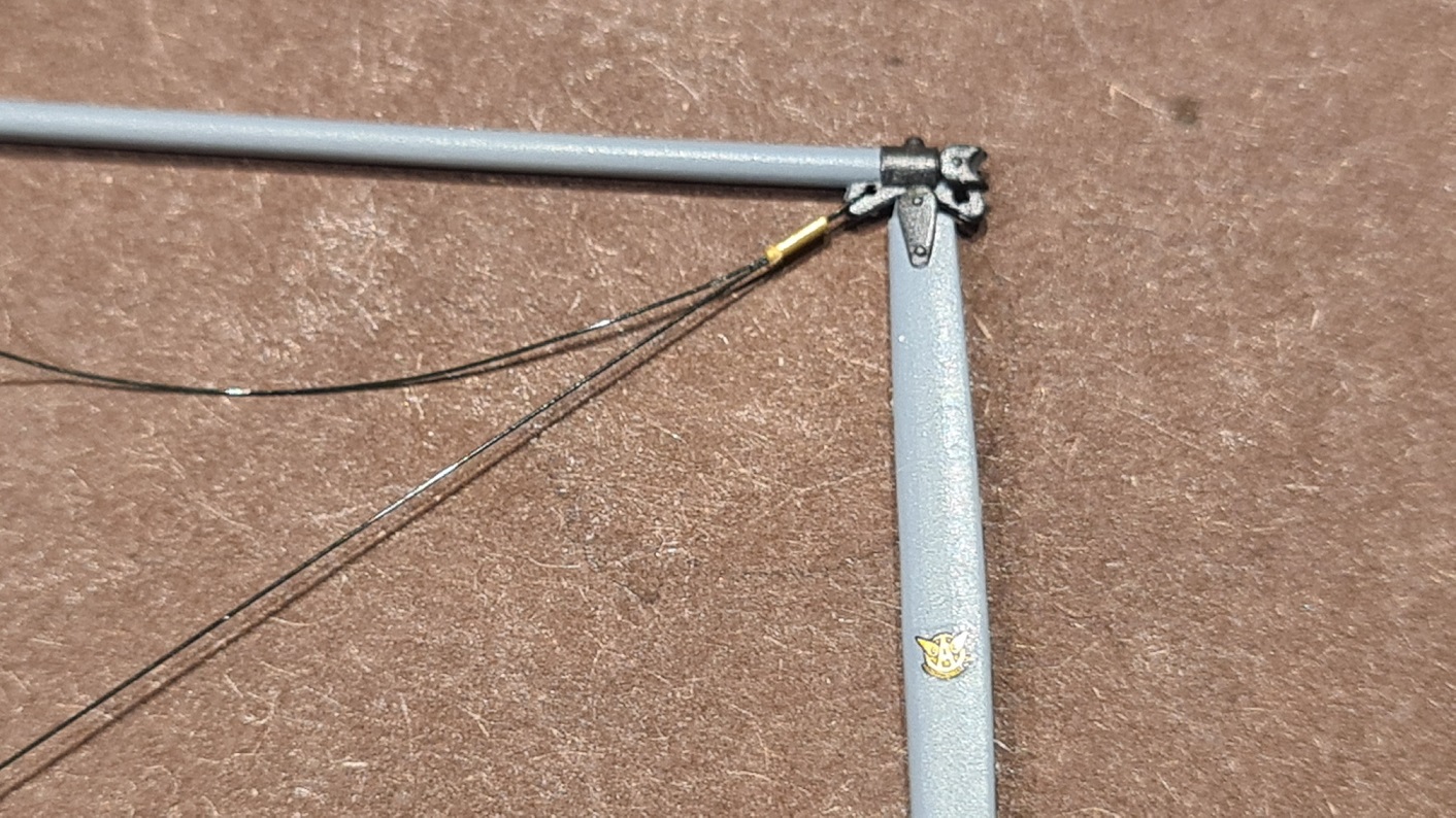 Im letzten Schritt wurden dann die Seile mit Vallejo Air Gunmetal bepinselt. Die Spannschlösser und Seilklemmen (ich weiß nicht, wie die heißen) wurden erst schwarz bepinselt, dann mit einer Mischung aus Gunmetal und Schwarz.