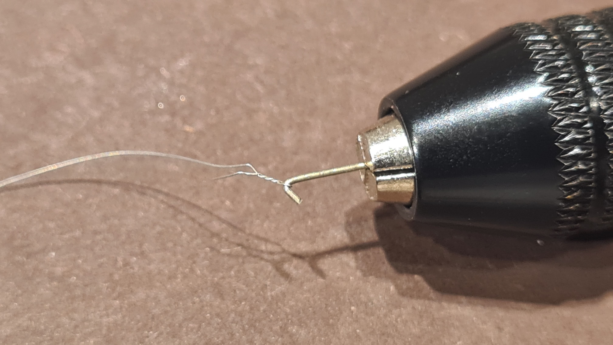 Die Drahtstücke etwas abgeschnitten und in das Bohrfutter eines Minihandbohrers geklemmt: