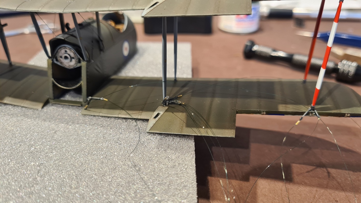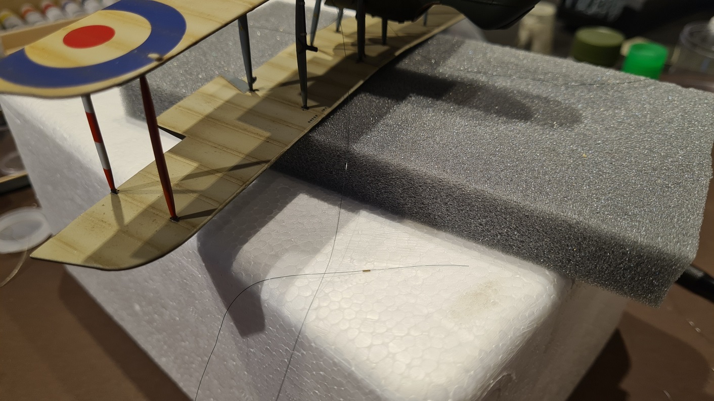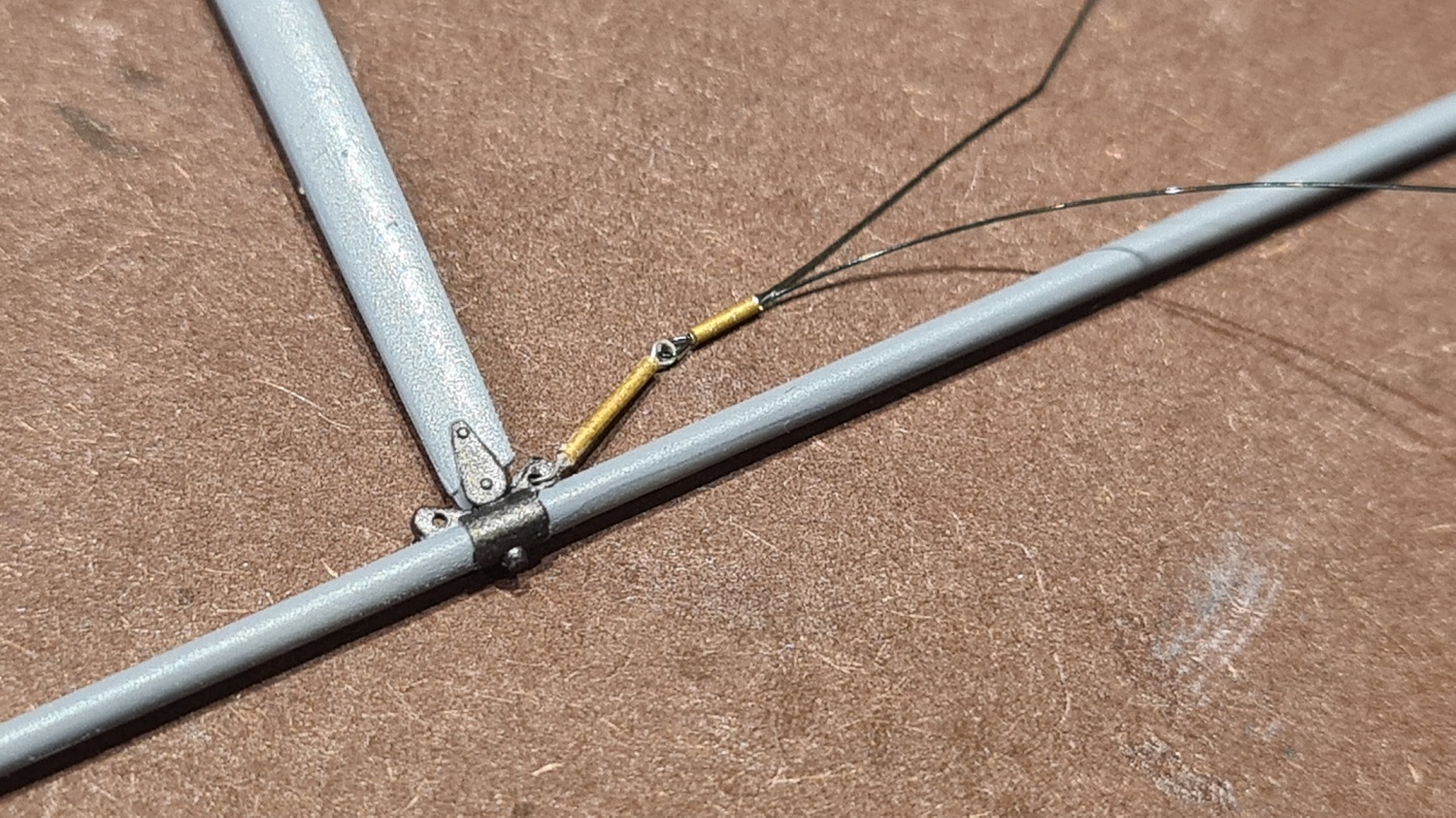 Nun besagt die Lehrbuchmeinung, dass man bei Doppeldeckern zuerst die Verspannungen auf der unteren Tragfläche anbringen soll, dann die obere Tragfläche aufsetzt und dann die vorgefertigten Schnüre an der oberen Tragfläche befestigt. So habe ich auch begonnen. Hier habe ich nun allerdings vorgefertigte Gaspatch-Spannschlösser genommen, diese auf der einen Seite mit Draht versehen und auf der anderen Seite mit Schnürchen. Alles in der eigentlich bekannten Art und Weise: