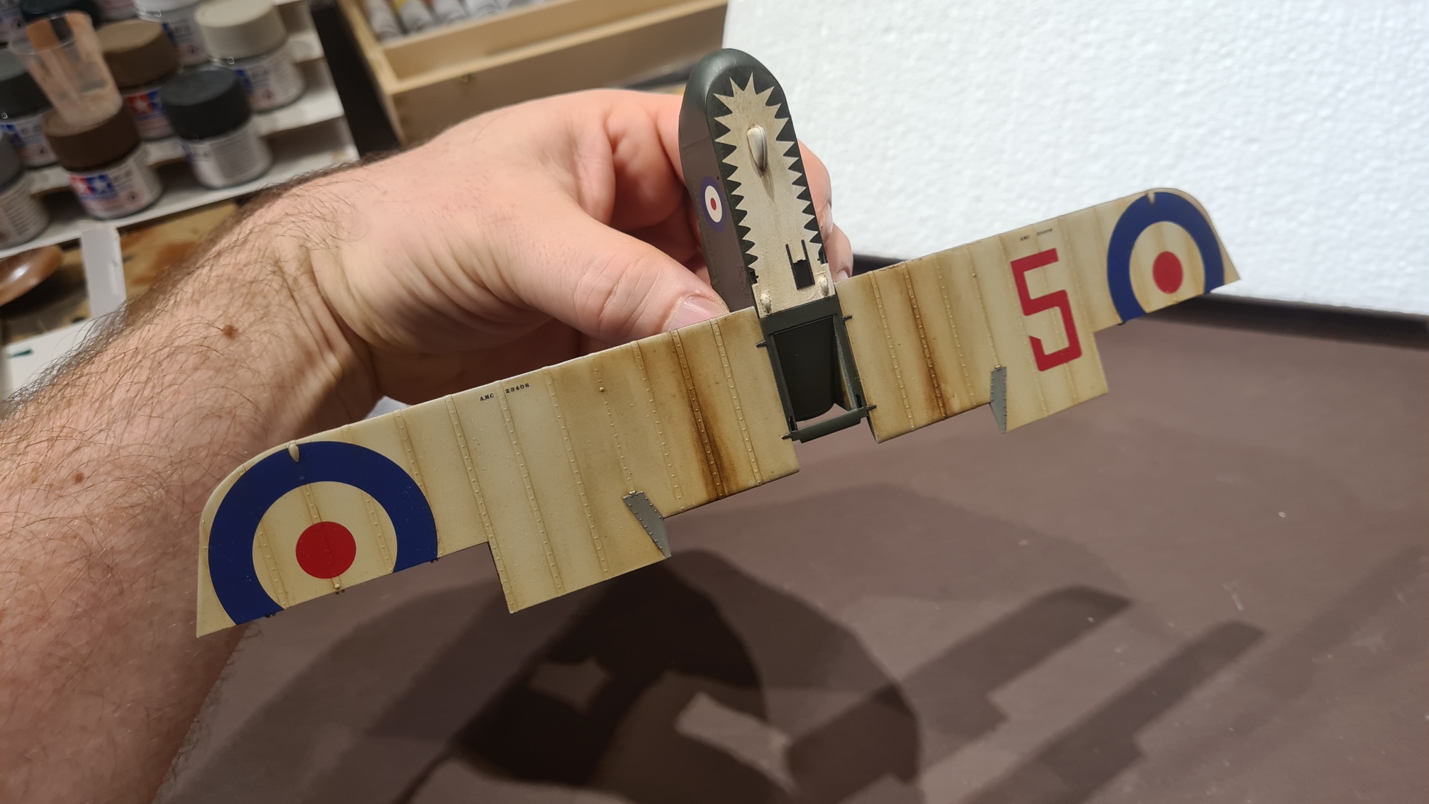 Die Gondel wurde zunächst mit der unteren Tragfläche verklebt Wer sich jetzt wundert, warum es die heftigen Verschmutzungen an der Unterseite gibt, dort ist mir ein Missgeschick passiert. Ich hatte unbemerkt schwarze Farbe an einem Finger und habe einen überaus deutlichen schwarzen Fingerabdruck hinterlassen. Es blieb mir nichts anderes übrig, als die oberste Farbschicht (oder besser gesagt) Lackschicht vorsichtig zu entfernen. Damit waren hier alle Alterungen verschwunden. Die Stelle liegt aber genau über einem Rad. Und da wird sich ohnehin mehr Dreck abgesetzt haben. Mein Flieger ist da einmal in der Matsche gelandet. Wenn man es nicht weiß, wird man das Problem nicht erkennen und denken, dass es so beabsichtigt war.