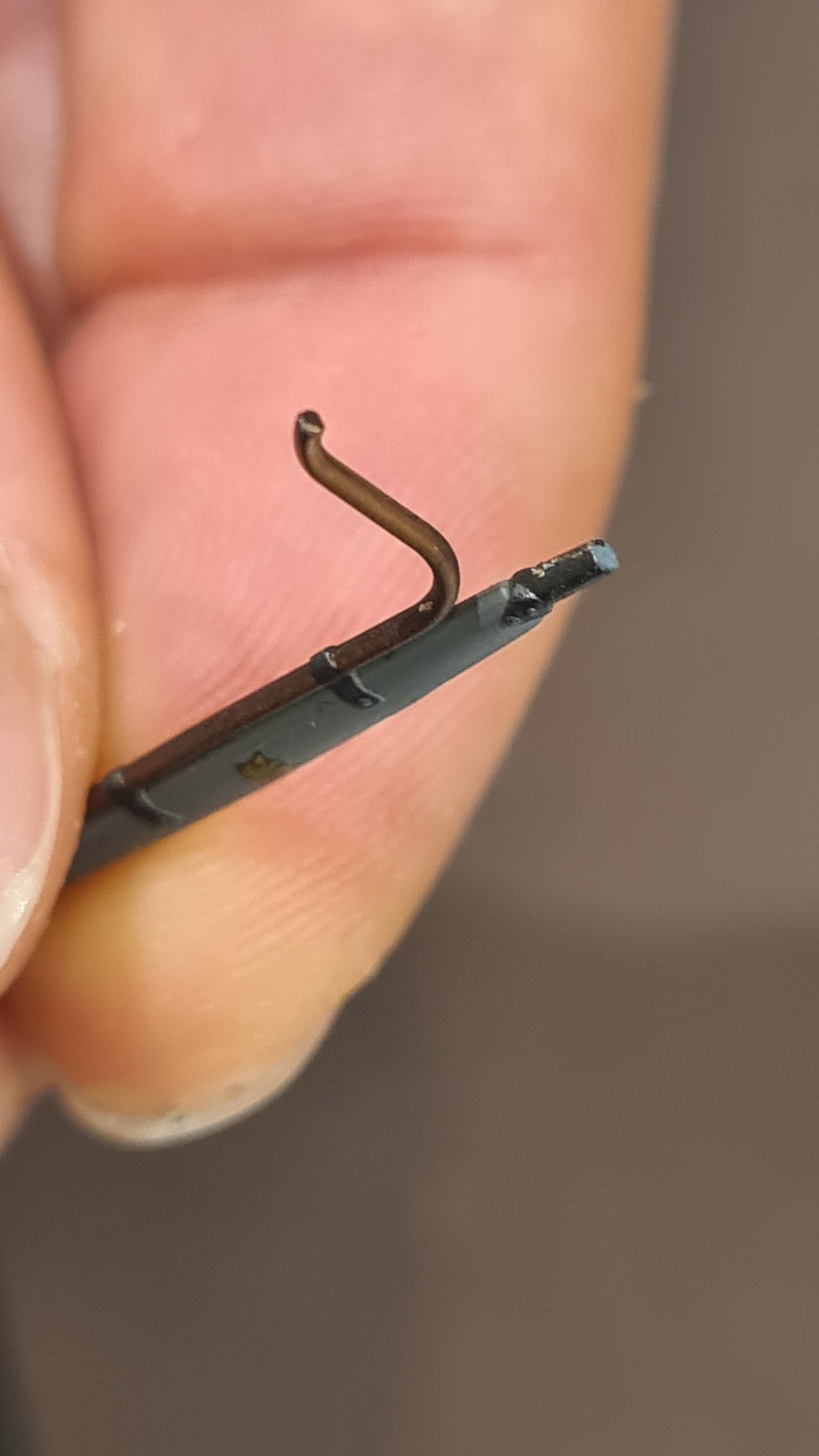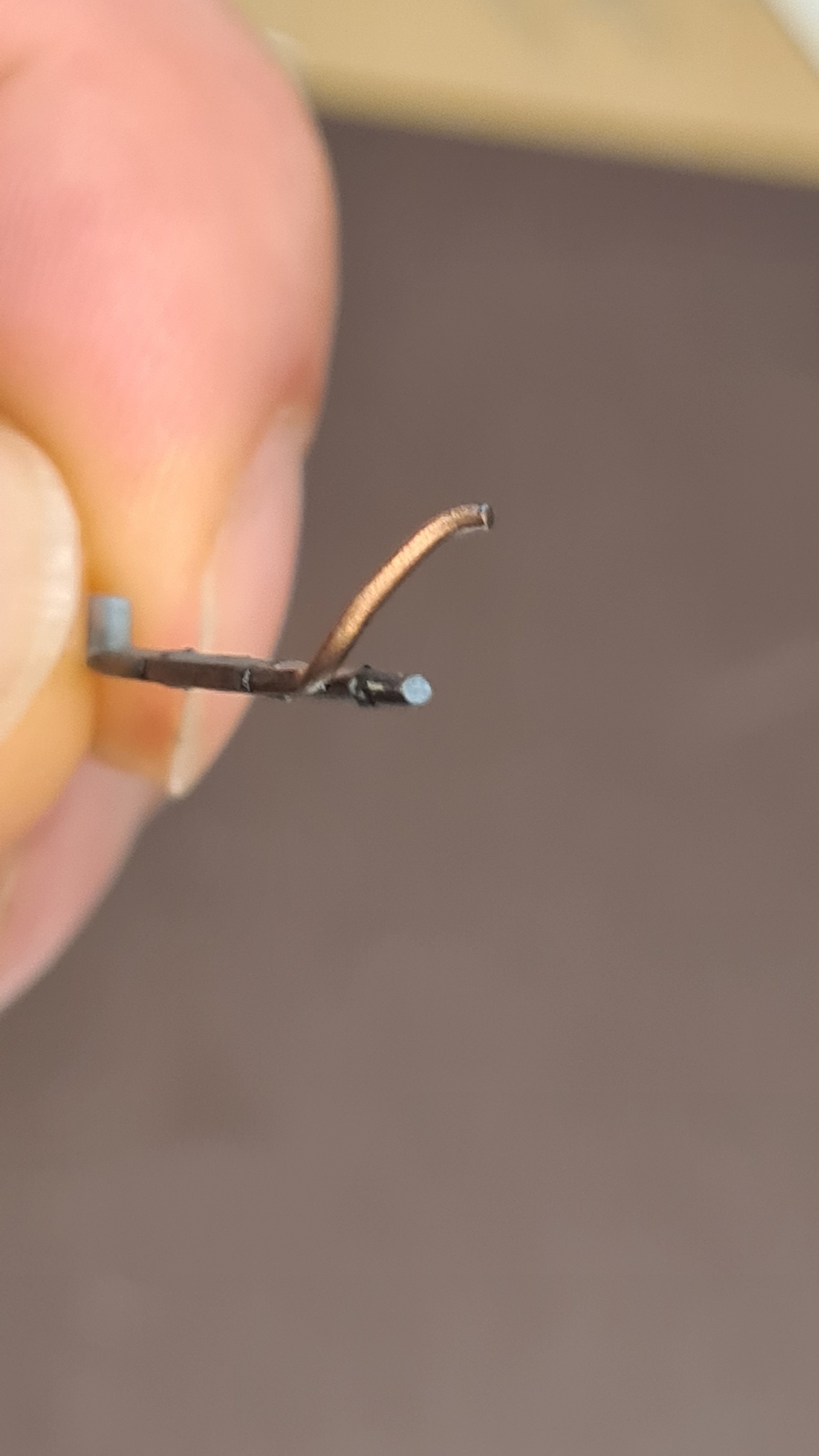 Relativ kurz abgeschnitten (so ca. 1-2mm) und in ein Albion Alloys Röhrchen (Innendurchmesser 0.3mm, Außendurchmesser 0.5mm) gesteckt und mit Sekundenkleber (roter Pattex) geklebt. Die Röhrchen kann man mit einem Bastelmesser durchtrennen, hab ich schonmal irgendwo beschrieben. Noch wichtig: der Kleber ist nur sehr kurz verwendbar, weil nur kurzfristig ausreichend flüssig, dass er ordentlich ins Röhrchen fließt. Also nur wenig auf ein Stück Alu-Folie oder ähnliches geben und mit einem dünnen Drahtstück einen Tropfen aufnehmen und damit verkleben.
