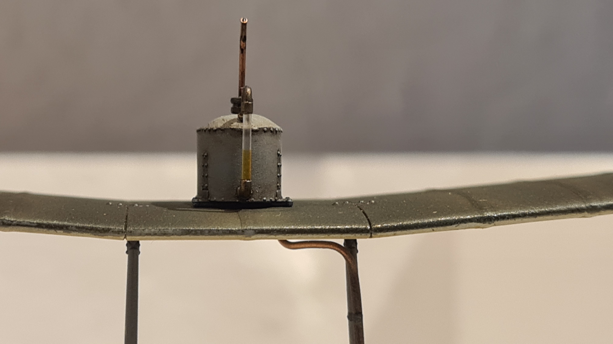 Darauf die obere Tragfläche zu setzen, ist ein Himmelfahrtskommando. Aber auch so zeigte sich direkt ein Problem mit dem Tank und der Tankleitung. Was haben die bei WnW geraucht? Die Tankleitung endet vor dem Flügel, einfach so: