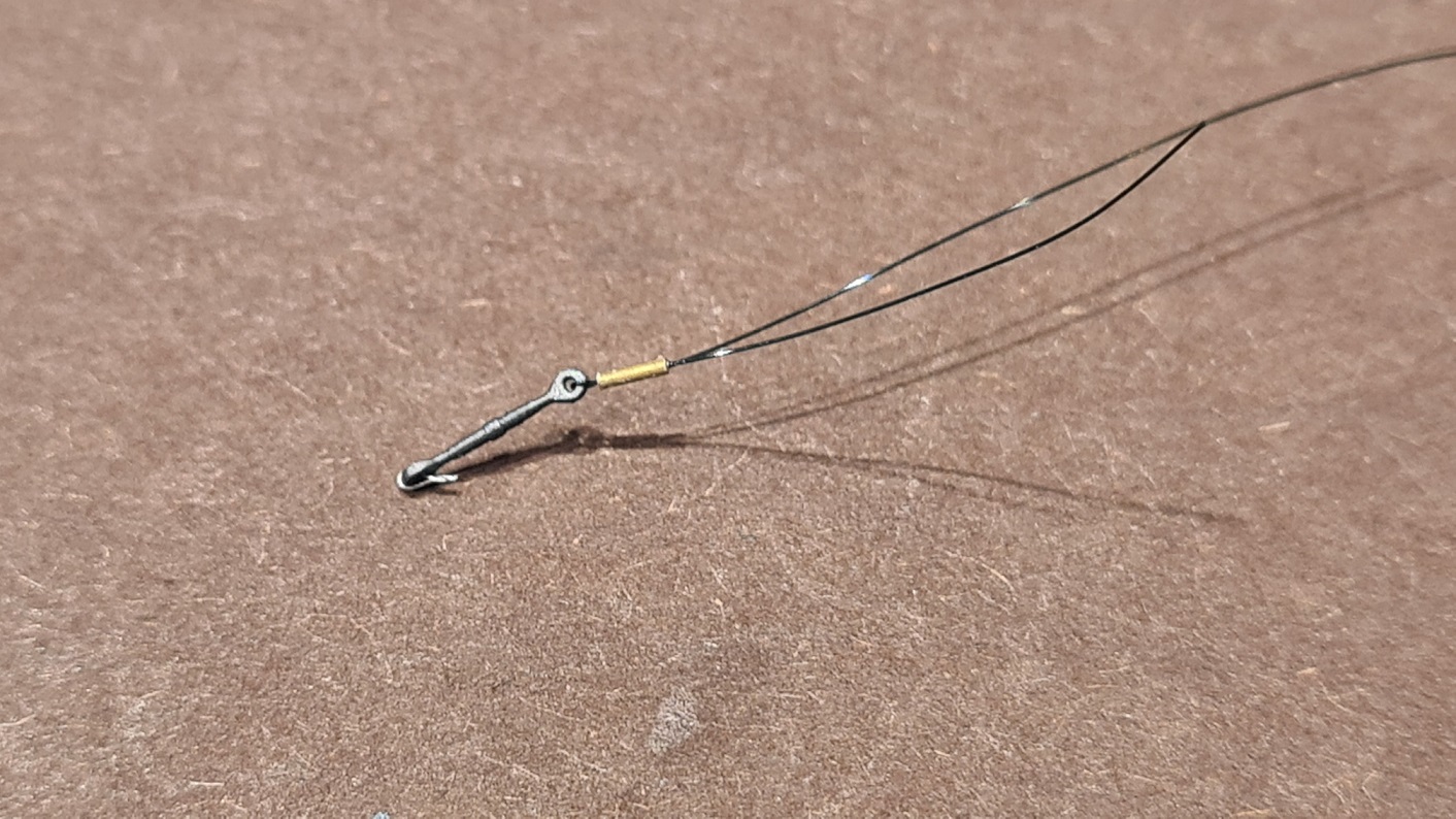 Jetzt kommt die Angelschnur. Wird durch ein Messingröhrchen gefädelt, dann durch die Spannschloss-Öse und dann zurück durch das Messingröhrchen.