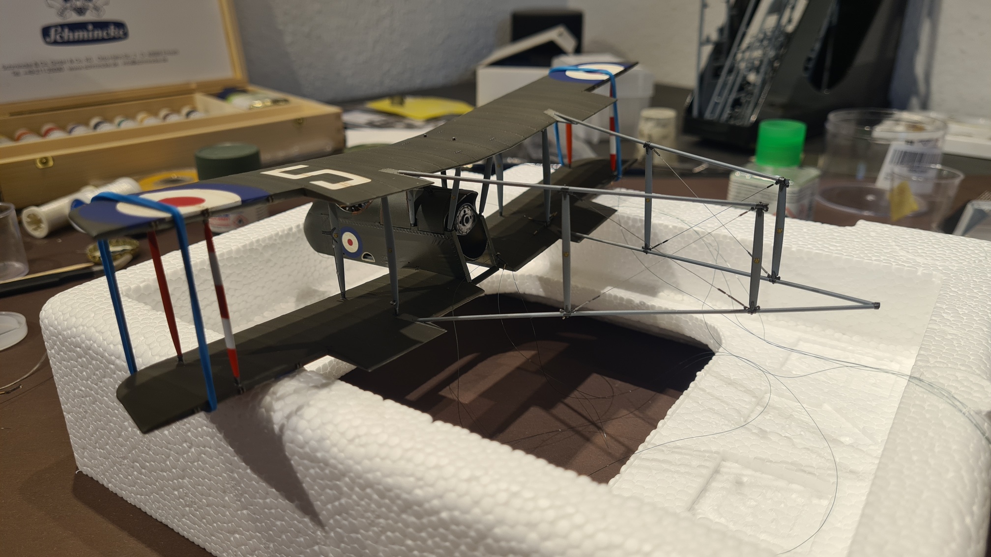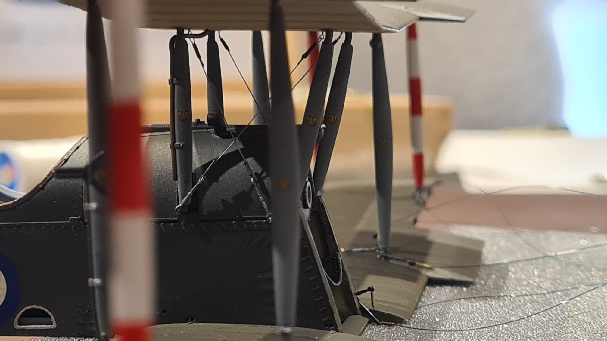 Wie sich gezeigt hat, sind alle Stellen eigentlich noch einigermaßen zugänglich, auch wenn die obere Hälfte aufgesetzt ist. Eine sehr wichtige Info. Denn es hat sich herausgestellt, dass die Tragflächen nicht 100% so zueinander stehen, wie es am Ende sein soll. Außerdem ist es sehr unpraktisch, wenn alles hin-und herwackeln kann. Und noch viel schlimmer. Alles wieder auseinander nehmen und mit etwa 40 baumelnden Fäden hinterher zusammenzustecken schien mir sehr schwierig. Ich habe mich daher dazu durchgerungen, bereits zu diesem Zeitpunkt die Tragflächen miteinander über die Stützen zu verkleben. Die Schwanzstreben habe ich dazu eingesteckt und zur besseren Ausrichtung genutzt. Die Flügel wurden mit nicht zu streffen Gummiringen fixiert.