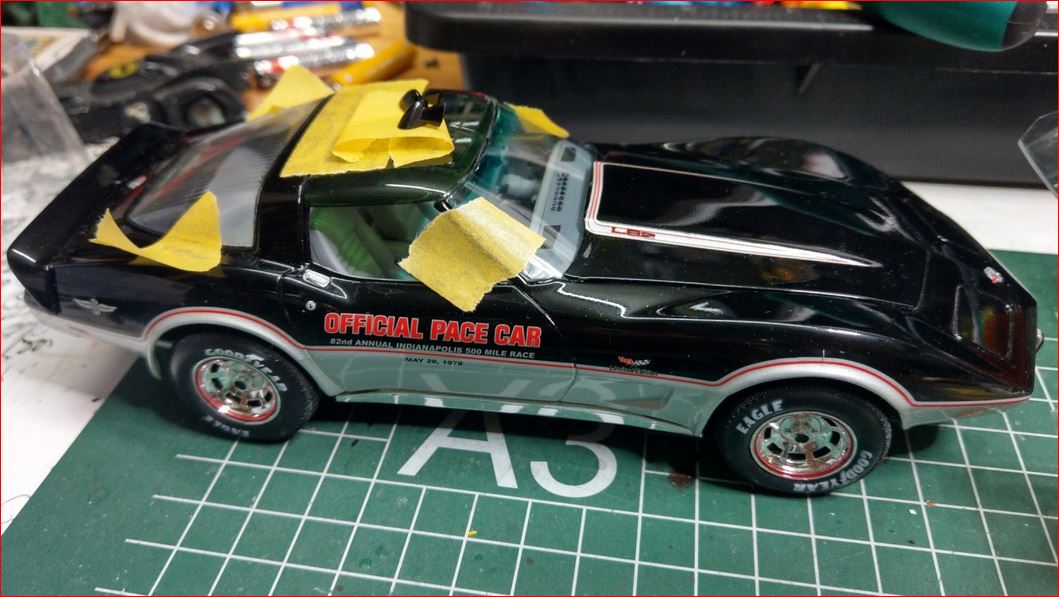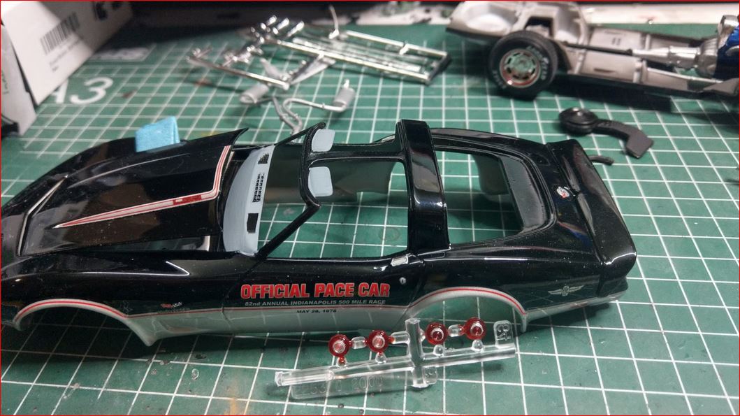 An meinem PaceCar geht es auf die Zielgerade. Nach einer kurzen Recherche, muss ich den inneren Absatz unter der Heckscheibe noch Antrazit lackieren. Der T-Top-Steg soll poliertes Edelstahl sein.