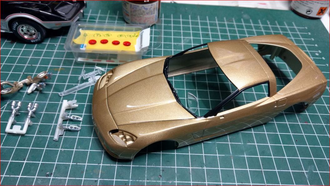 -> Bei der goldenen C6 nutzte ich von Tamiya das klare Grün. Wie man sieht, ist es nicht klar genug und beim Lackieren nebelte es doch sehr stark, so das ich die Scheibe nacharbeiten musste. Daraus resultiert der scharfer Rand am Streifen unten.