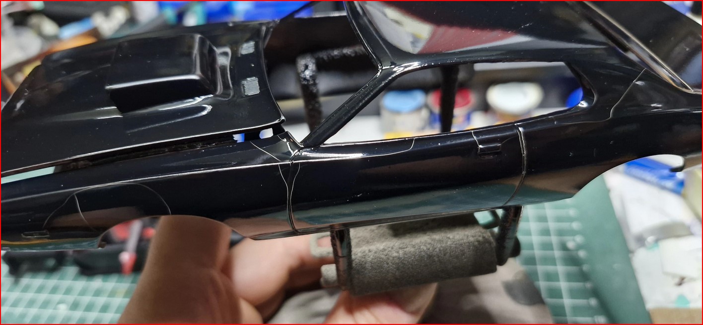 Ebenfalls grundiert, nass geschliffen und Dosenlackierung drauf. Eine klassische Farbe meiner Meinung aus den 1970er. Die habe ich "übrig", als ich für meinen 1977er Firebird die richtige Farbe suchte. Es könnten also zukünftig noch mehr Autos in türkis-grün-Farbtönen in mein Regal rollen. Die Lackierung lief bisher richtig gut. Zwei Schichten Klarlack, keine Einschlüsse, wie immer keine Politur.