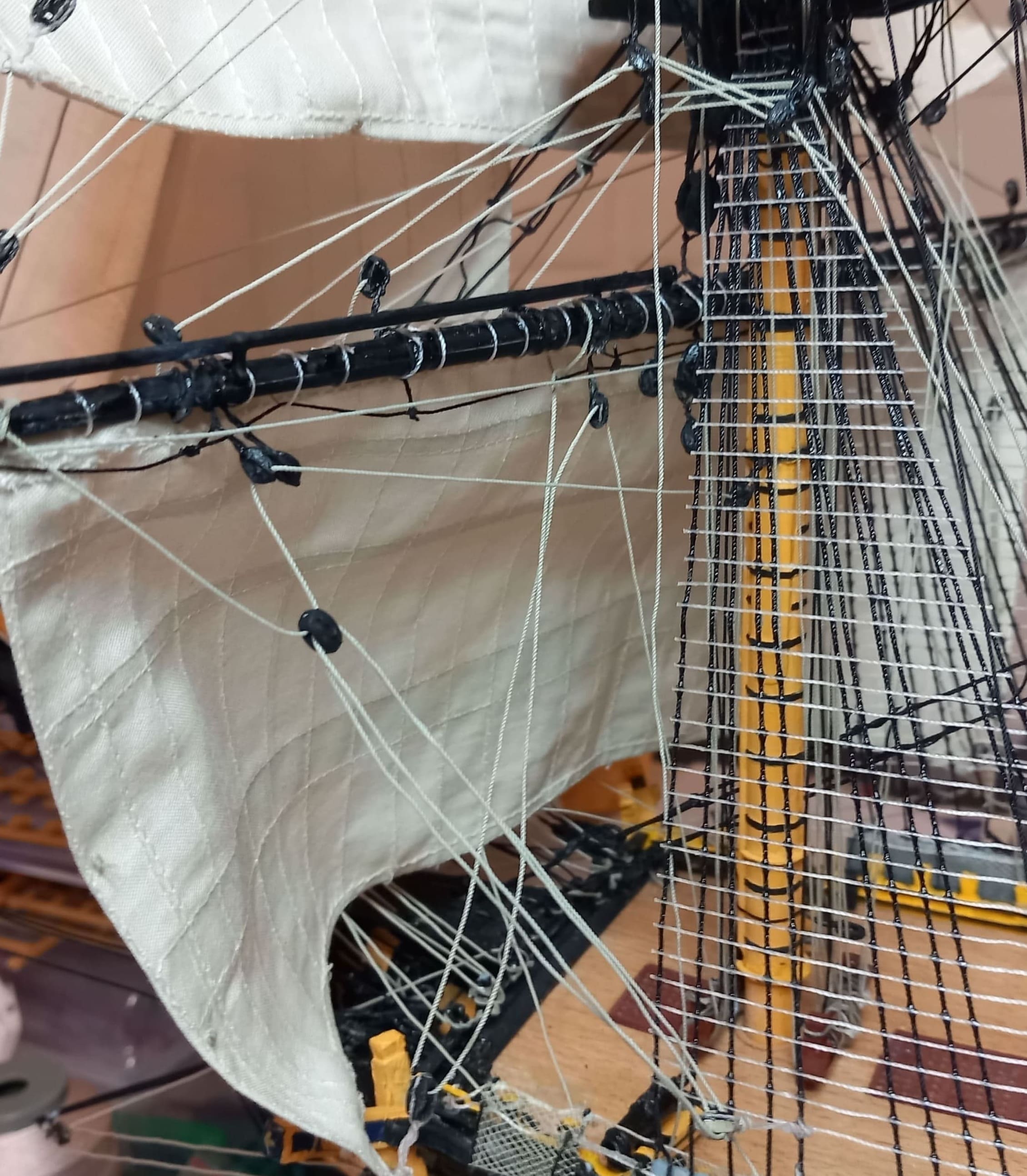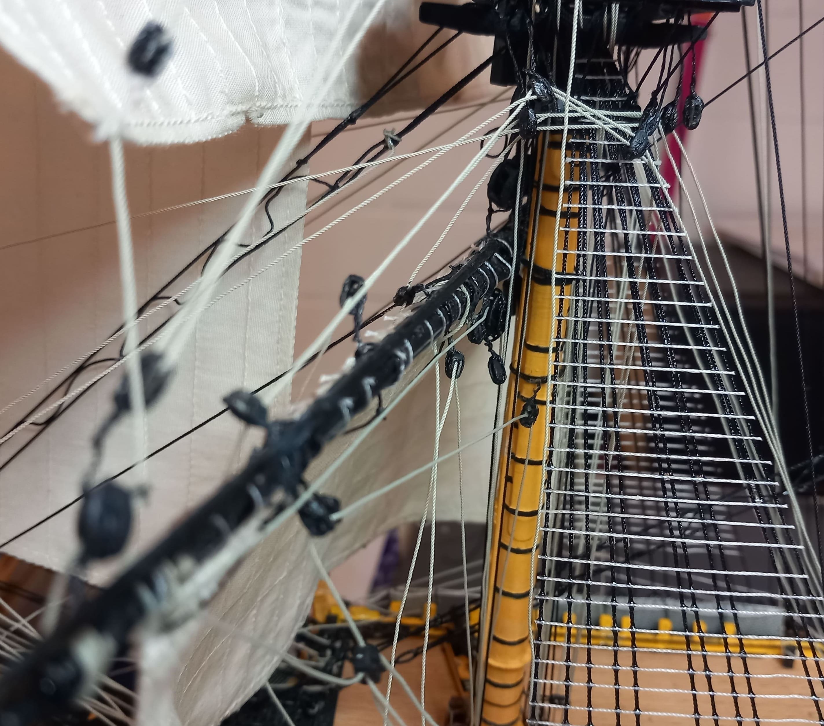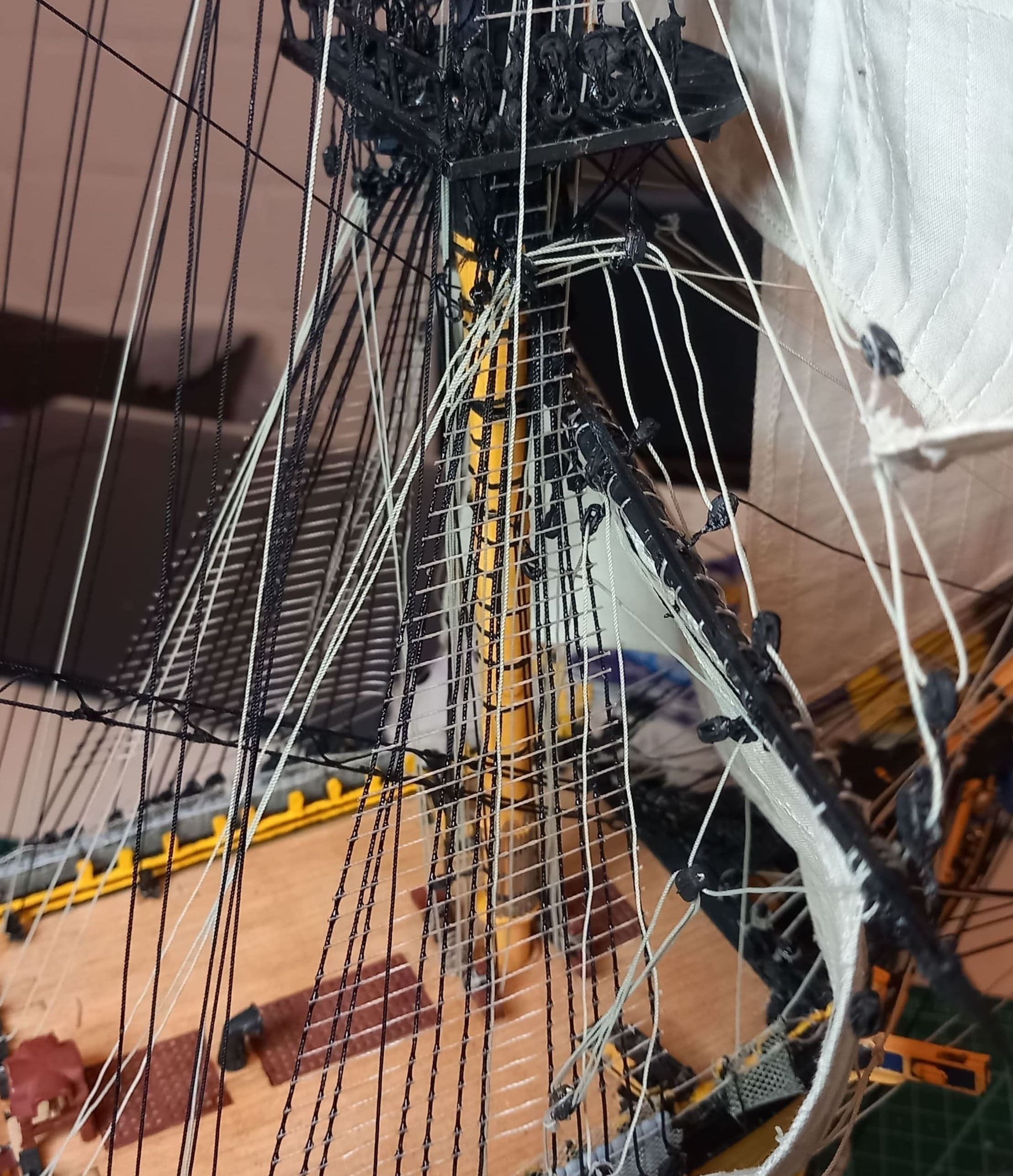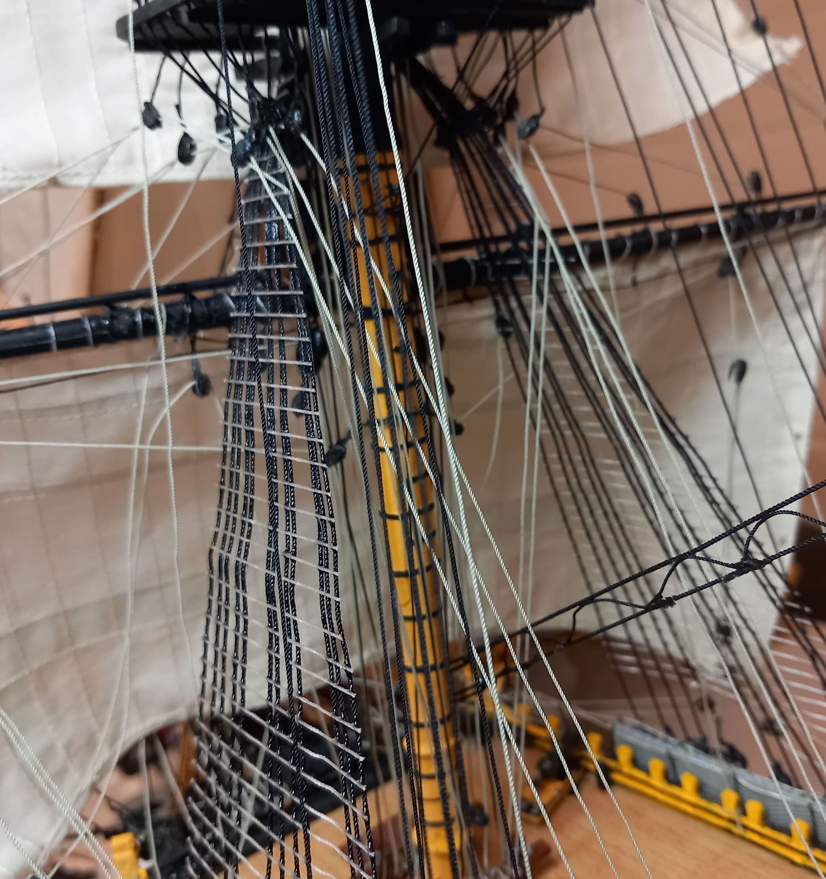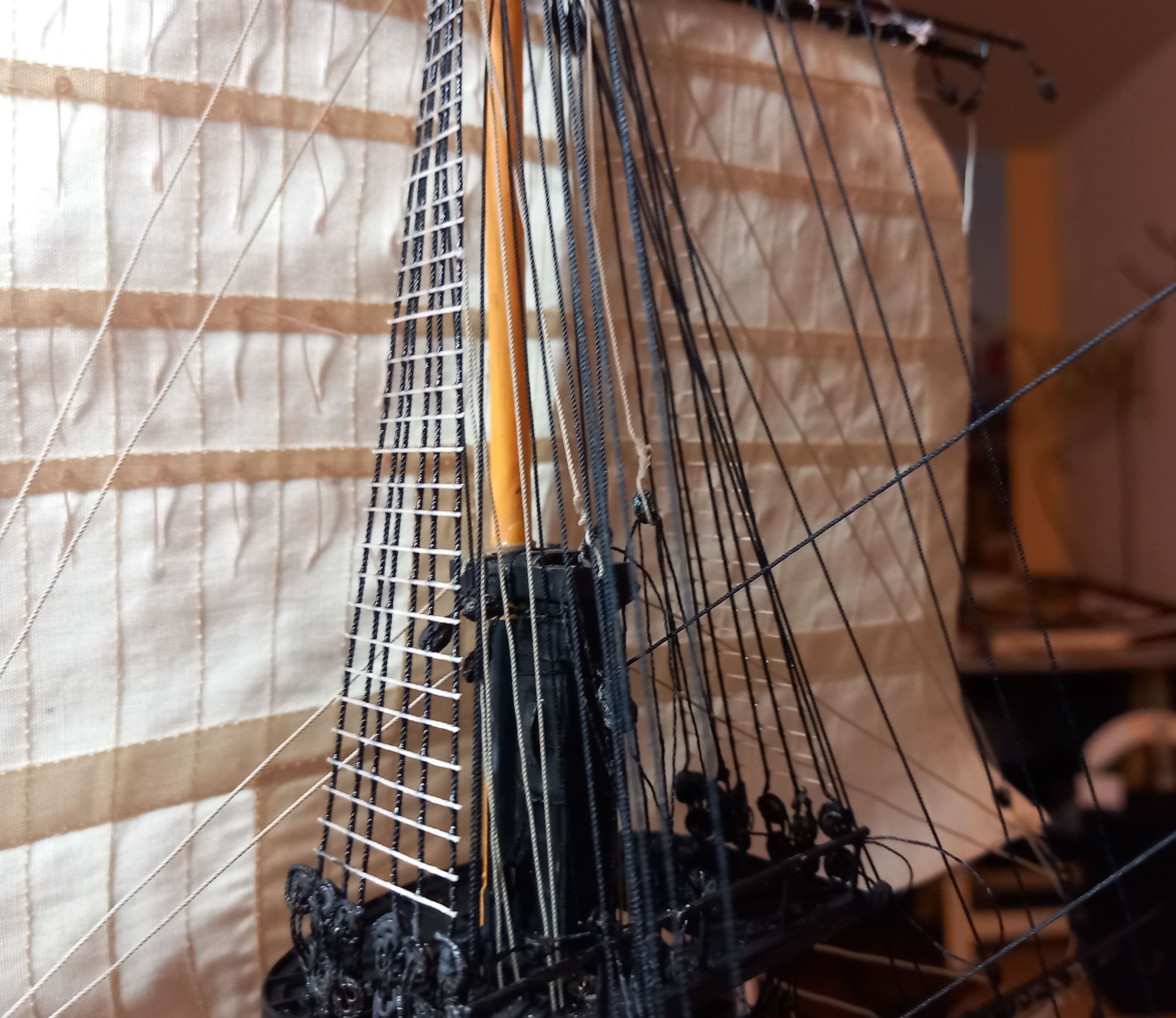 Die gibt mir ein paar Rätsel auf. Ich meine das Tau von der Rahnock nach innen an den Mast und nach unten an die Wanten .