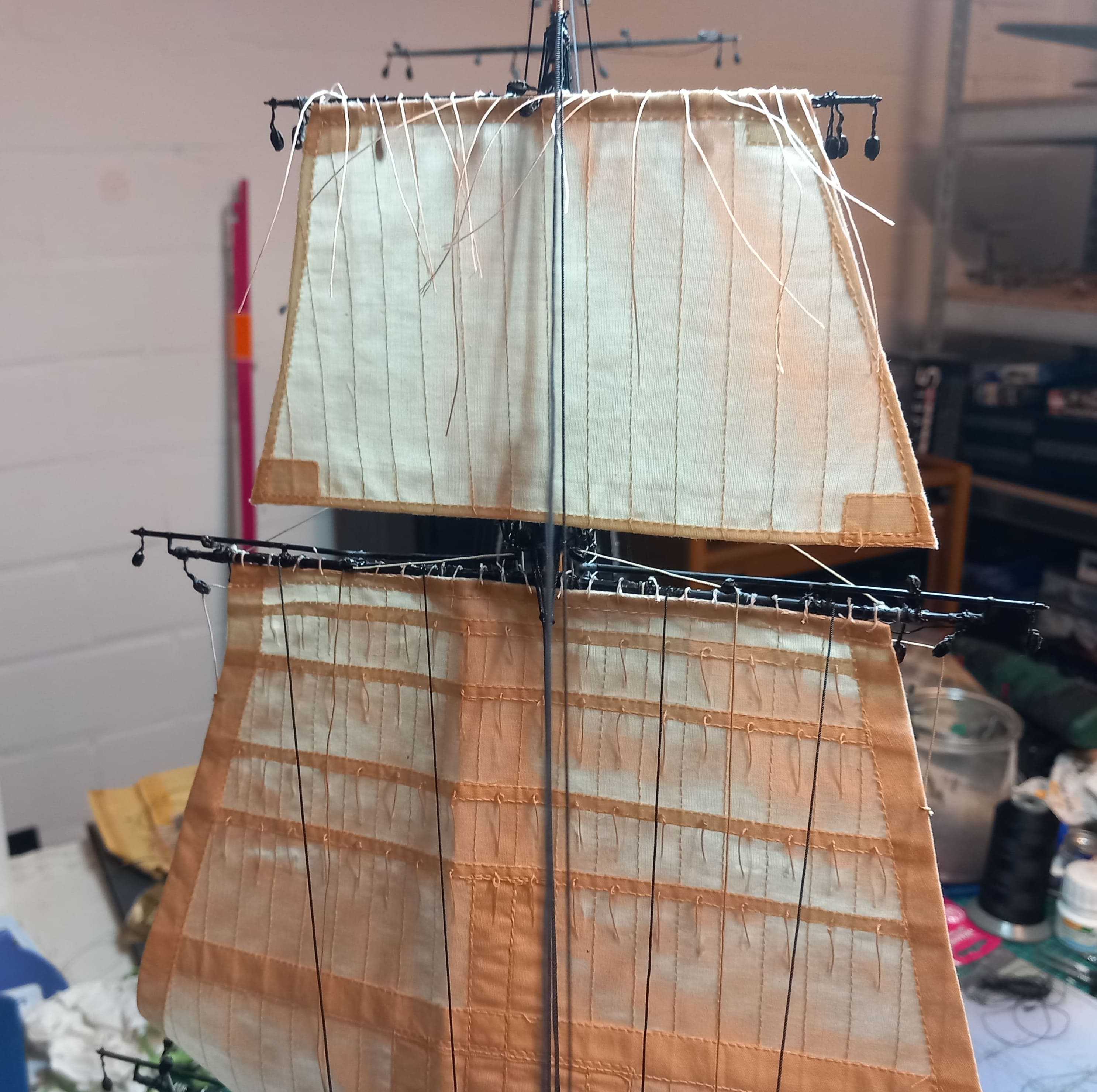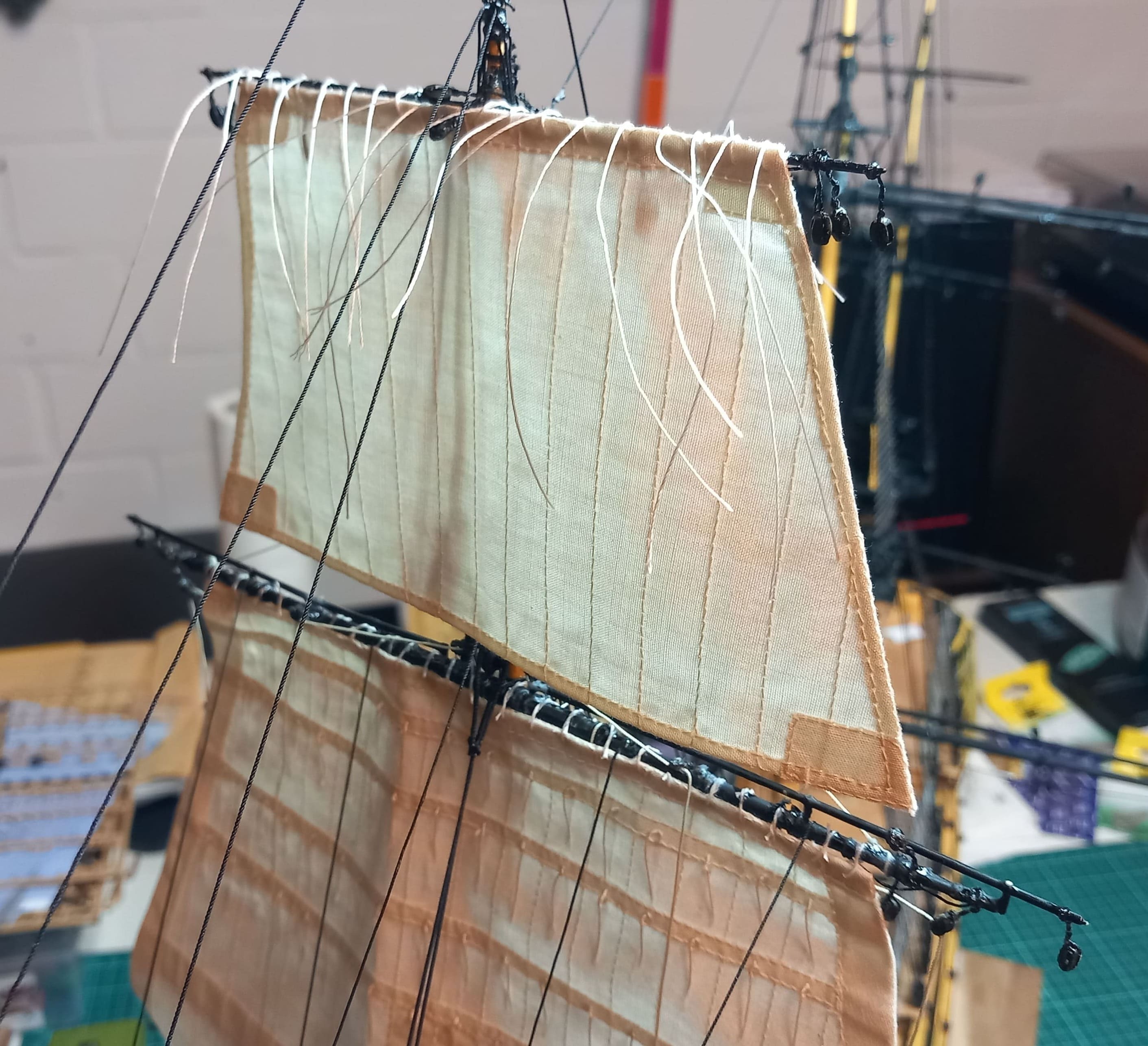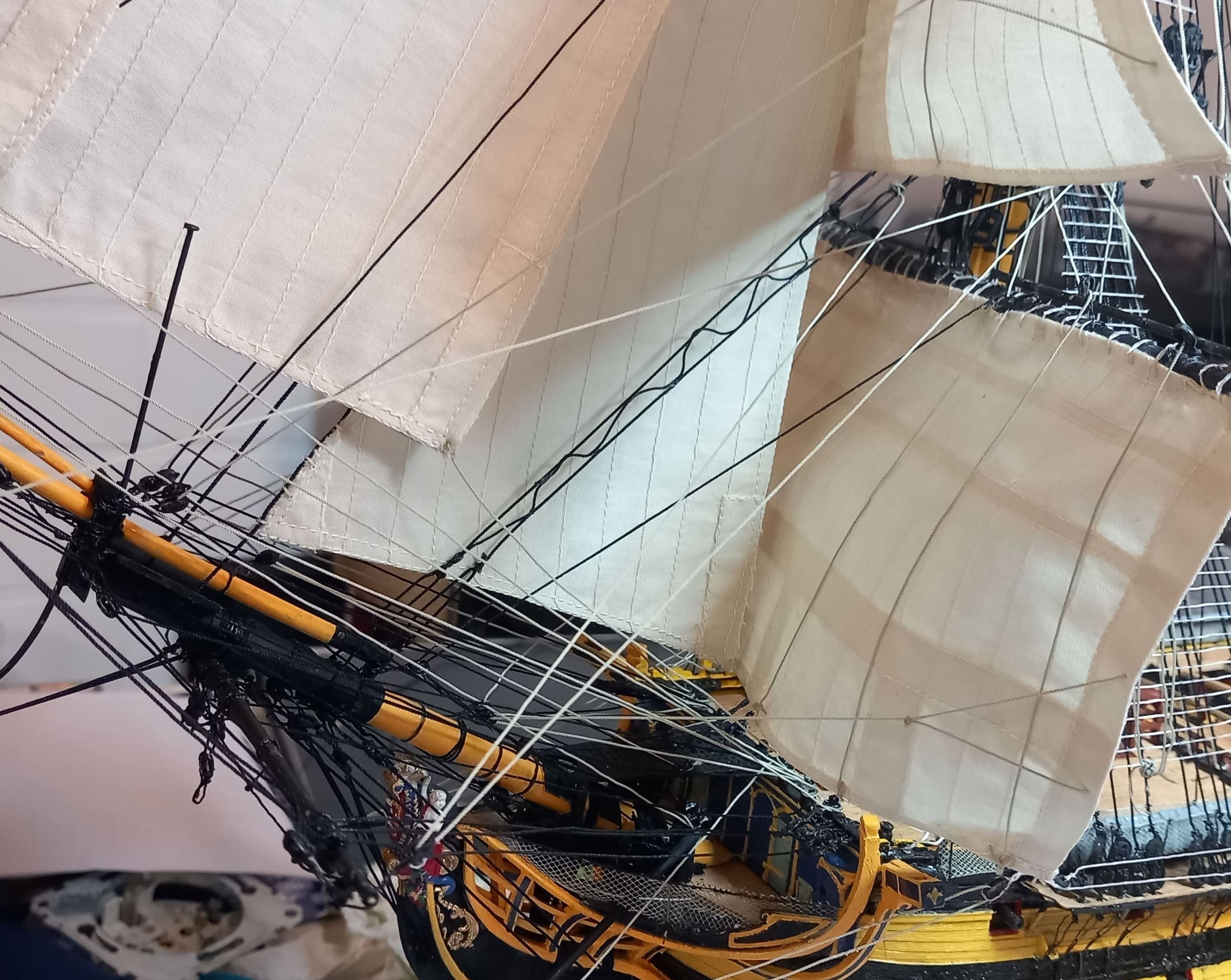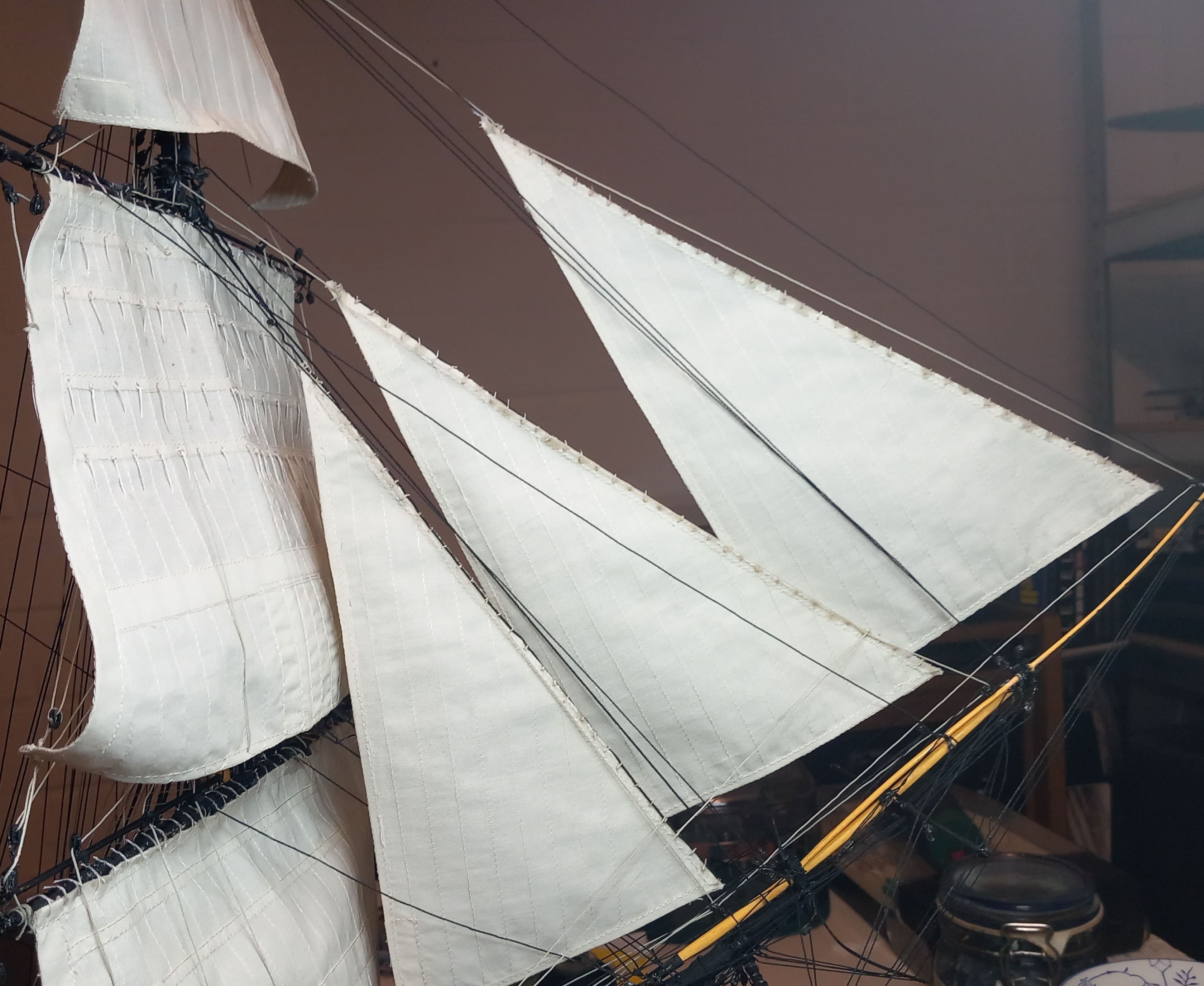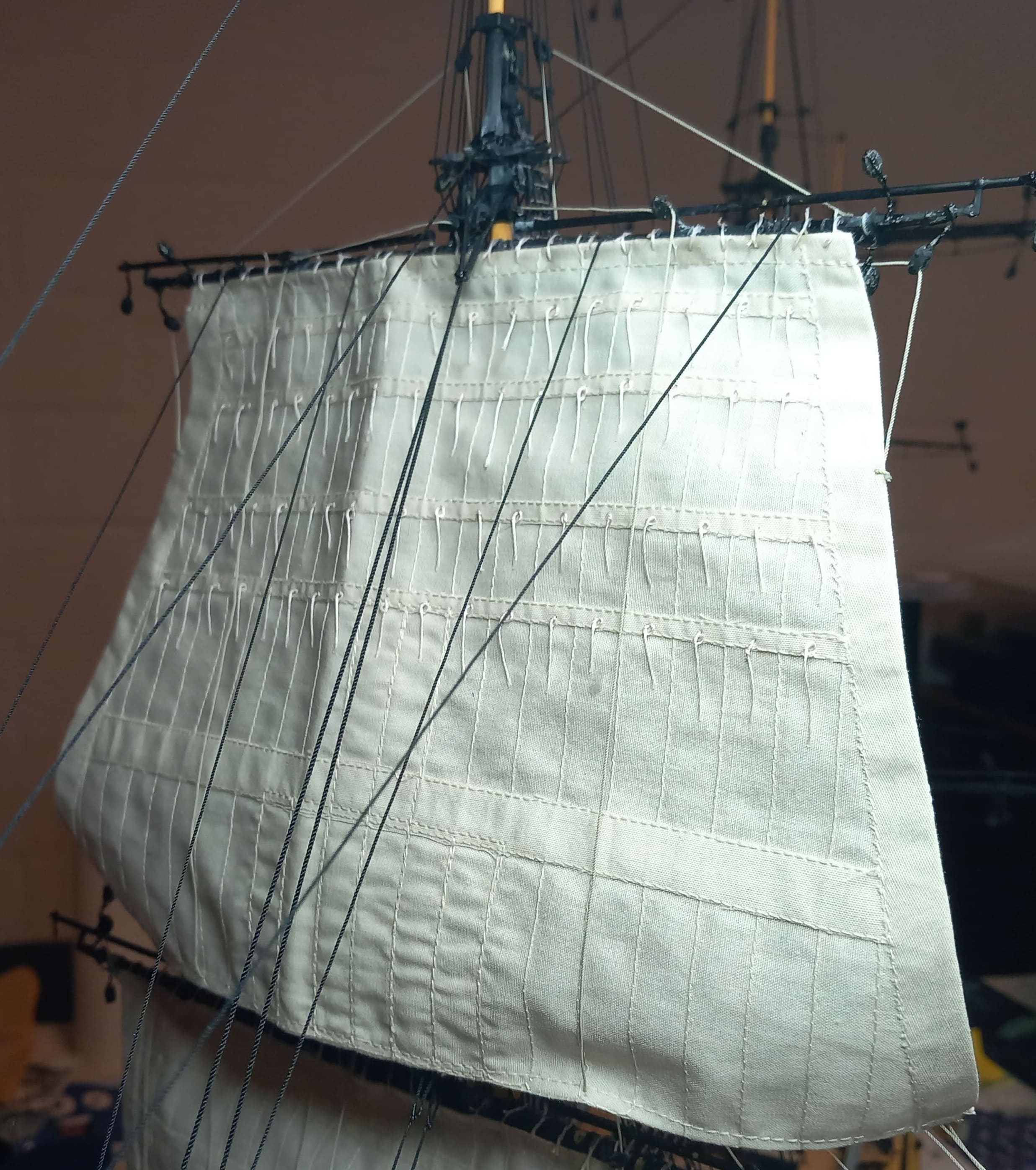 Die gibt mir ein paar Rätsel auf. Ich meine das Tau von der Rahnock nach innen an den Mast und nach unten an die Wanten .