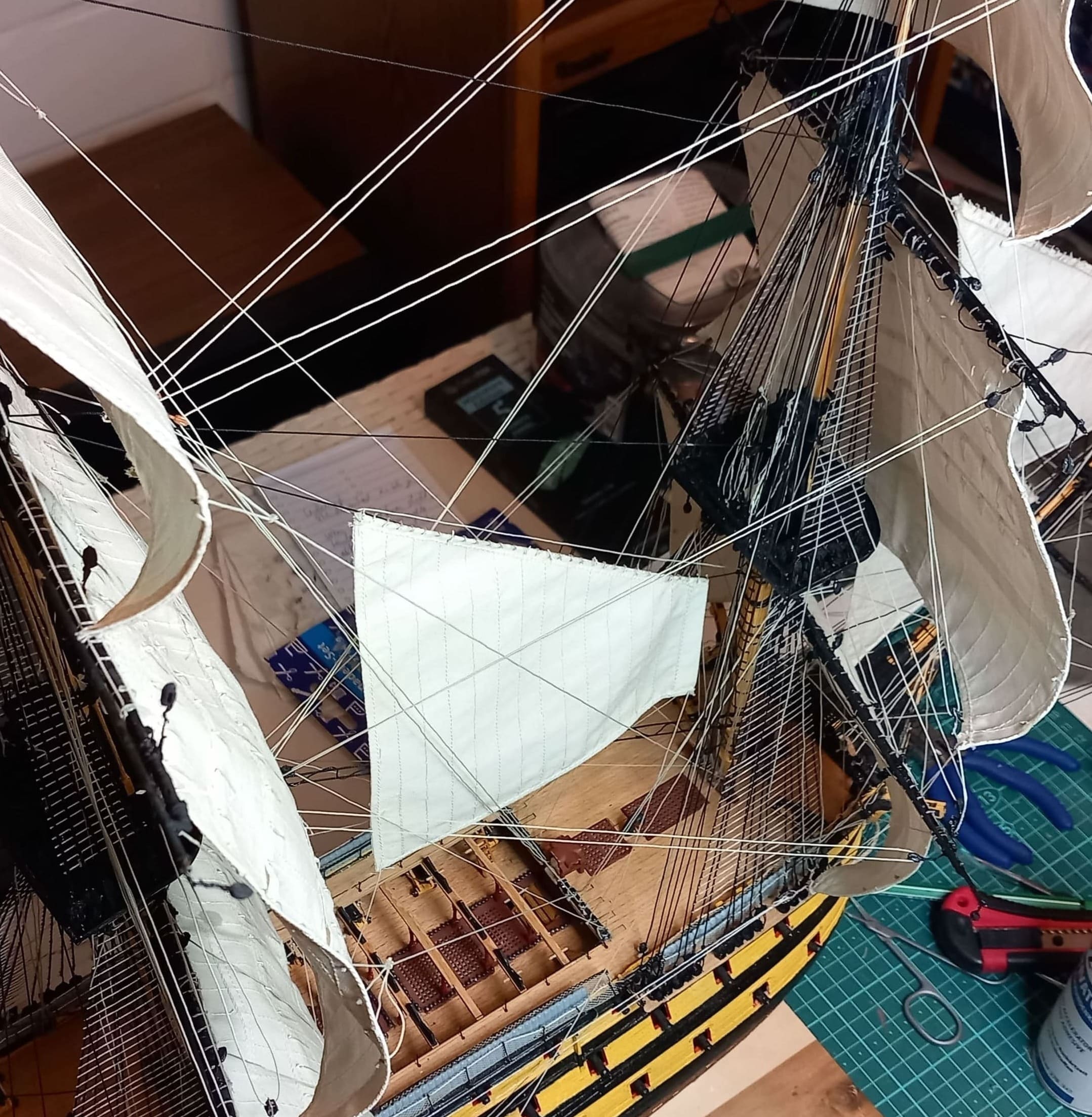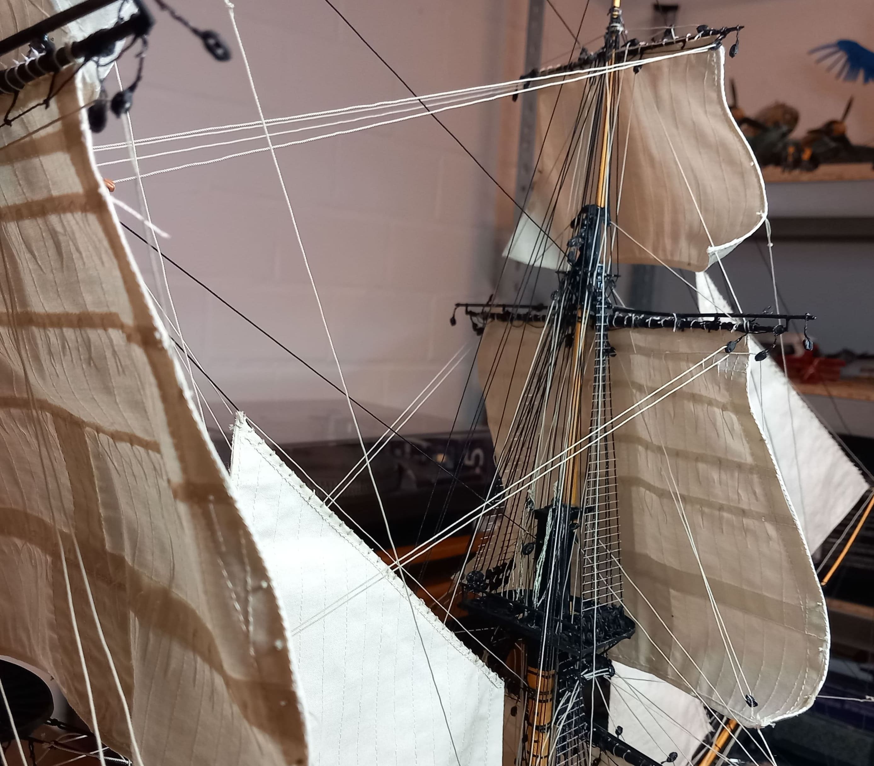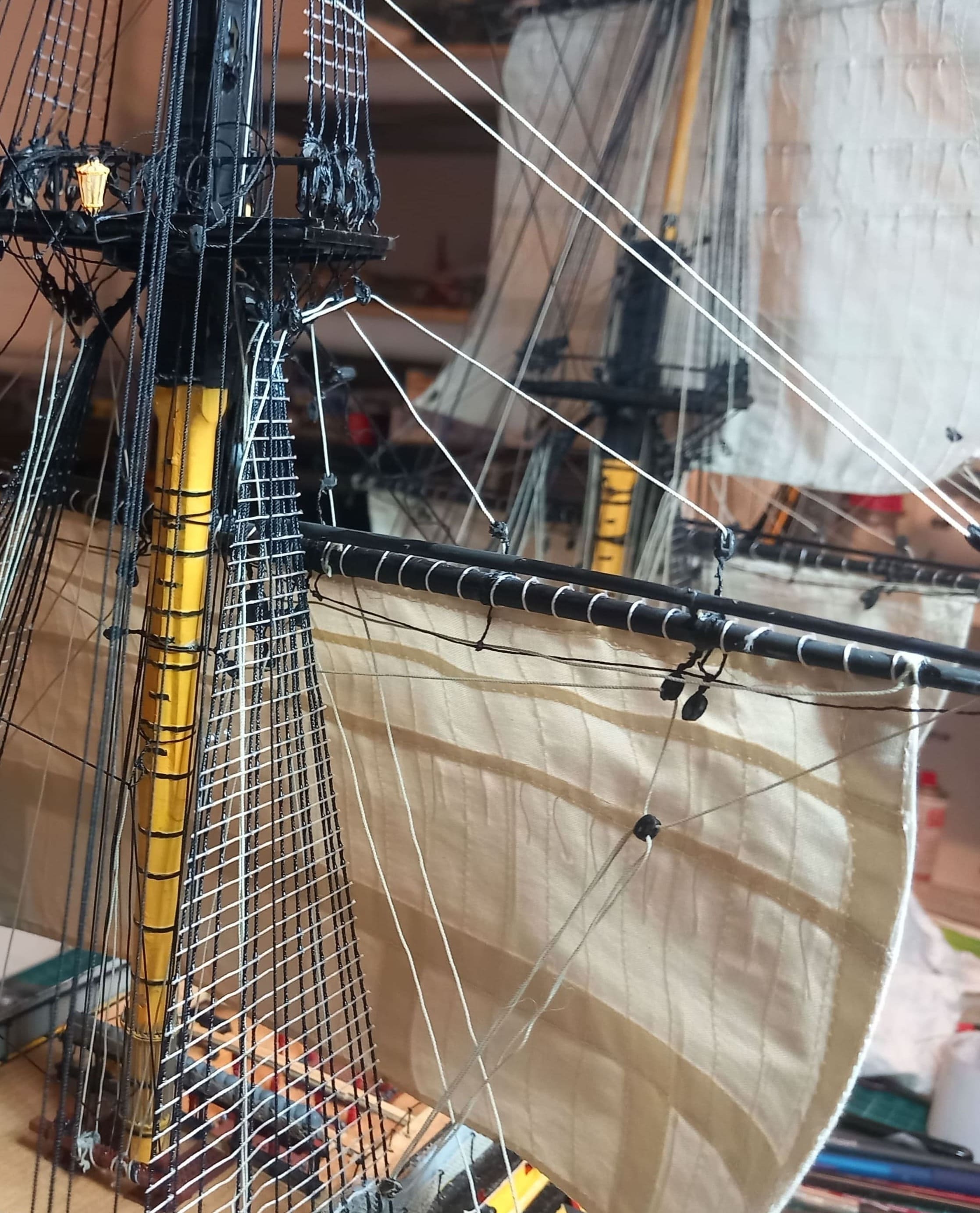 Danke für das Angebot, Daniel. Aber ich habe noch Blöcke genug, z.B. von der United States .Kreuzsegel und Kreuzbramsegel sind auch gesetzt. Die Taue sind gezogen. Jetzt habe ich in der original Anleitung gesehen, daß an der Hinterseite vom Hauptmast noch 6 Blöcke angebracht werden sollen. Ich frage mich warum das nicht bei der Vorbereitung des Hauptmastes aufgeführt ist. Jetzt ist das Anbringen der Blöcke alles andere als einfach. Taue und Wanten behindern das Anbringen.