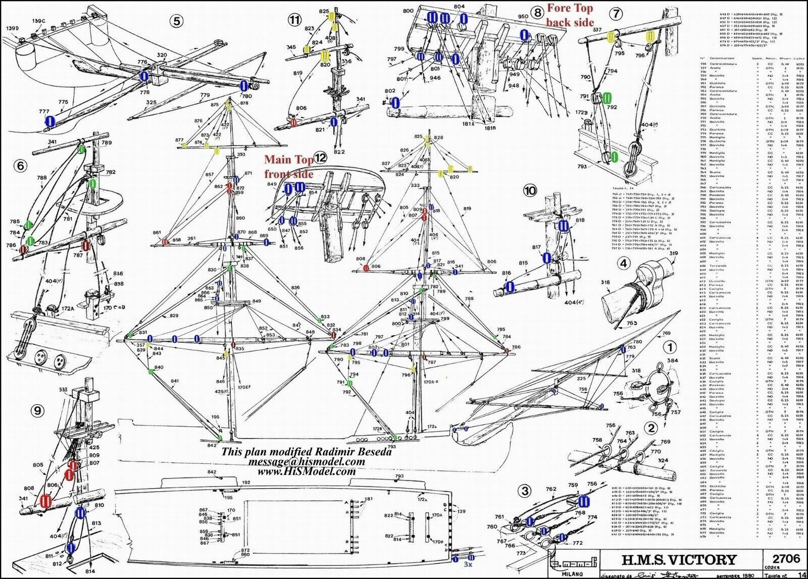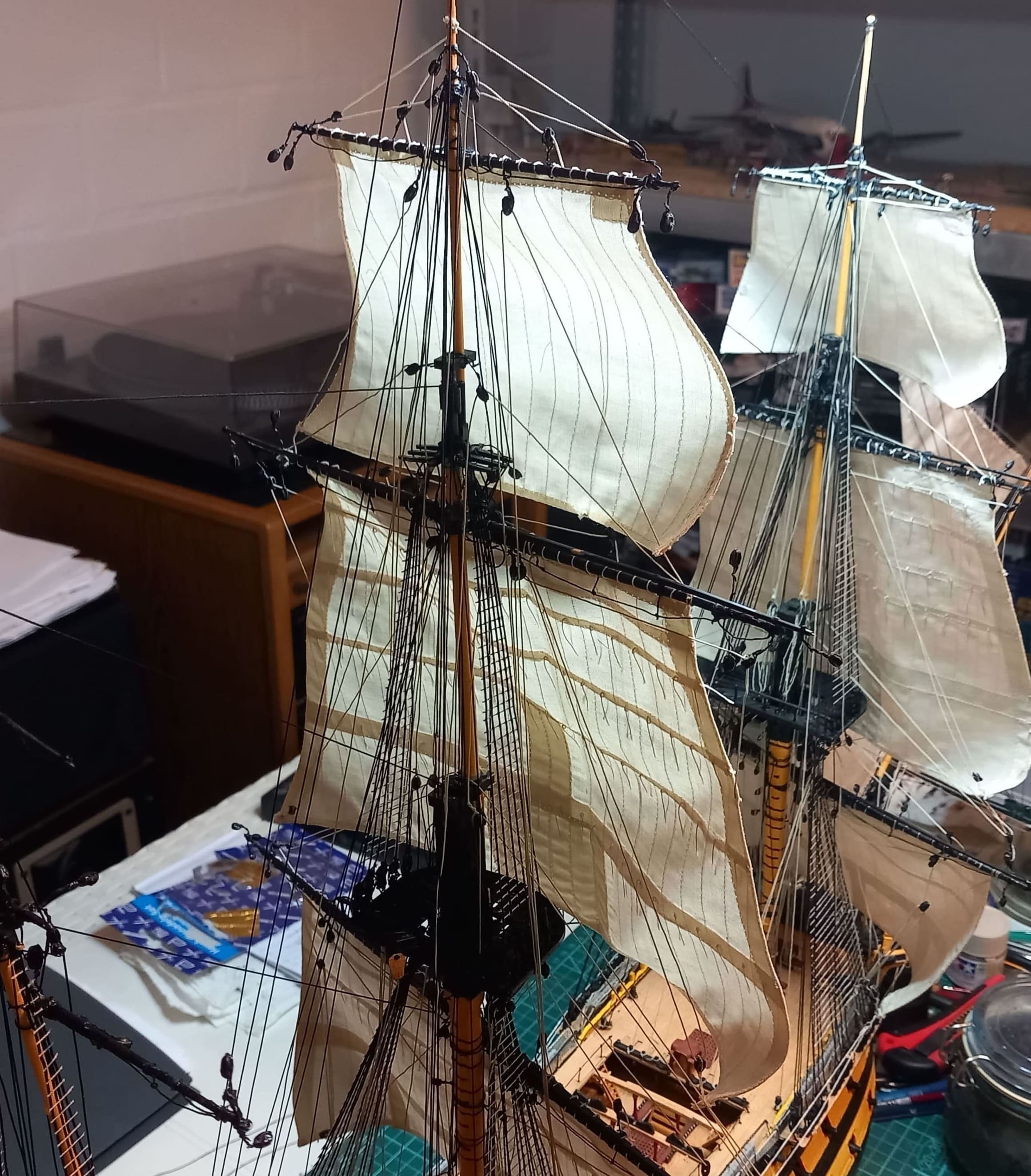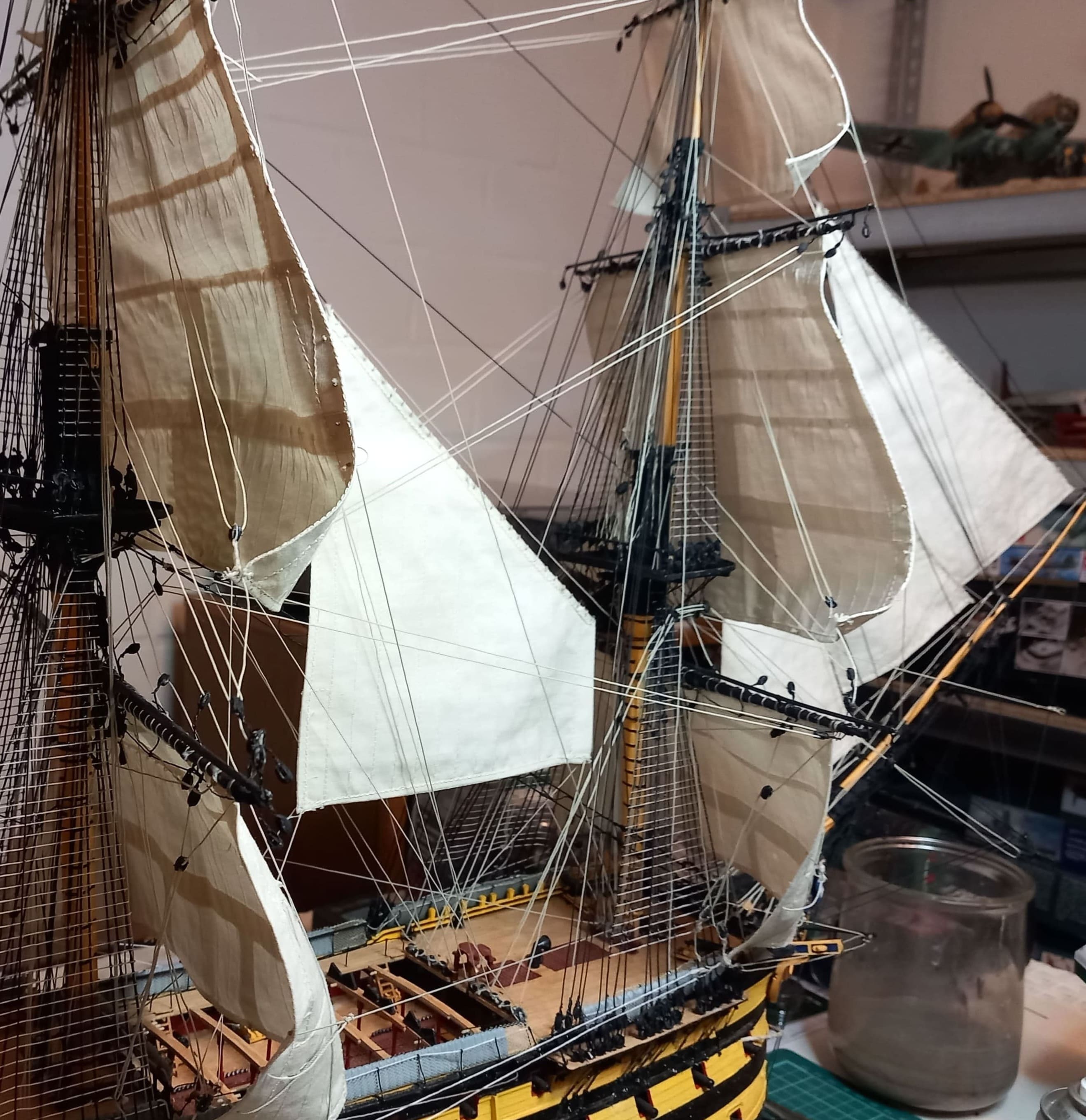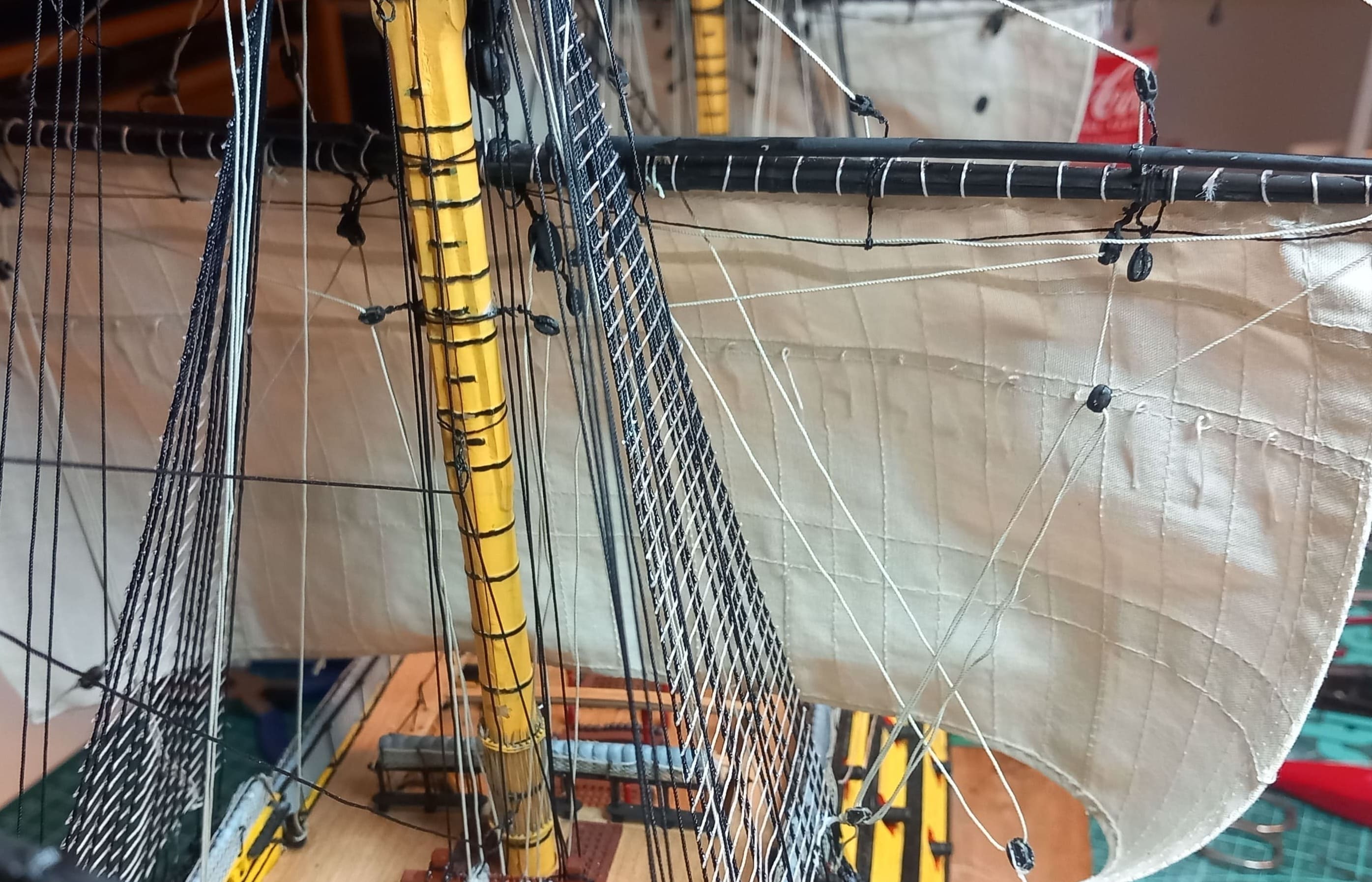 Danke für das Angebot, Daniel. Aber ich habe noch Blöcke genug, z.B. von der United States .Kreuzsegel und Kreuzbramsegel sind auch gesetzt. Die Taue sind gezogen. Jetzt habe ich in der original Anleitung gesehen, daß an der Hinterseite vom Hauptmast noch 6 Blöcke angebracht werden sollen. Ich frage mich warum das nicht bei der Vorbereitung des Hauptmastes aufgeführt ist. Jetzt ist das Anbringen der Blöcke alles andere als einfach. Taue und Wanten behindern das Anbringen.