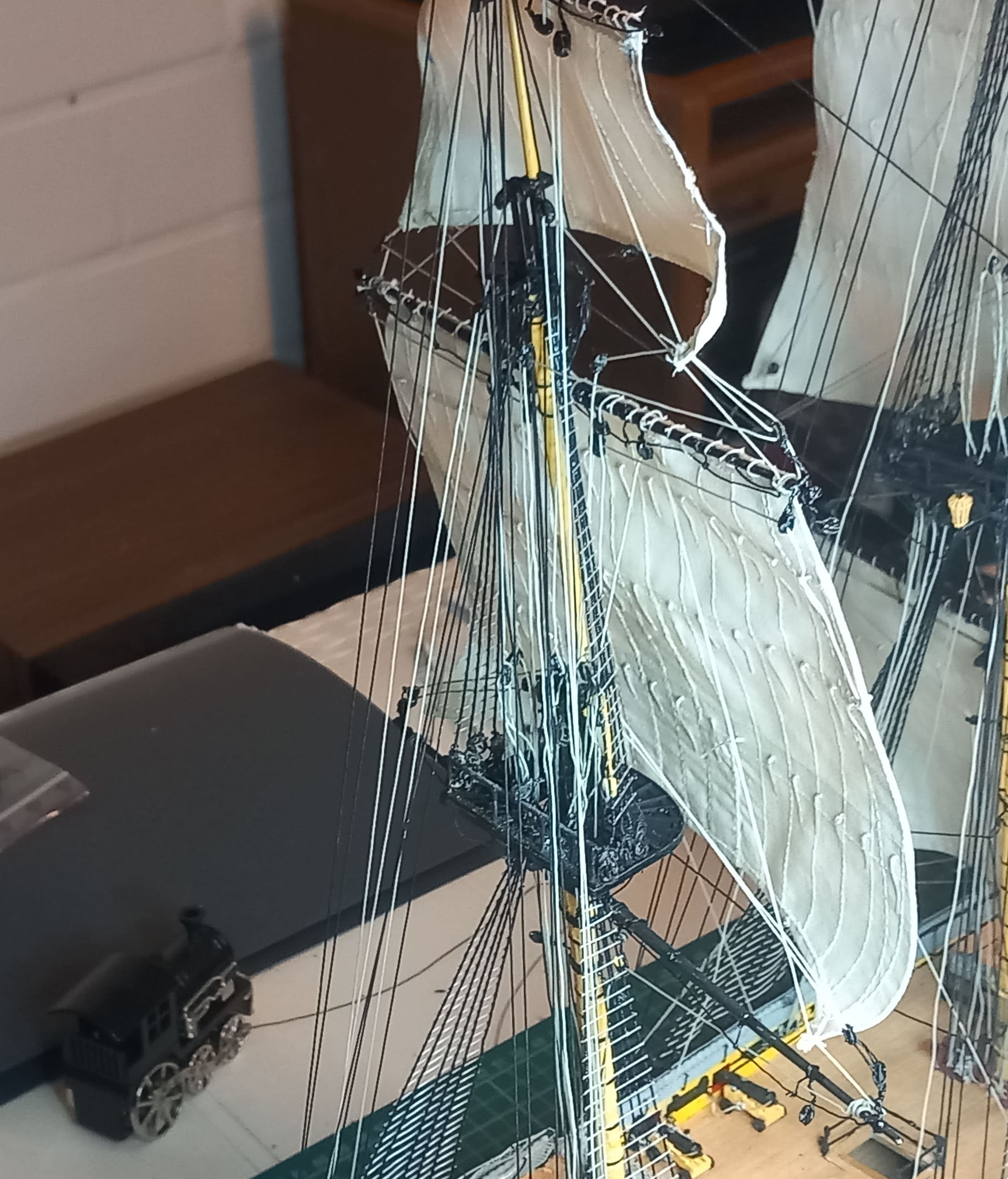 Es geht weiter. Großmarssegel und Großbramsegel sind gesetzt. Die Taue vor und hinter den Segeln sind gezogen. Das Großbramsegel (das obere) ist ein wenig zu groß geraten. Es geht etwas zu weit herunter aber ich lasse das gerade noch so durchgehen. Anfangs dachte ich das ich mich beim Abstand der Rahen zueinander vertan haben könnte. Aber das Nachmessen ergab, das der Abstand stimmt. Also kann es nur am Segel liegen. Das Kreuzbramsegel am Besan ist allerdings ca. 2 cm zu breit. Meine Schwester kann das zum Glück einkürzen und umnähen. Ansonsten gefallen mir die Segel sehr gut.