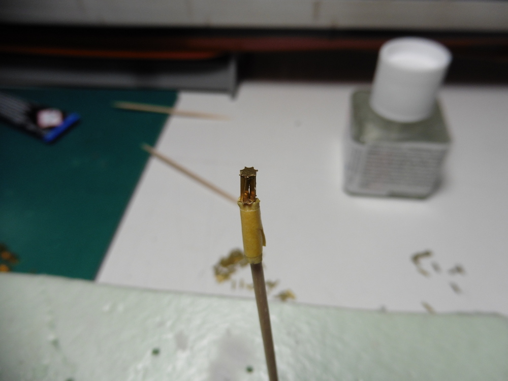 Wie man sieht .. ein haufen Einzelteile. Es mußte die Ummantelung gebogen werden . Hierfür durfte der Zahnstocher mal wieder herhalten , da der Radius fast Optimal passte . Dann hat man einen kleinen Stern auf dem die Platten aufgeklebt werden mussten . Hierfür ahbe ich mir einen Zahnstocher genommen und die Spitze abgeschnitten . Damit das händelbar ist habe ich doppelseitiges Klebeband auf den Zahnstocher geklebt . Auf diesen kleinen Punkt konnte ich dann den Stern befestigen und hatte dann den Zahnstocher in ein Stück Styropur gesteckt . Dann konnte ich die Platten nach und nach aufkleben und so die Munitionsfächer erstellen . Das Ganze hat ca 10 Std in anspruch genommen.