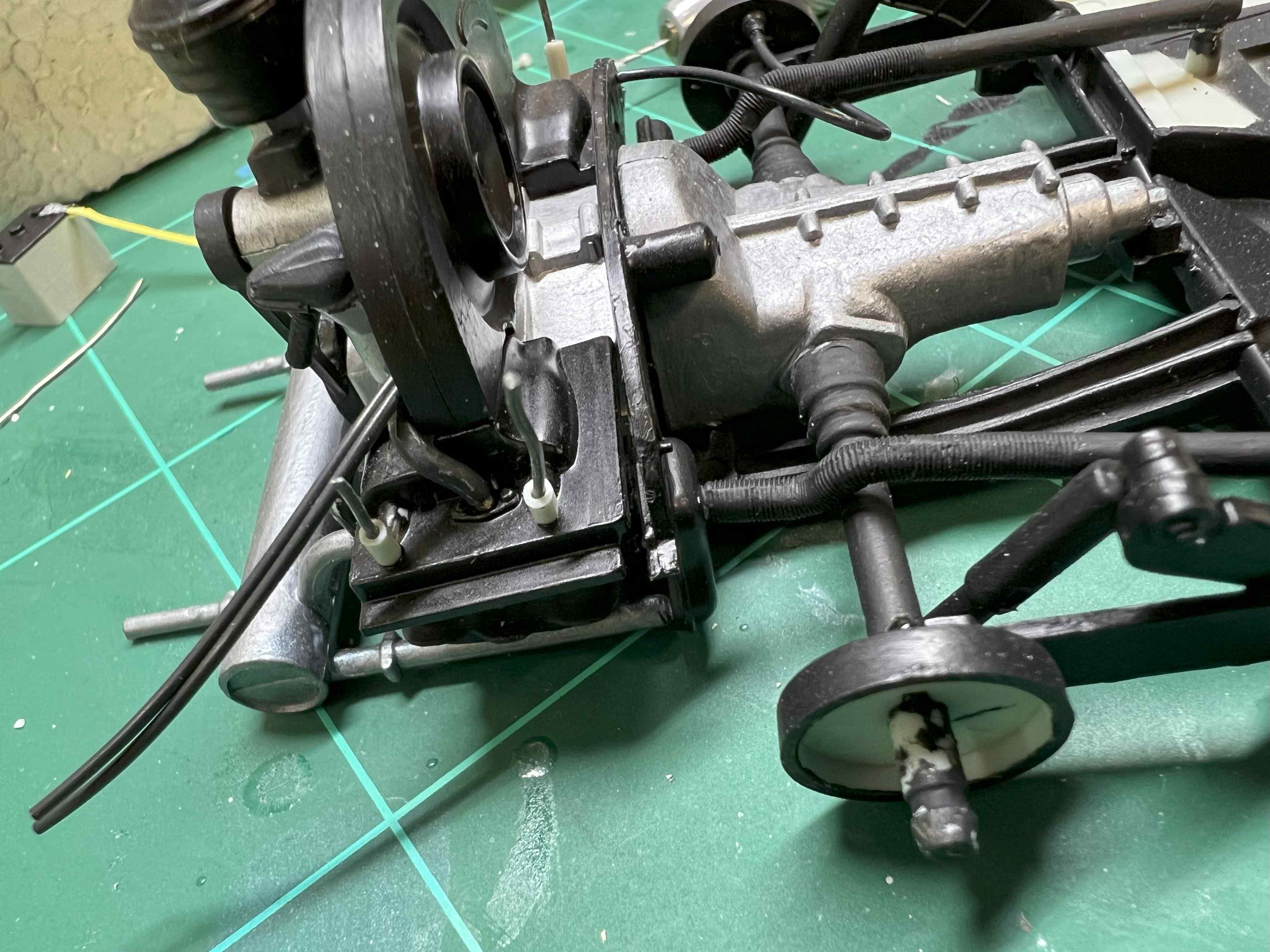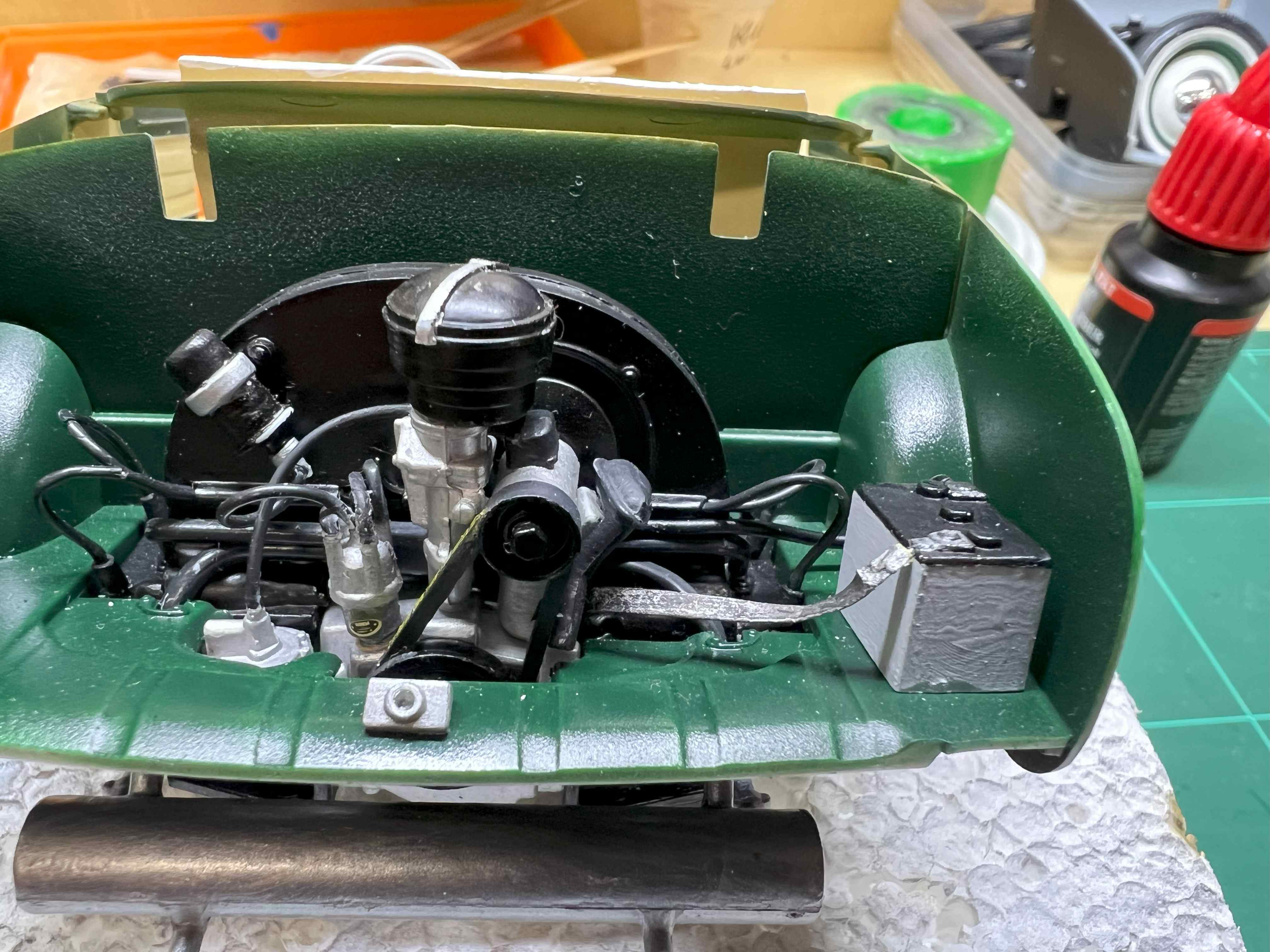 So wie ich auf einigen Fotos vom Original gesehen haben, ist die Batterie mit dem Minuspol über ein Flachband mit dem Motor verbunden und gar nicht auf der Karosserie. Dann habe ich auch noch eine Leitung für den Pluspol spendiert.