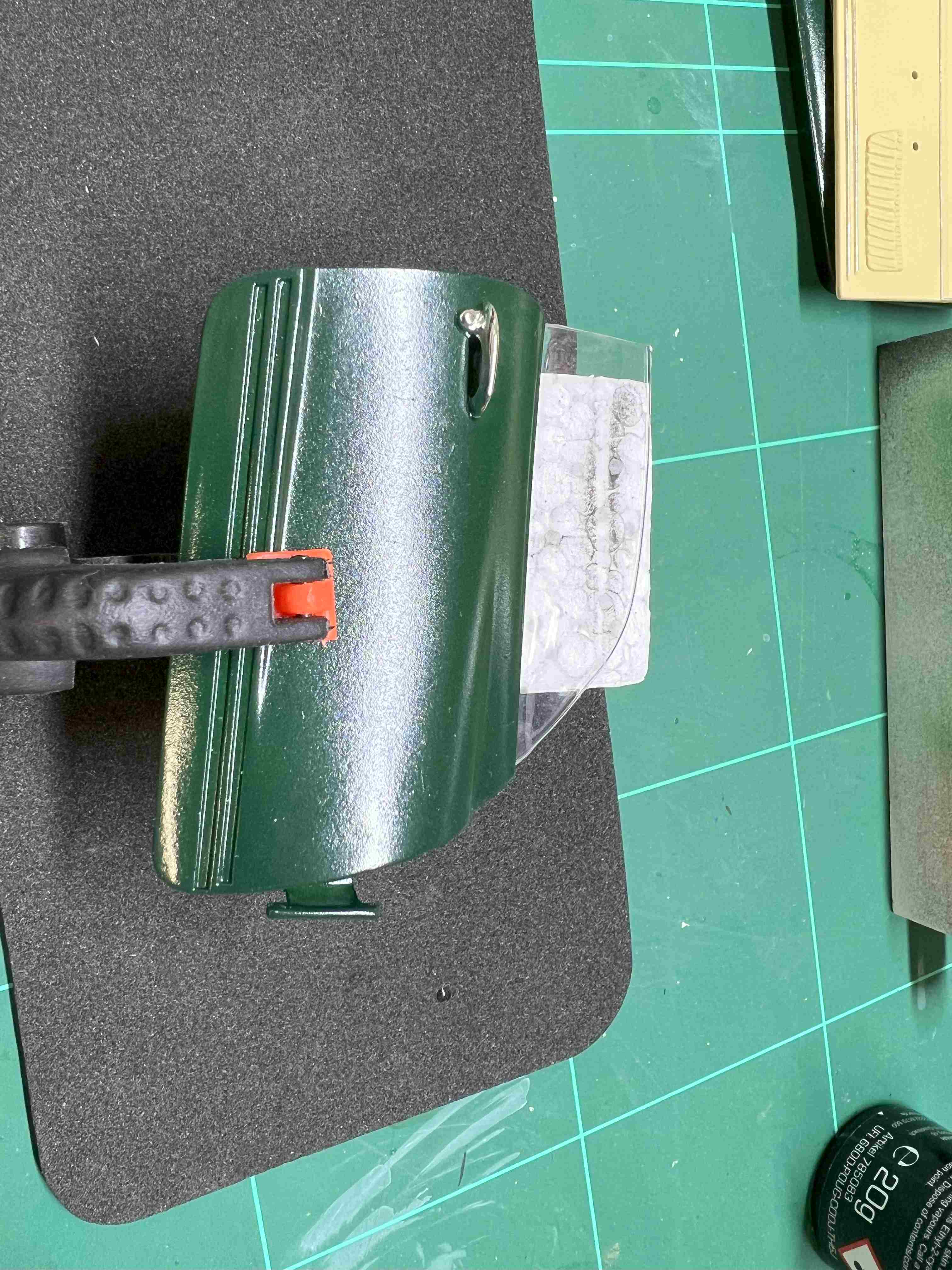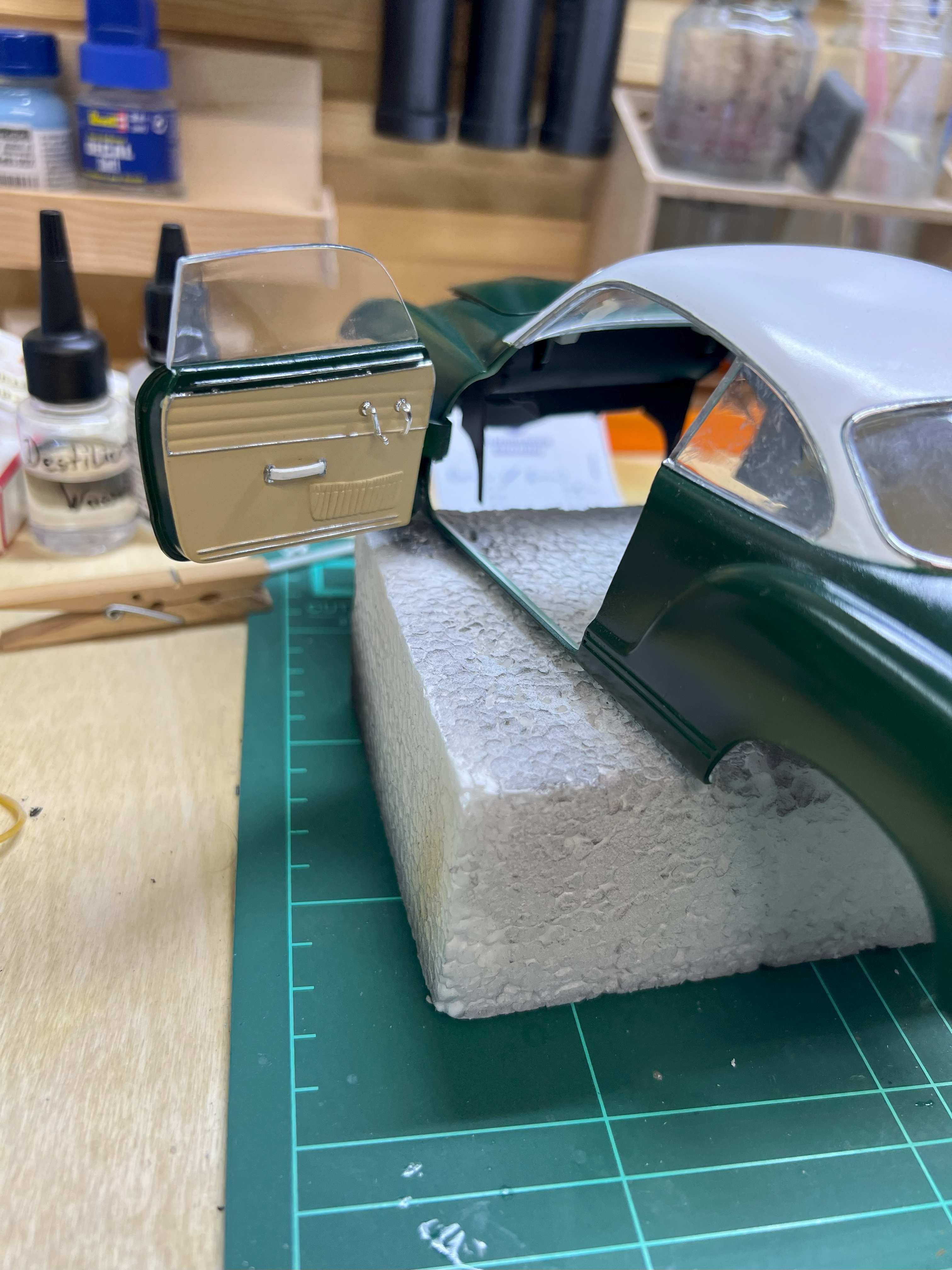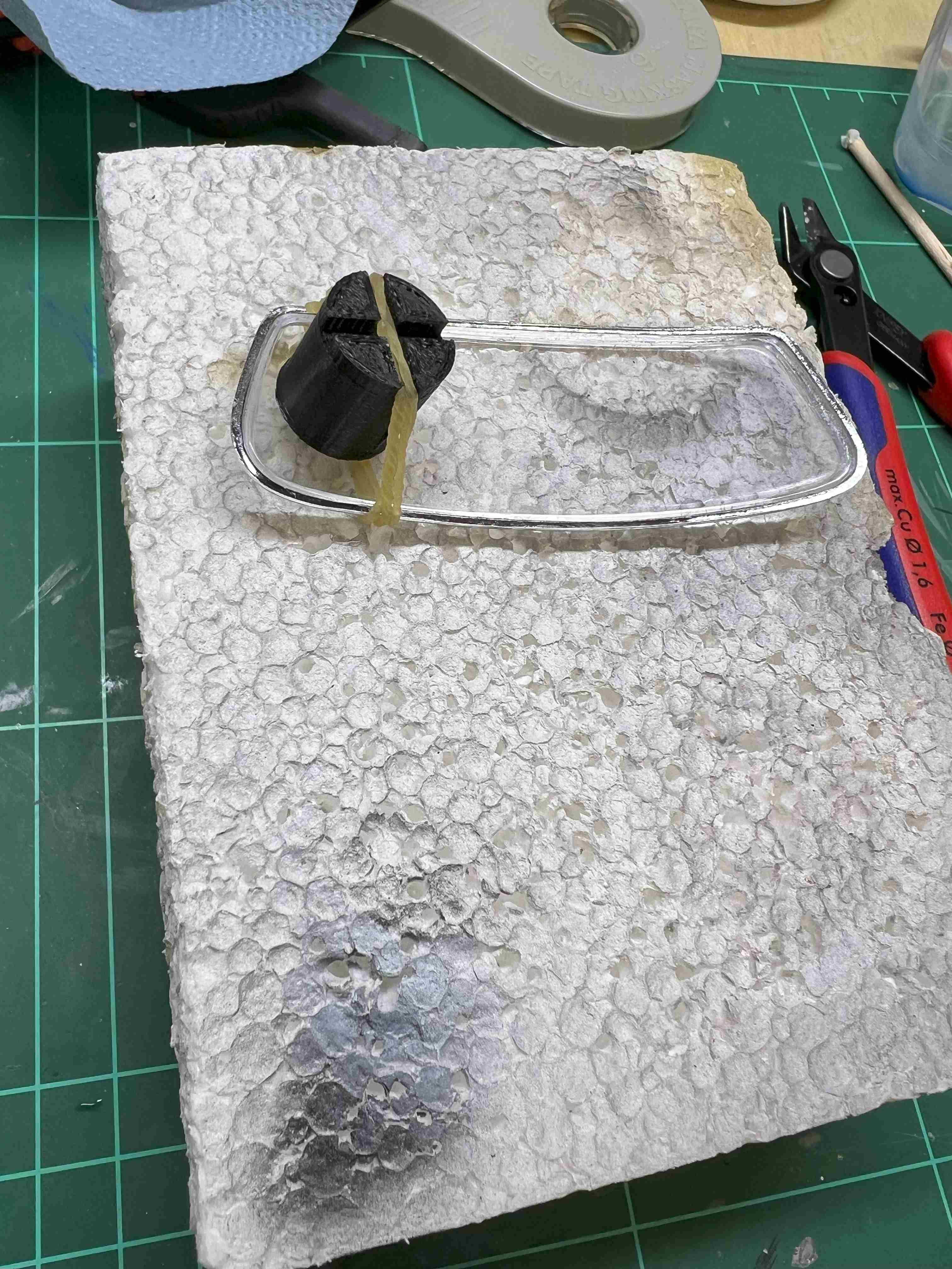 Die Fenster mussten in die Chromrahmen geklebt werden. Ich mache das mit Revells Contacta Clear, verdünnter Weißleim würde auch gehen. Mit ein bisschen Zwang hat das auch ganz gut geklappt. dafür musste ich mir aber auch wieder eine Hilfe mit meinem 3D Drucker herstellen.
