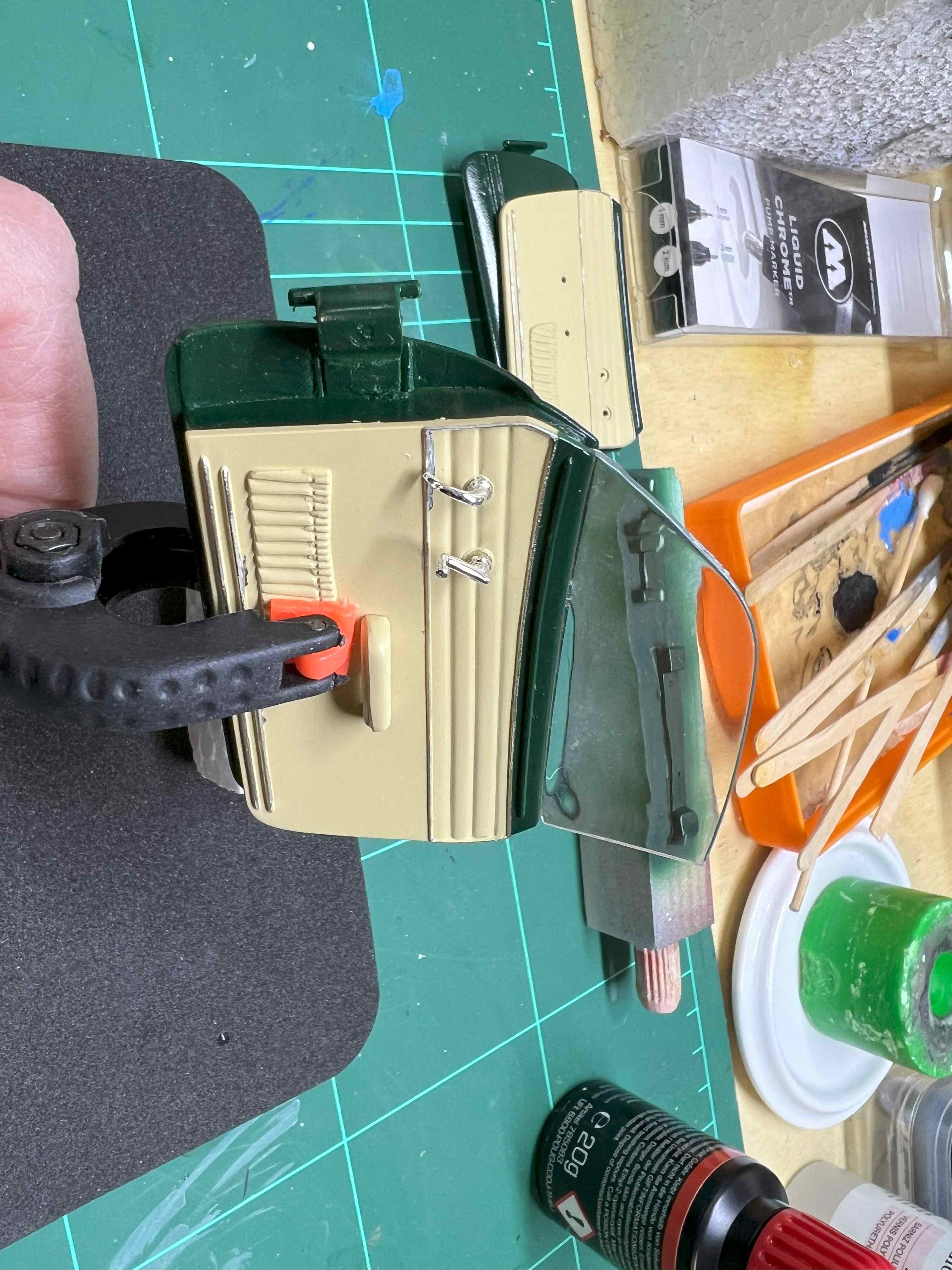 Die Chromzierleisten auf der Innenseite habe ich wieder mit einem Chrom-Schüttel-Marker (1mm) aufgetragen. Jedenfalls so lange, bis auf einmal ohne großes Zutun meinerseits ein dicker Tropfen von dem Chrom auf die Tür lief.