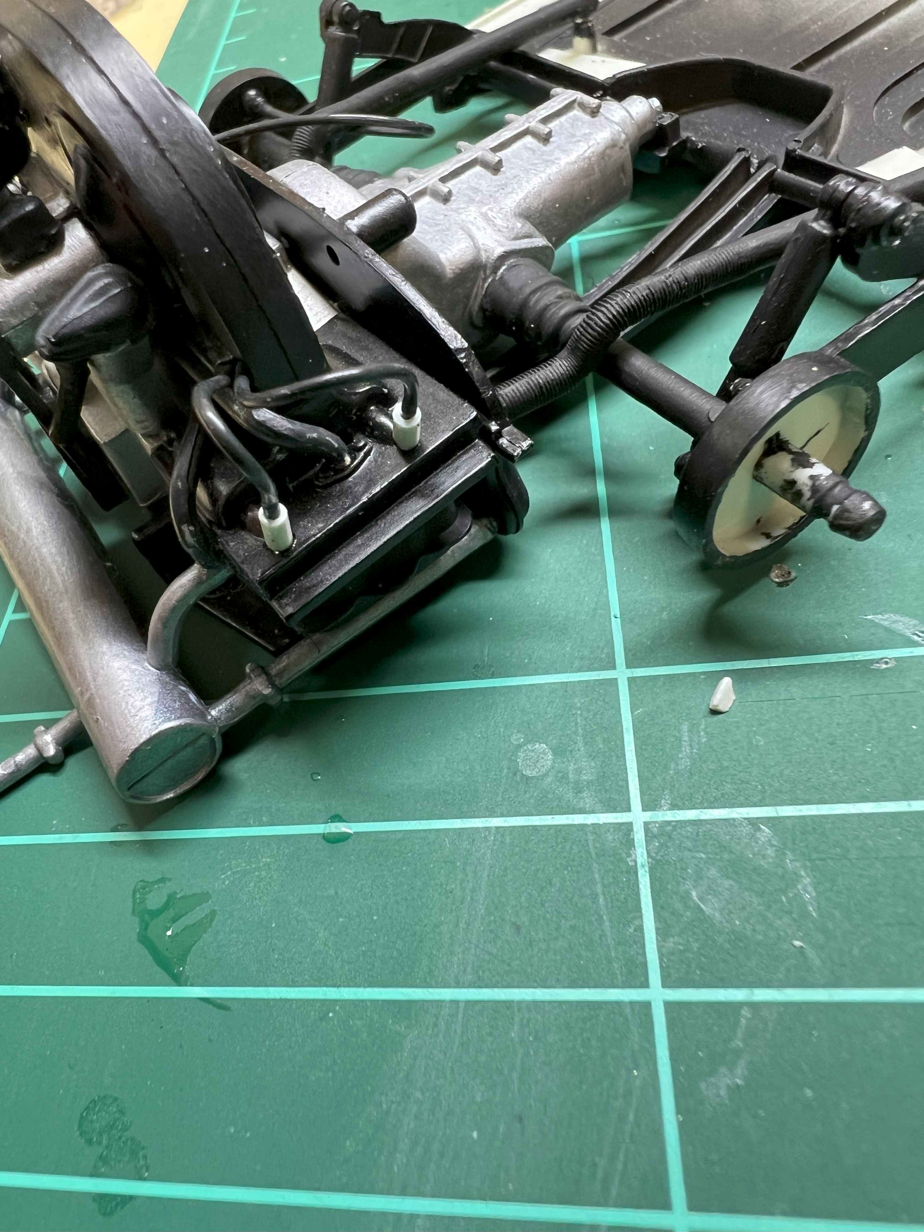 Laut Bauanleitung waren nur Leitungen vom Zündverteiler weg dargestellt, aber wo diese Enden sollen, darüber schweigt sich die Anleitung aus. Also habe ich auch hier versucht an Hand von Fotos aus dem Internet zu erkennen, wo die Leitungen hingehen sollen (bin ja schließlich kein KFZ-Mechaniker).