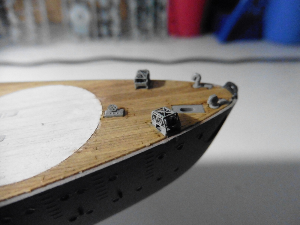 Nach Bauplan wurde nun mit dem Deck und seinen Aufbauten begonnen. Hier wollten diverse Poller Aufbauten und Luken etc verbaut werden .